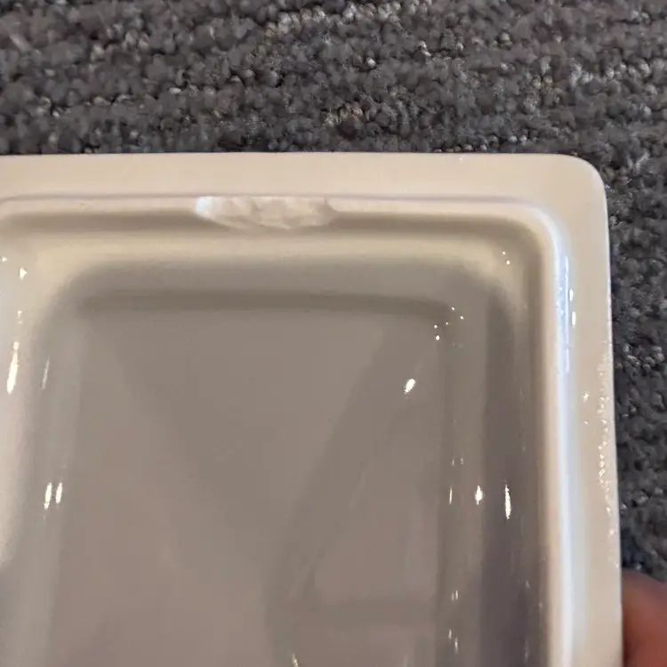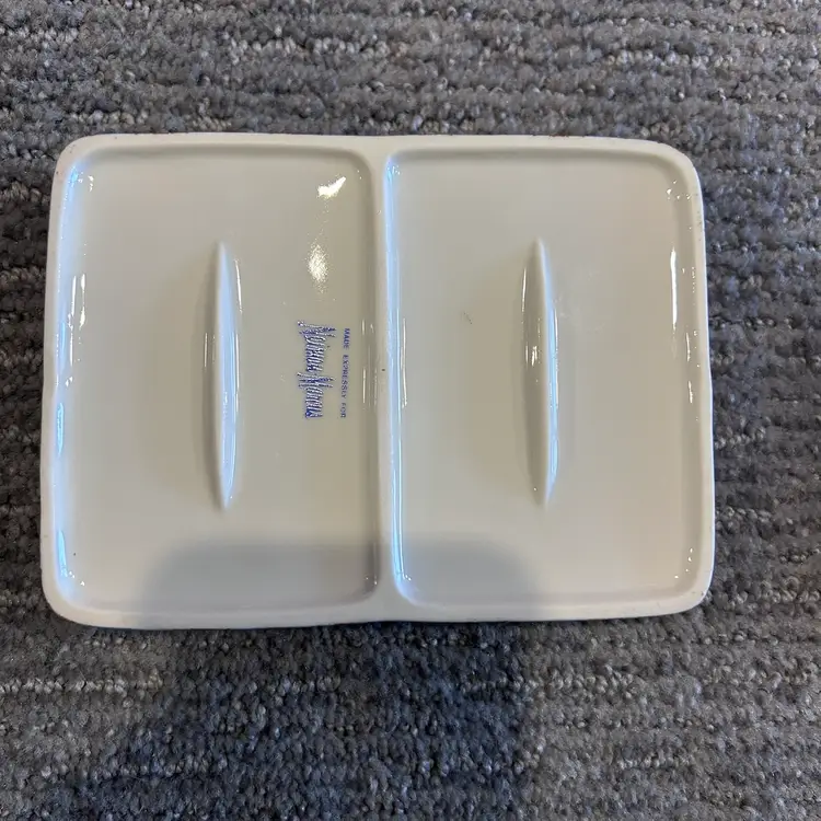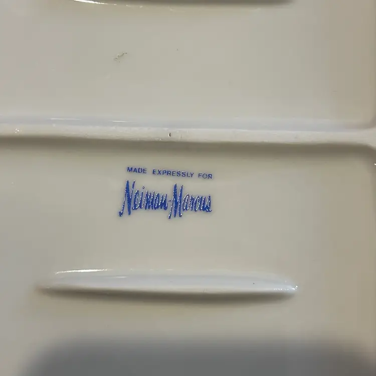 Beautiful and elegant Neiman-Marcus playing card holder or trinket dish with lid. Blue, white, green and reddish-orange colored design with gold tone lid handle. Cards not included. Interior lid has small chip. Please see photos. As is. 5.5 inches long 4 inches wide x 3 inches tall including lid handle.