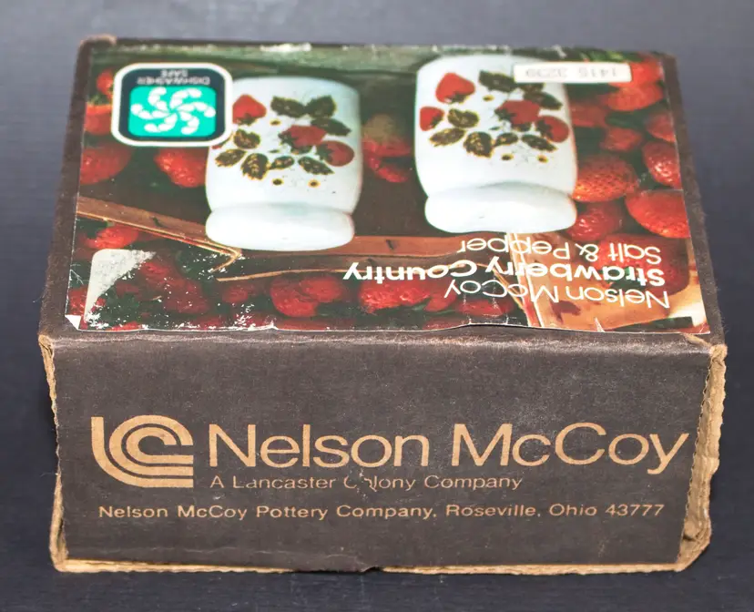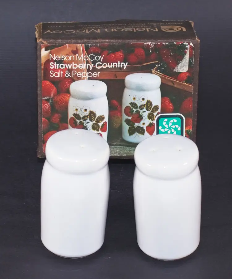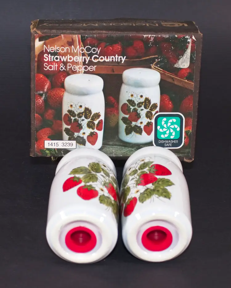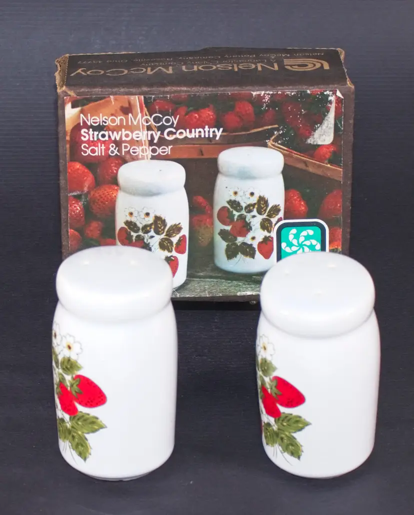 Vintage Nelson McCoy Pottery Strawberry Country Salt & Pepper Shakers w/Original Box. Shakers are in good condition. Box has some condition issues but is basically intact. Shakers measure 1.75" diameter x 3.75" tall