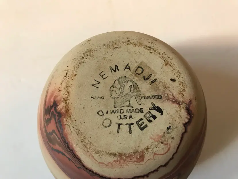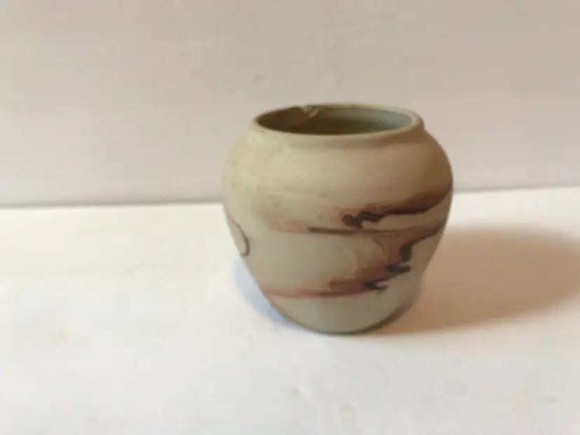 a height of 3 inches, it is a small but eye-catching piece. The vase features a beautiful orange and multicolor clay swirl pattern, handmade with the traditional pottery. It is perfect for displaying flowers or as a decorative piece in any room. Small chip on rim see pictures