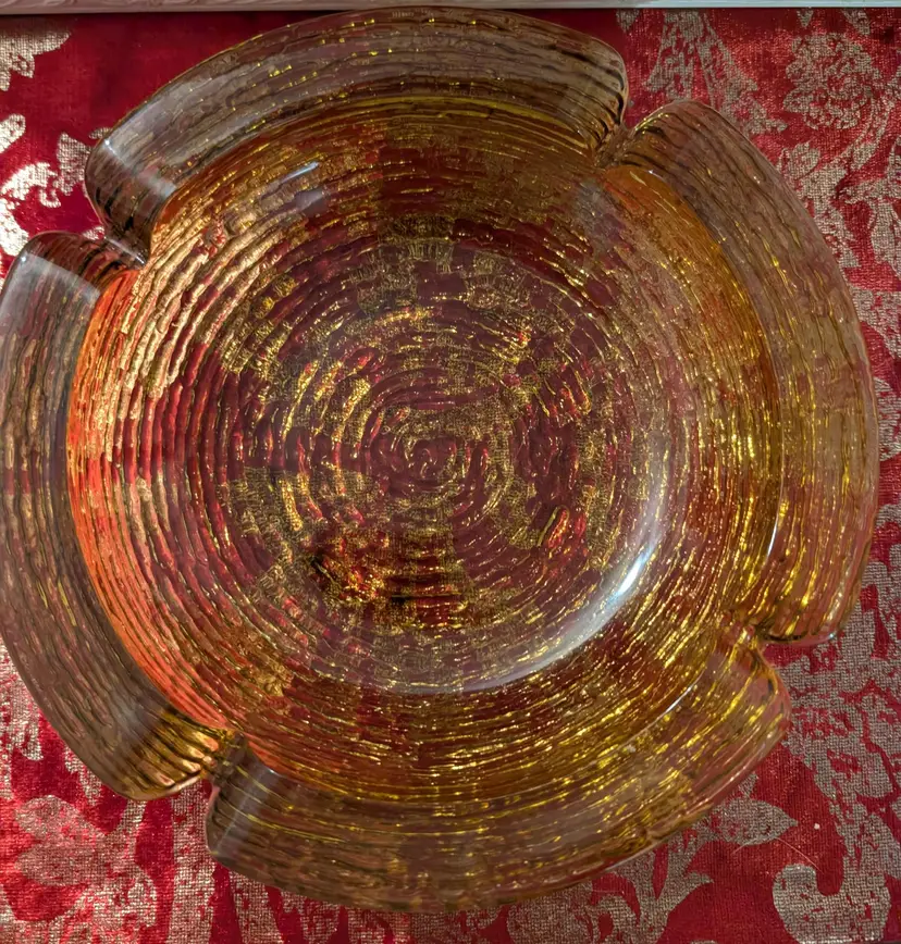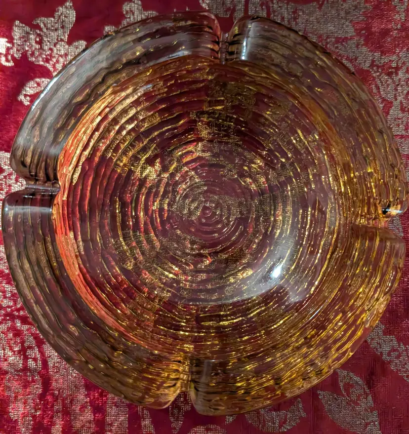 Stunning vintage Nesting Anchor Hocking Soreno amber glass ashtray set featuring a unique ribbed design. These pieces are used but in excellent condition with no cracks or chips. The warm amber hue adds a touch of retro charm to any space. Perfect for collectors or as a stylish decor piece. Large ashtray measures approximately 9 inches diameter and 2 inches in height and weight approximately 1.6 lb. The small ashtray is approximately 6 inches diameter with a 1.5 inch height and weight is approximately 0.7 oz A classic addition to any vintage glass collection.