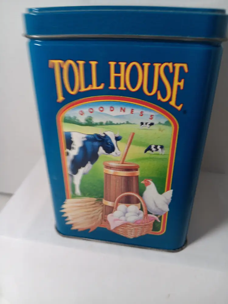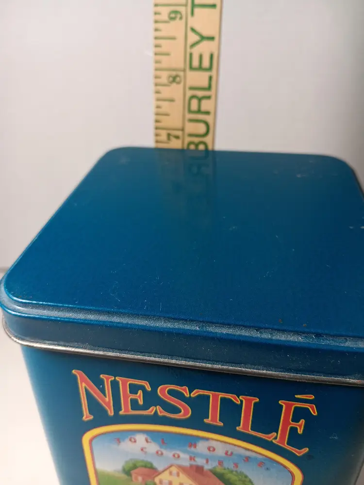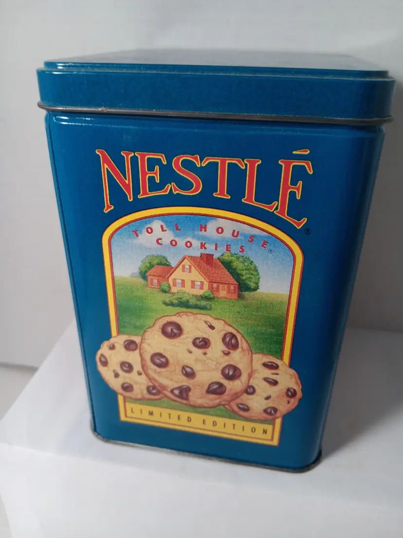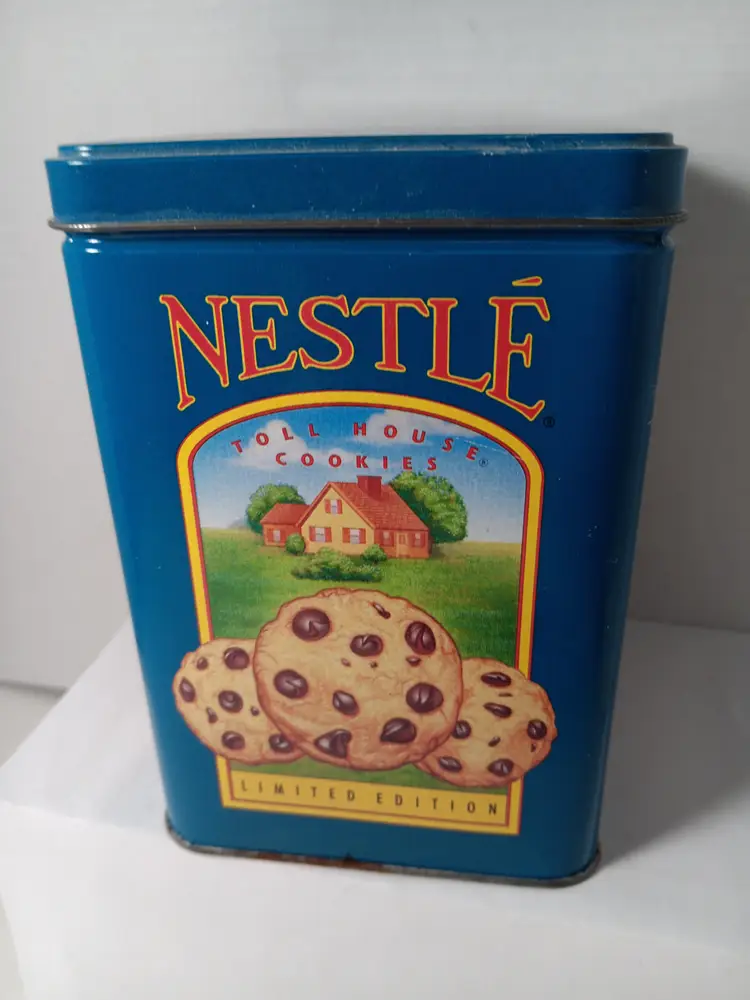 Collectible limited edition blue tin featuring the classic Nestle Toll House Cookies design, perfect for storage or decor.