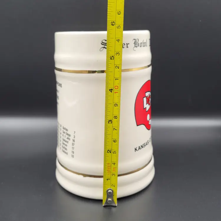 Vintage Beer Stein celebrating the Kansas city Chiefs Super Bowl Championship IV. One side has the Chiefs Logo, with Super Bowl IV Champions across the top, the opposite side has the Season Record and Scores. It is in excellant condition, no chips or cracks. Measures approximately 5.75 inches tall, opening is 3 inches in diameter and 5.25 inches wide with handle. Thank you for looking and have a great day!