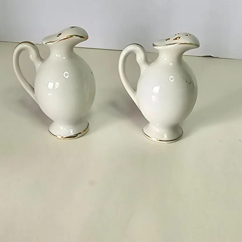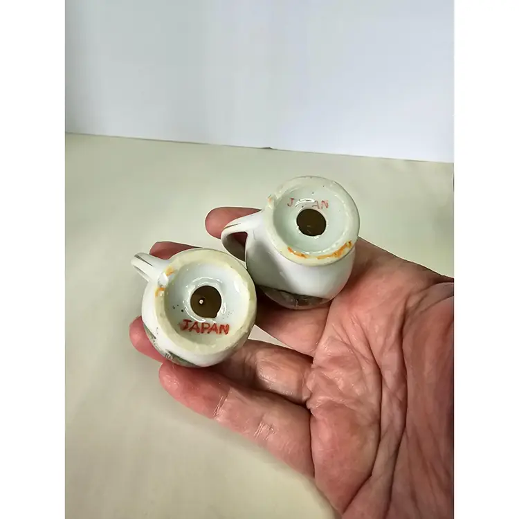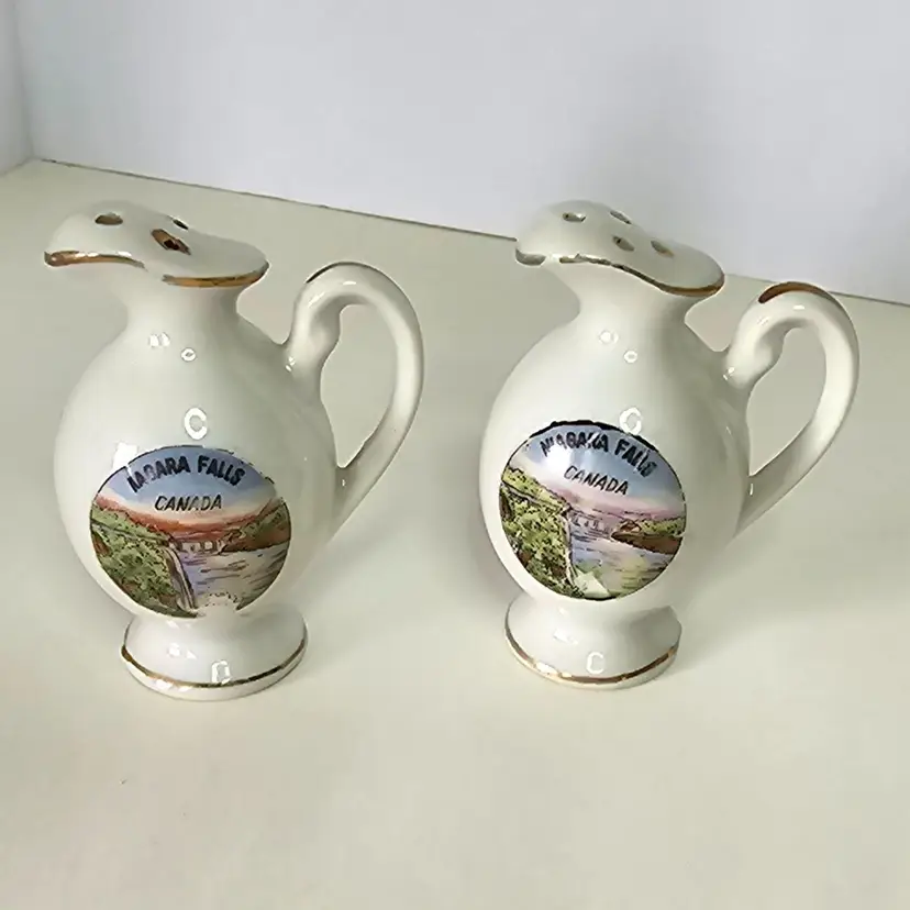 Vintage Shaker set featuring Niagara Falls Canada. They measure 2.5" tall x 2" wide. Some of the gold paint is worn in spots. One tiny chip on the bottom of one Shaker. No stoppers. Marked Japan