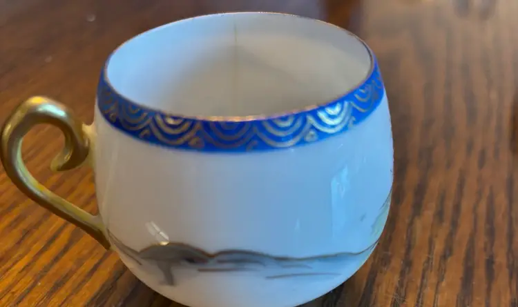 Elegant cup with blue and gold trim. Features a scenic design. Perfect for tea lovers or collectors.