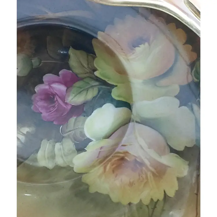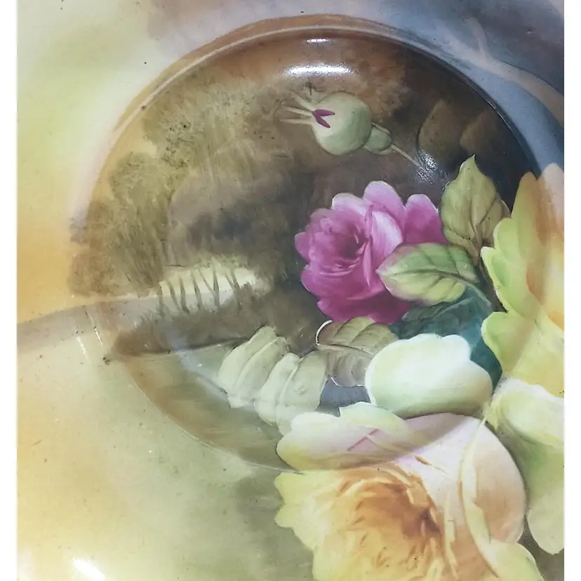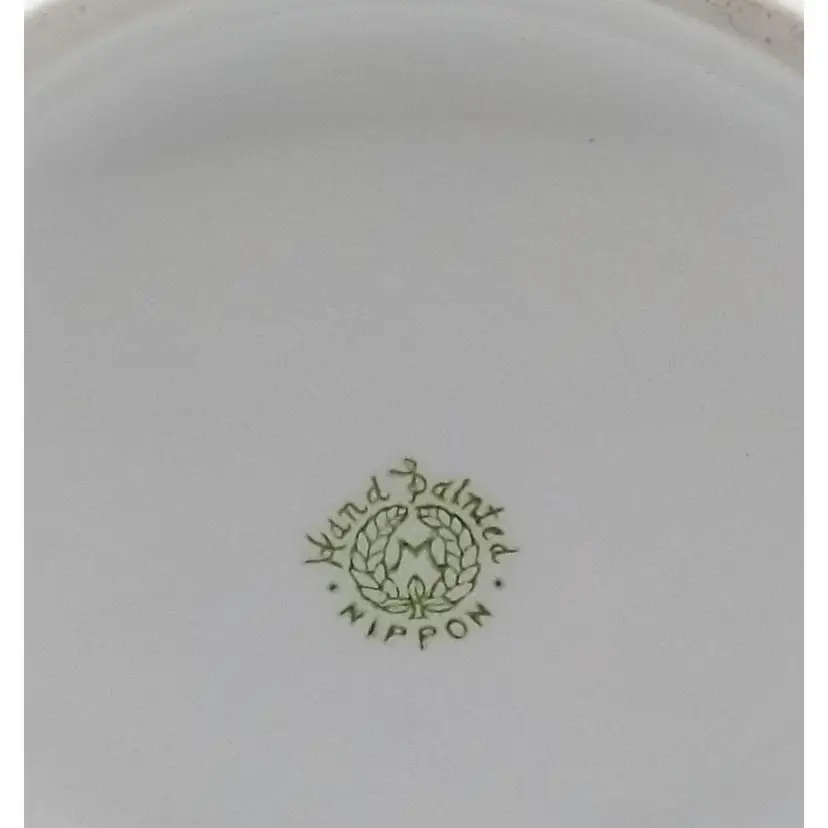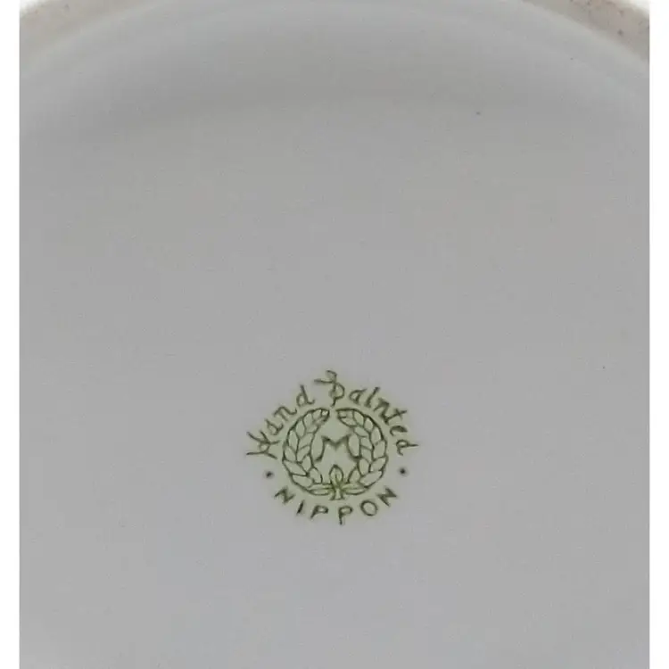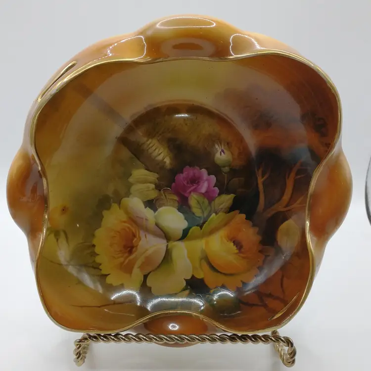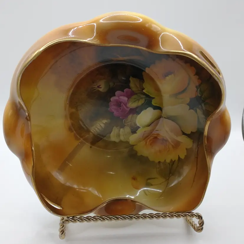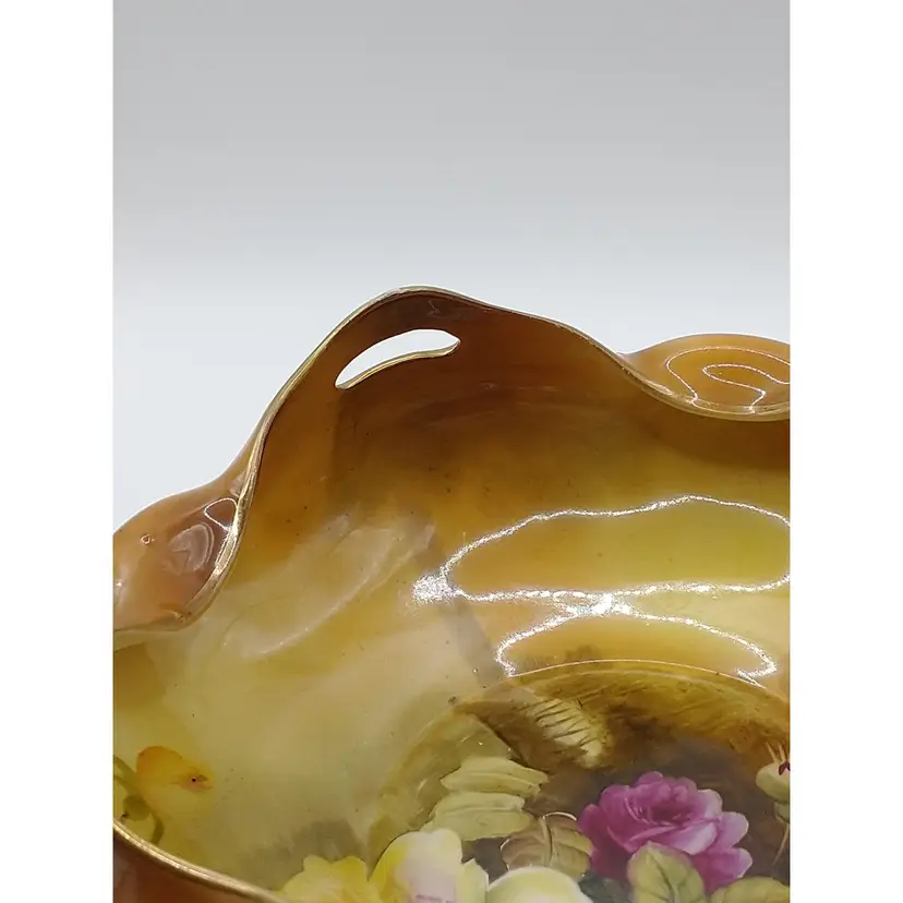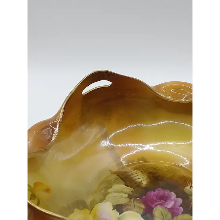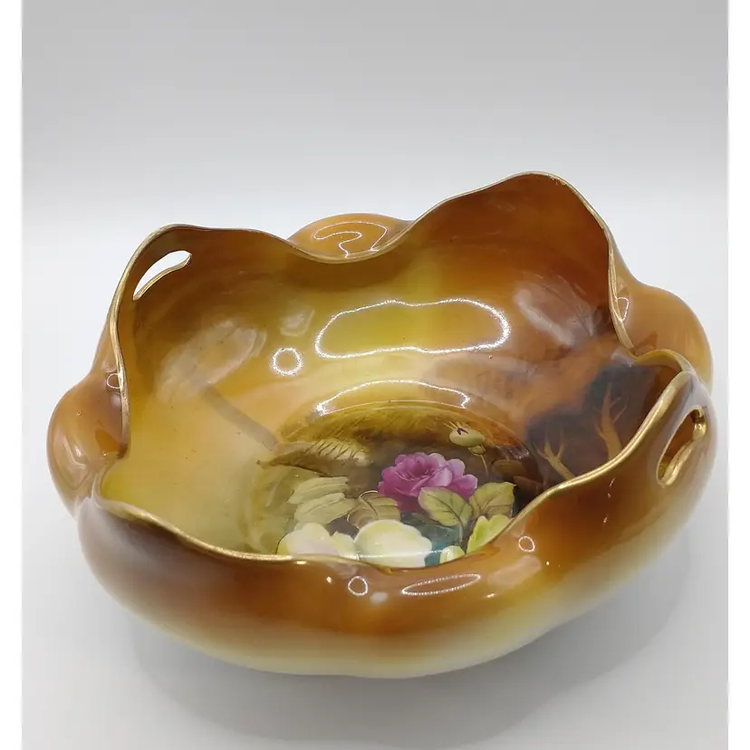 This beautiful vintage Nippon bowl features two handles and the bowl is fluted. The bowl has shades of brown with gold and pink flowers and trees in the background. This Nippon piece is made of porcelain and is trimmed in gold. The bowl is 8" wide and 2 1/4" tall. There are no chips or cracks on this piece and it is absolutely stunning. I have taken photos from all angles but if you need additional ones, please let me know.
