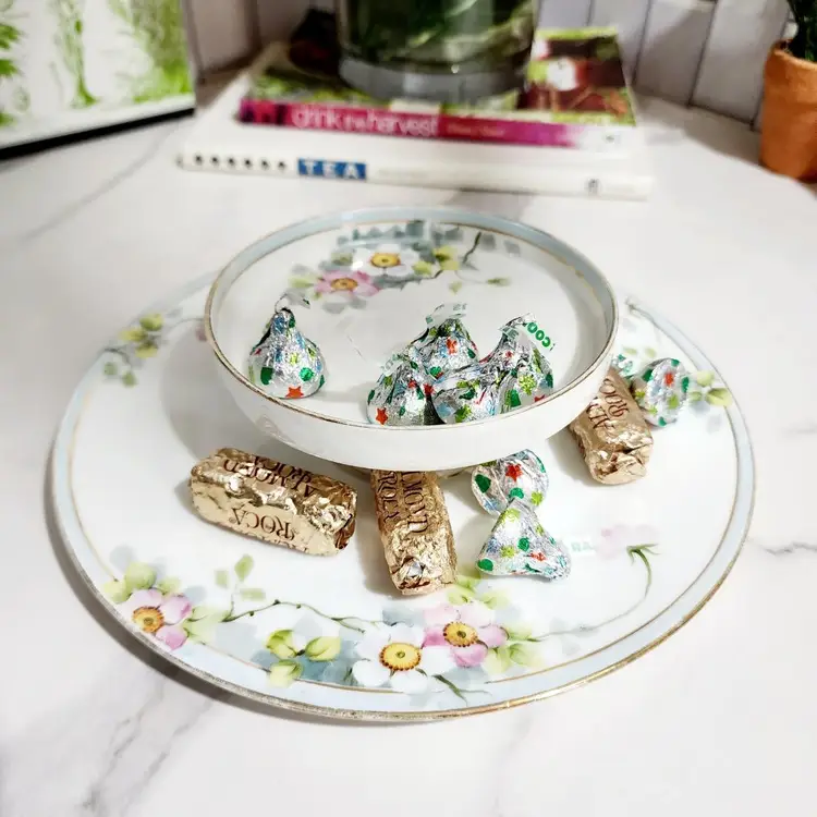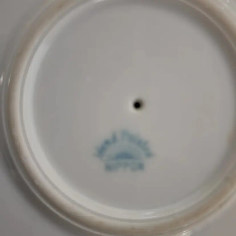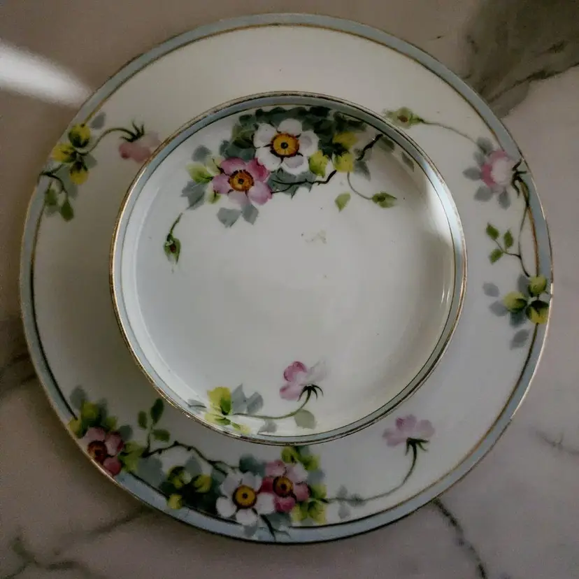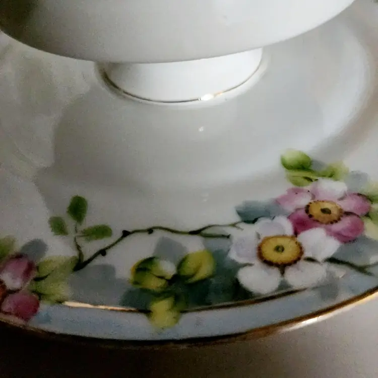 Super Cute 2 tier dish. Gold trim. Handpainted Baby Blue Trim. White, Pink & Yellow Flowers. Made by Nippon Condition: Used. No chips or cracks. Slight Fading.