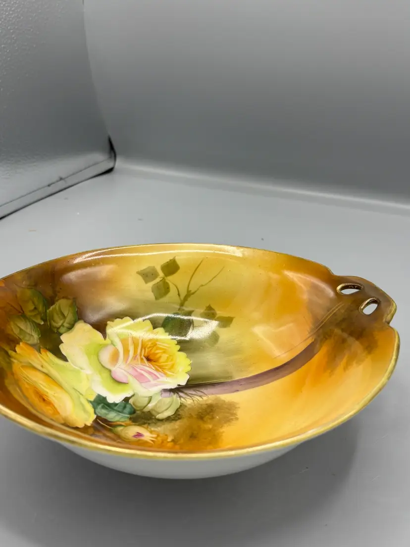 A stunning piece of Japanese porcelain artistry, this vintage Nippon rose bowl showcases delicate hand-painted florals enhanced with gilded accents. The generous 8 3/4-inch diameter and 2 3/8-inch depth make it ideal for displaying cut roses or serving as a decorative centerpiece. Each brushstroke reflects the craftsmanship of early 20th-century Nippon porcelain makers, bringing timeless elegance to any collection or home décor.
