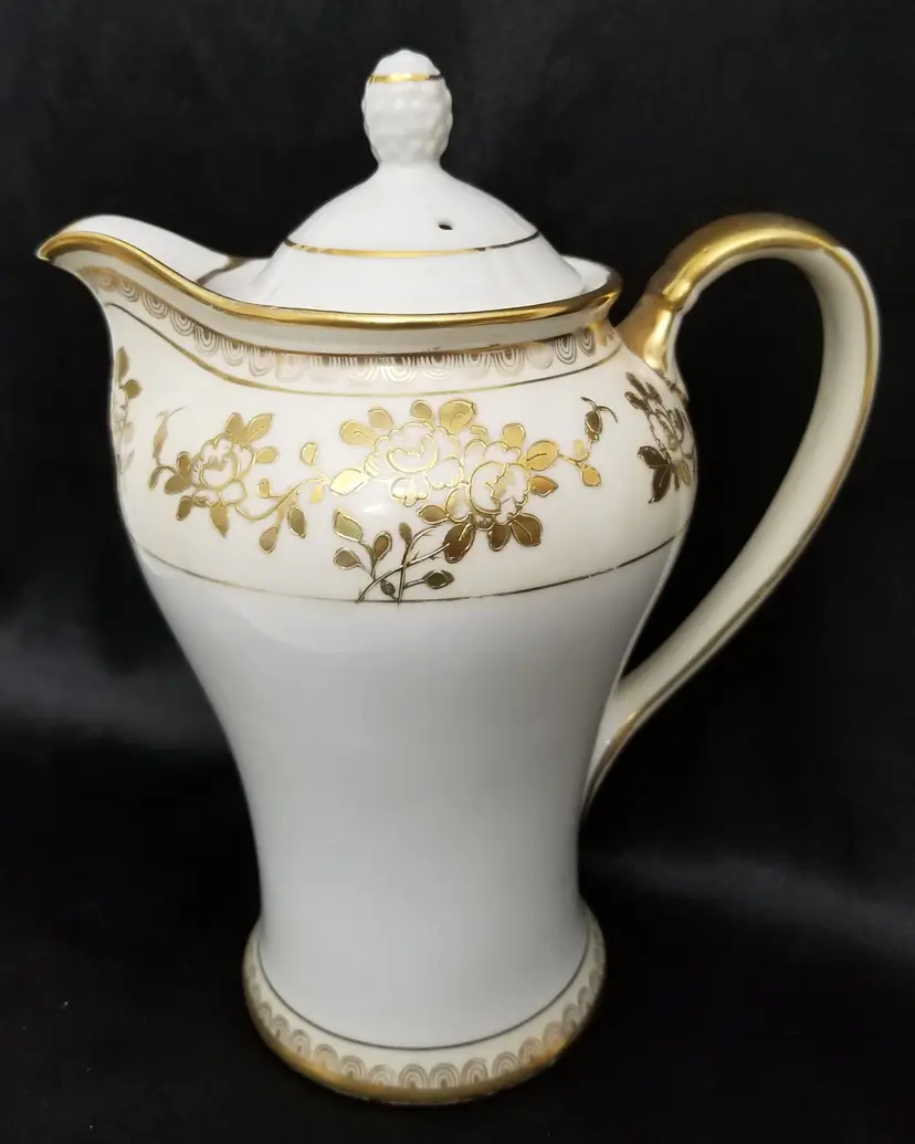 Vintage Nippon Komura Hand-Painted Gold Tea Set is hand-painted florals in gold with scrolled bands top and bottom. The teapot is 7 3/4" tall, excluding the lid (the lid does not look original to me) and the cup & saucer sets are 2 3/4" tall. There are two cup & saucer sets with the teapot. There is slight wear to the gold trim as expected for its age. No chips, cracks or repairs. Please view the pictures and feel free to ask questions. Thank you for visiting my shop.