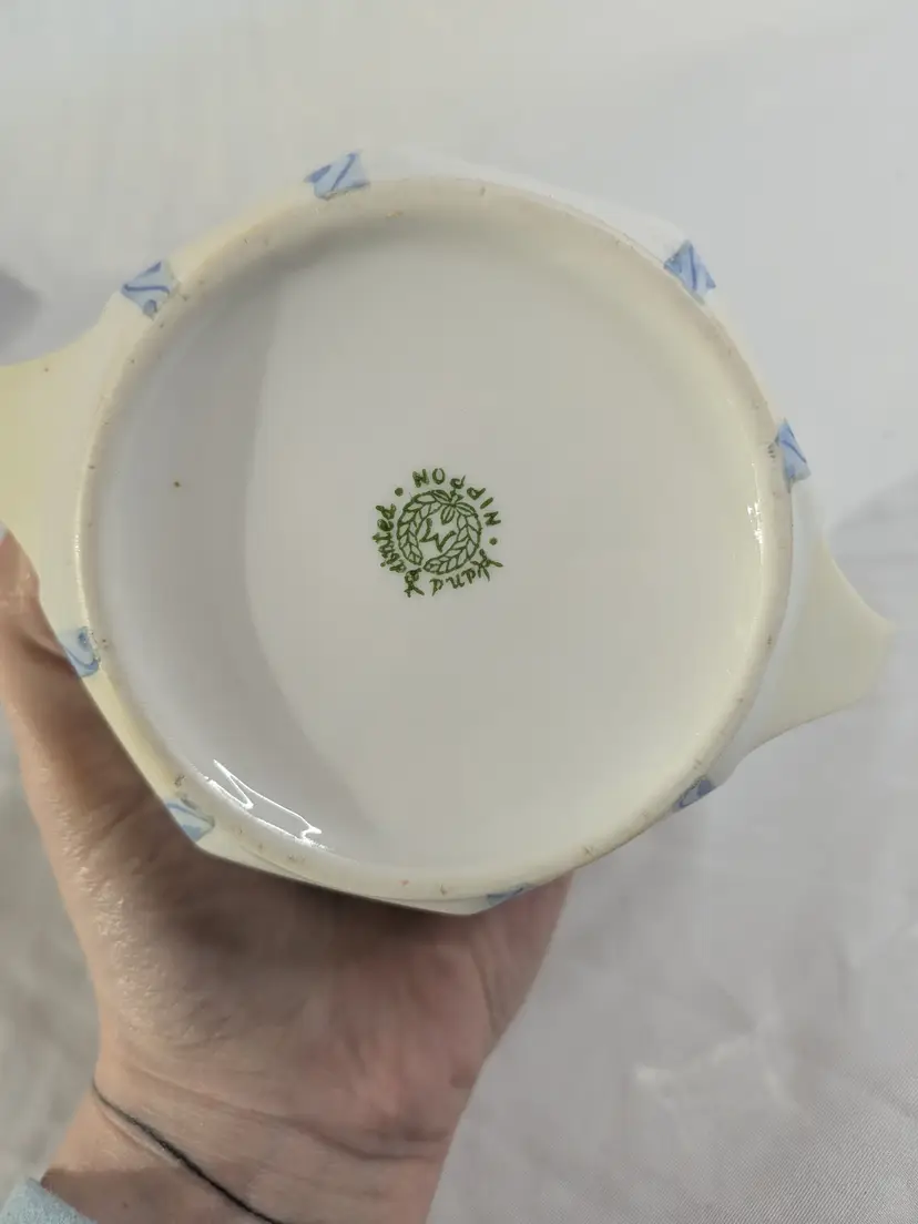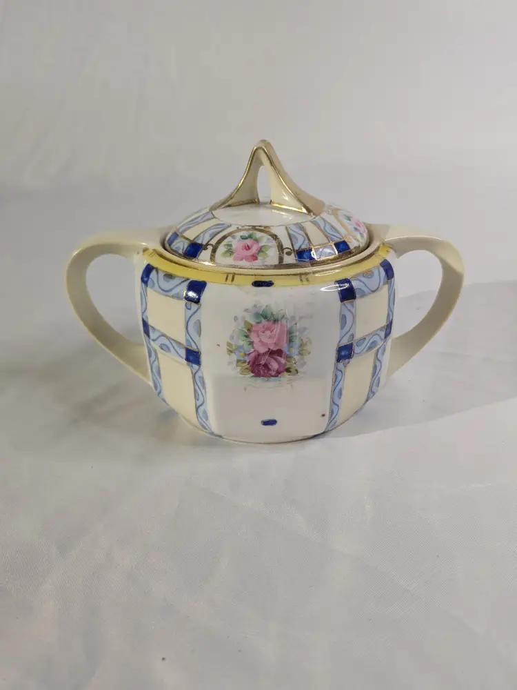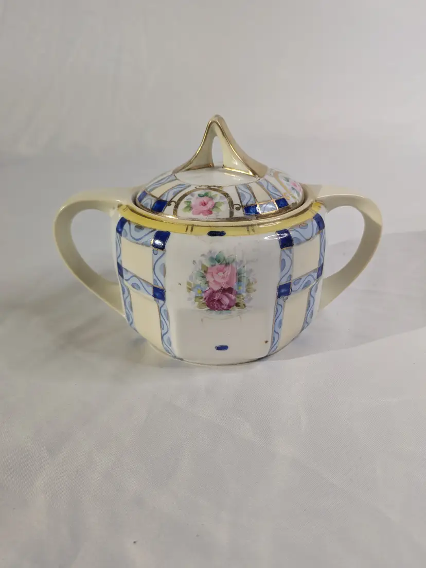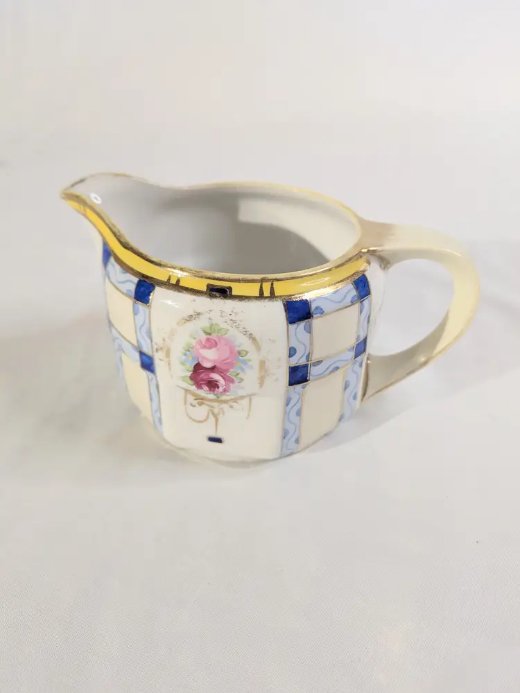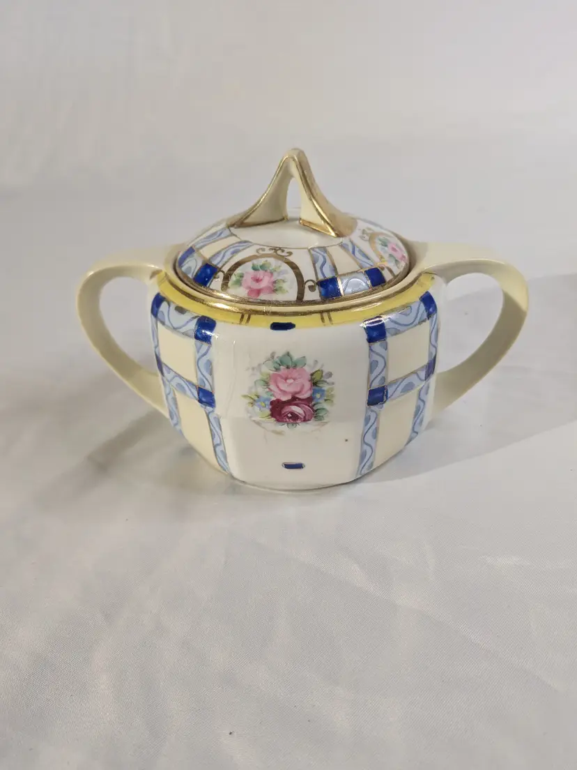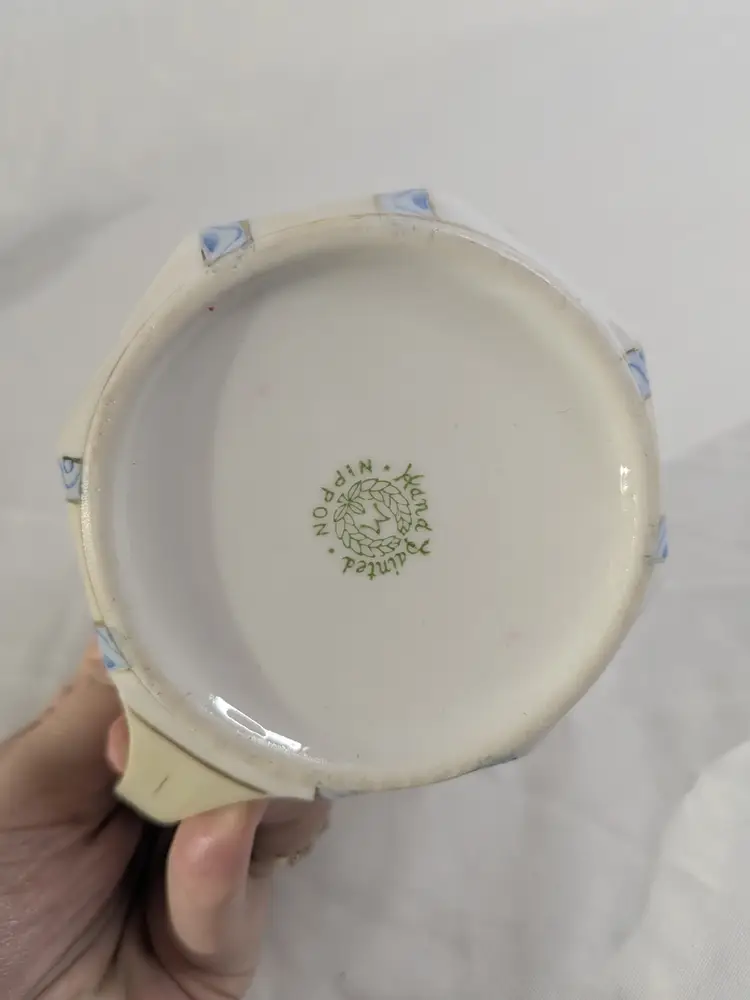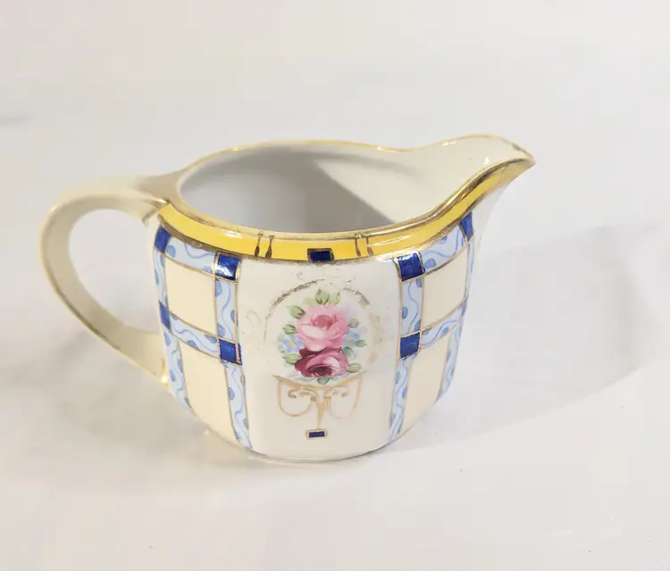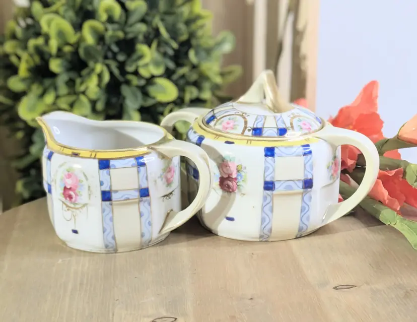 This vintage Nippon porcelain set includes a creamer and sugar bowl, both adorned with hand-painted flowers. The set originates from Japan and features a matte finish. The items measure 6.25 inches in length, 4.5 inches in height, and 3.5 inches in width, weighing 1 lb. The set is composed of two pieces and is considered handmade.