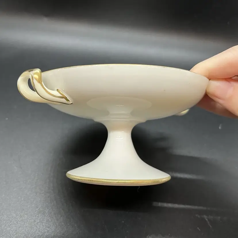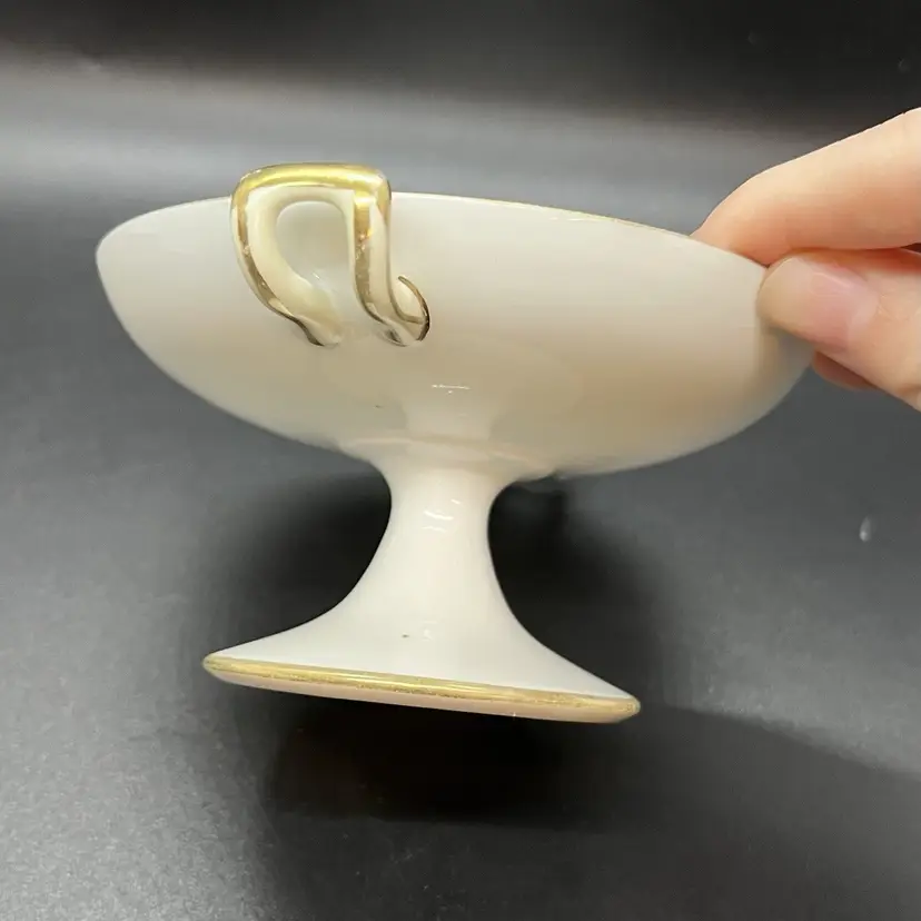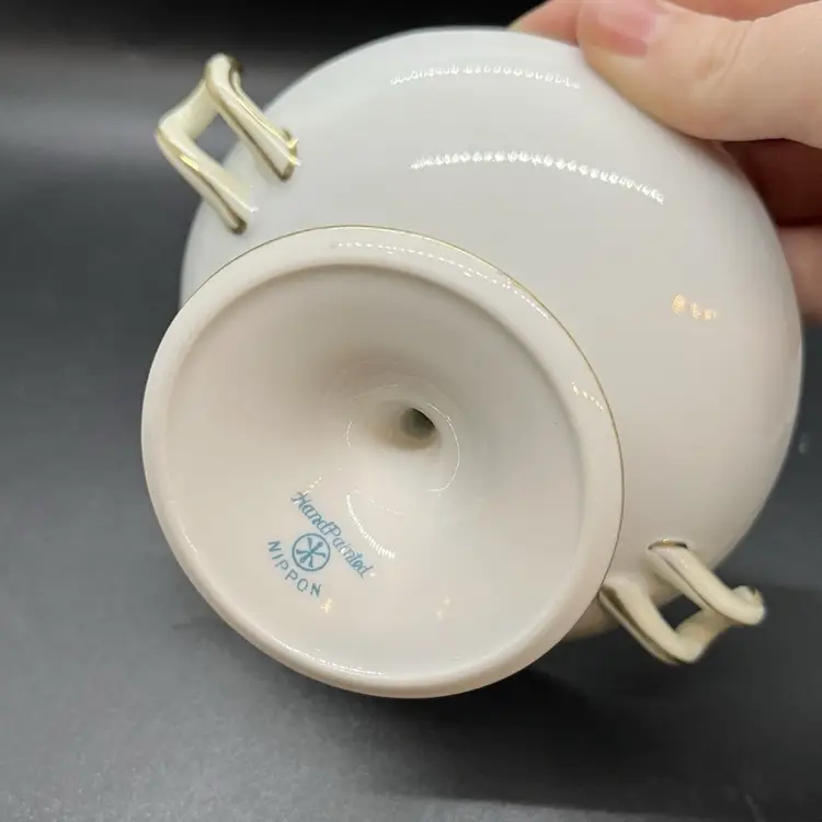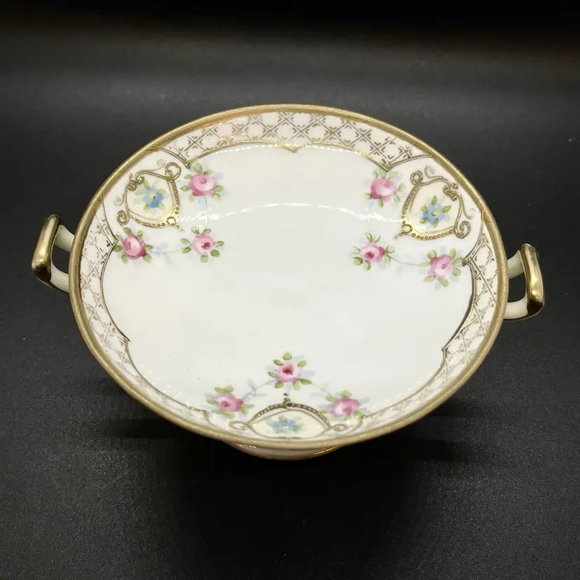 This is a small porcelain dish, perfect size for rings/keys/etc. Marked as hand painted Nippon, has a gold gilt floral design on top. No chips or cracks, measures a little over 4" across the top and 2.5" tall.