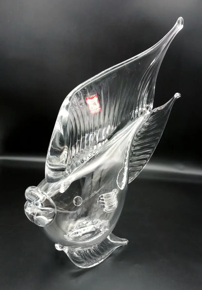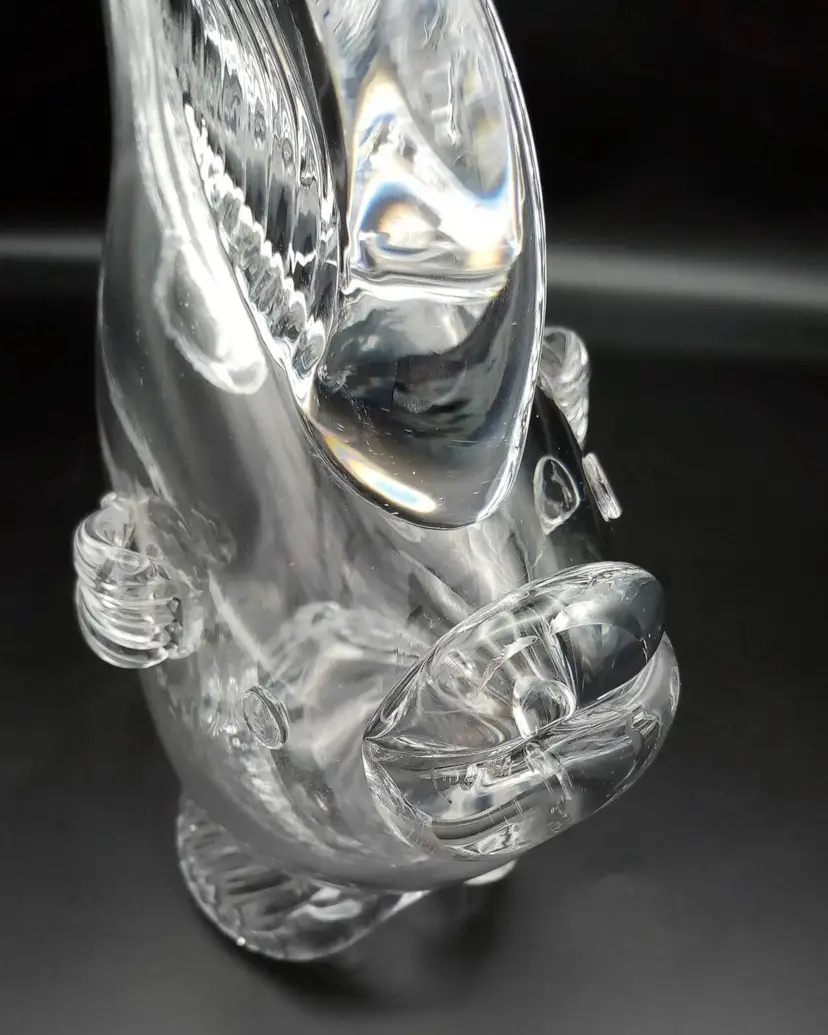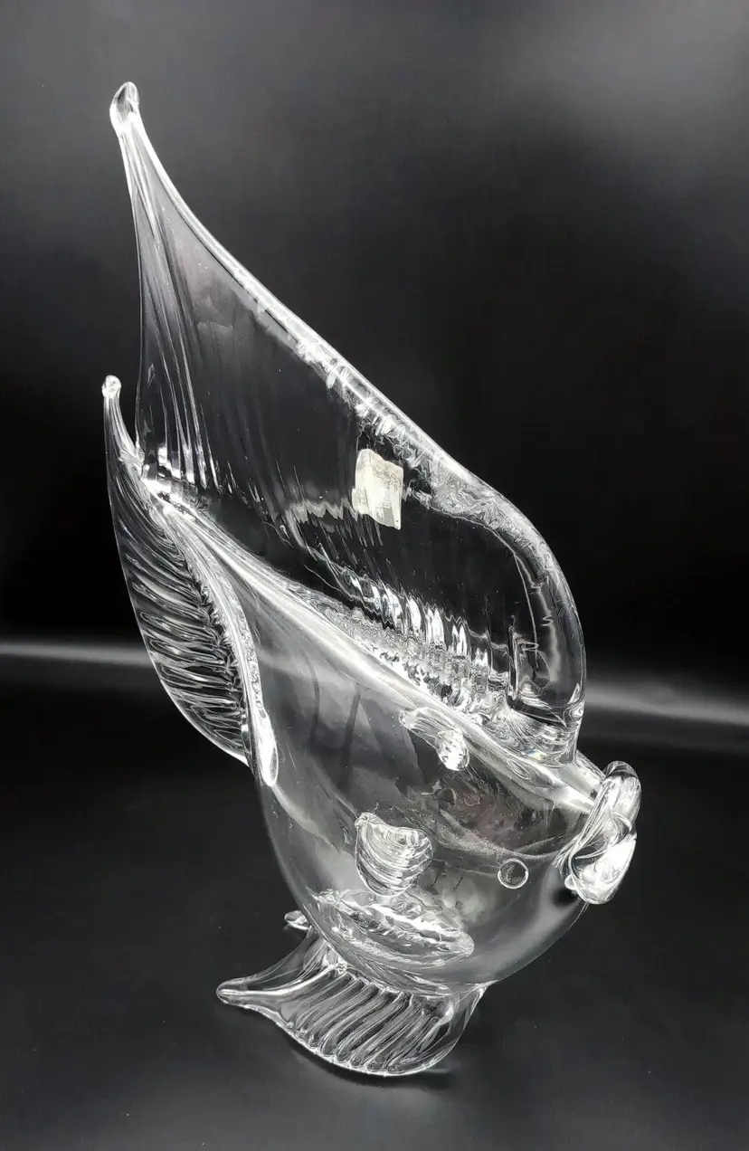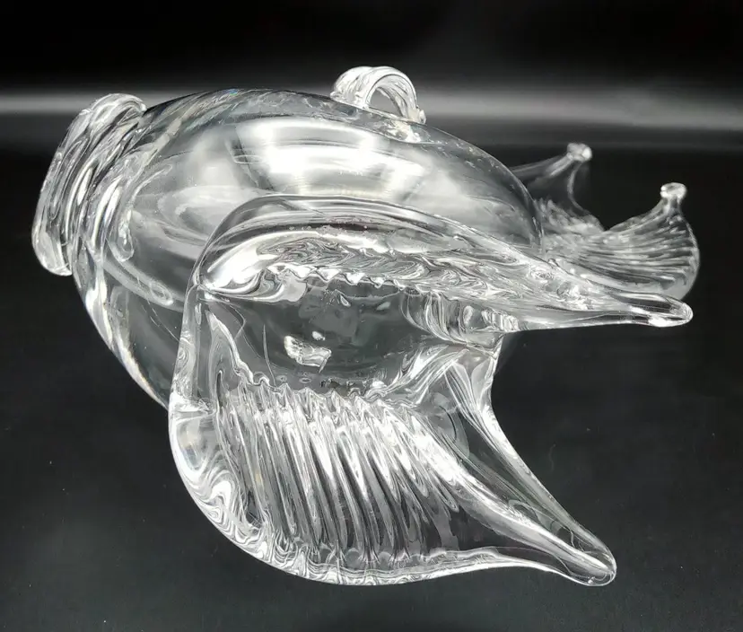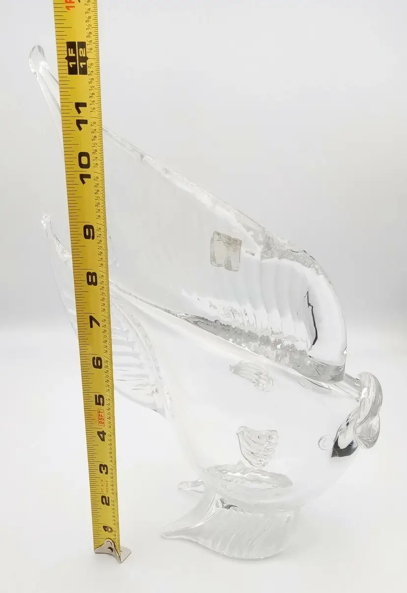 This is an impressive sized crystal fish, standing at slightly over a foot in height. There are a few places with what I would call anomalies, not damage. There is a rough spot where the fins meet in the back but I don't think this is damage. I think it's just the way the glass was made. Also, there is some discoloration about the mouth but again, it's within the glass and I believe part of manufacturing. Please view the photos carefully and let me know if you have any questions. Thanks for looking!