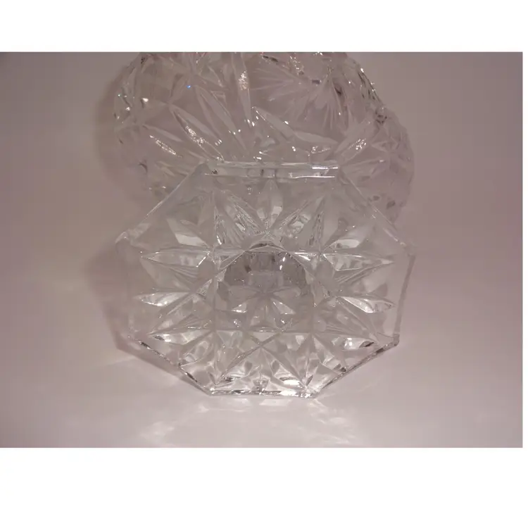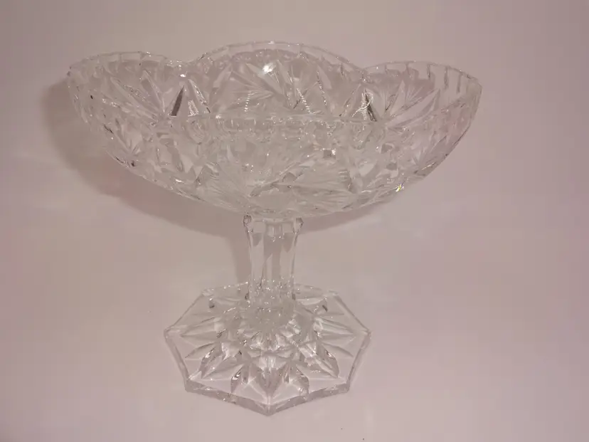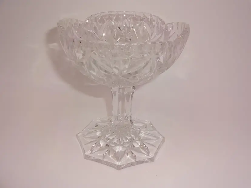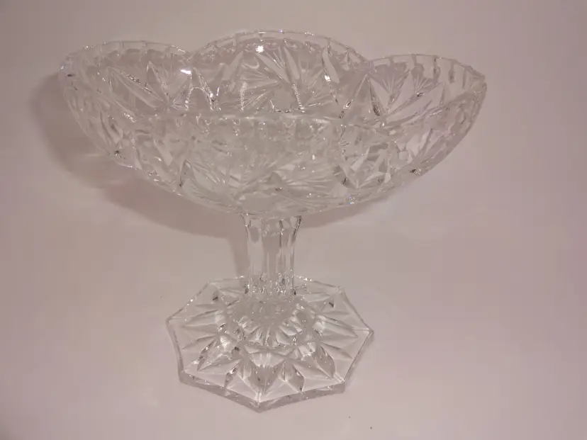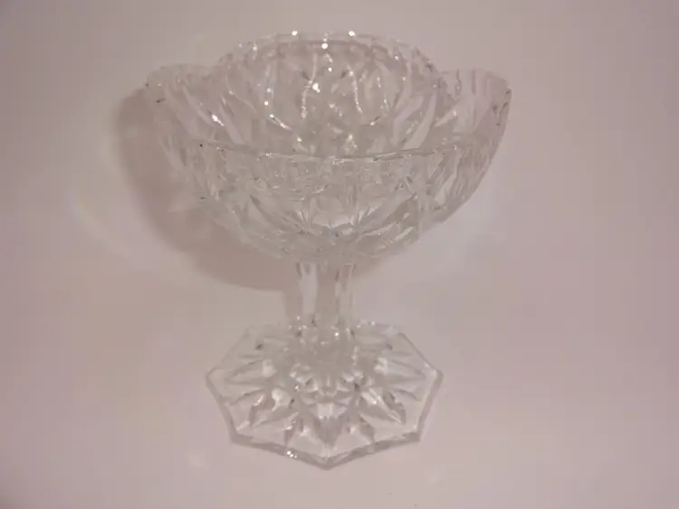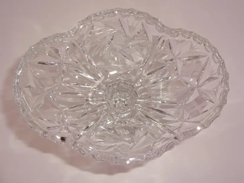 Very good pre-owned condition. An oval, clear, hand-cut crystal, footed bowl or candy/nut dish. It features a glossy finish and a pinwheel pattern. Approximate measurements (widest/tallest points): 6-1/8" x 4-3/4" x 5-1/8". No chips, cracks or stains.