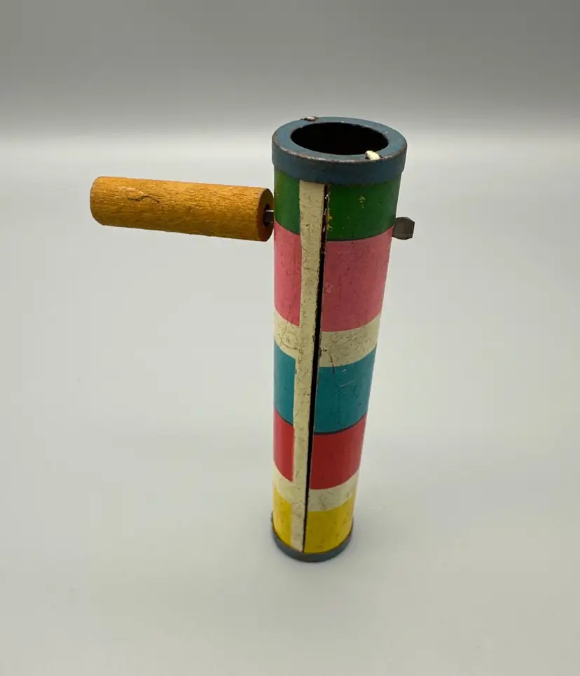 This vintage noise maker from Lucky Elephant Purity Popcorn Co. features a charming striped design and a sturdy wooden handle. A nostalgic piece for collectors. RARE TOY!