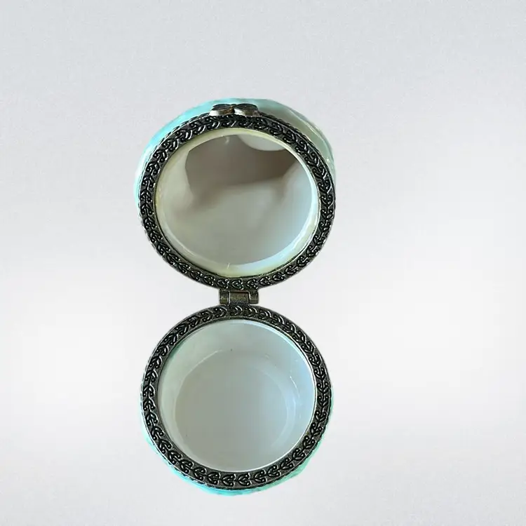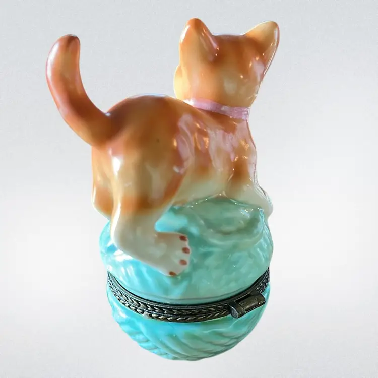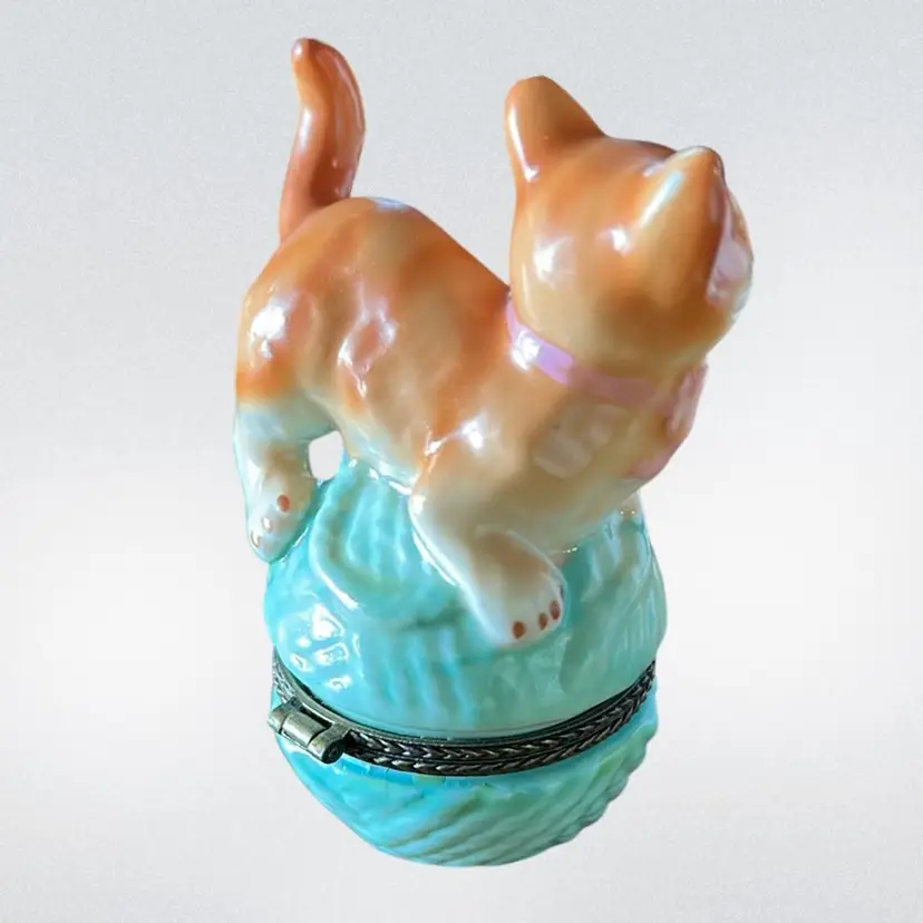 The Vintage Nomoges Trinket Box features a charming design of a kitty cat playing on a ball of yarn. This collectible cat-themed item adds a touch of whimsy to any space, making it a delightful addition to any cat lover's collection. Its unique and nostalgic appeal makes it a special piece for display or for storing small trinkets.