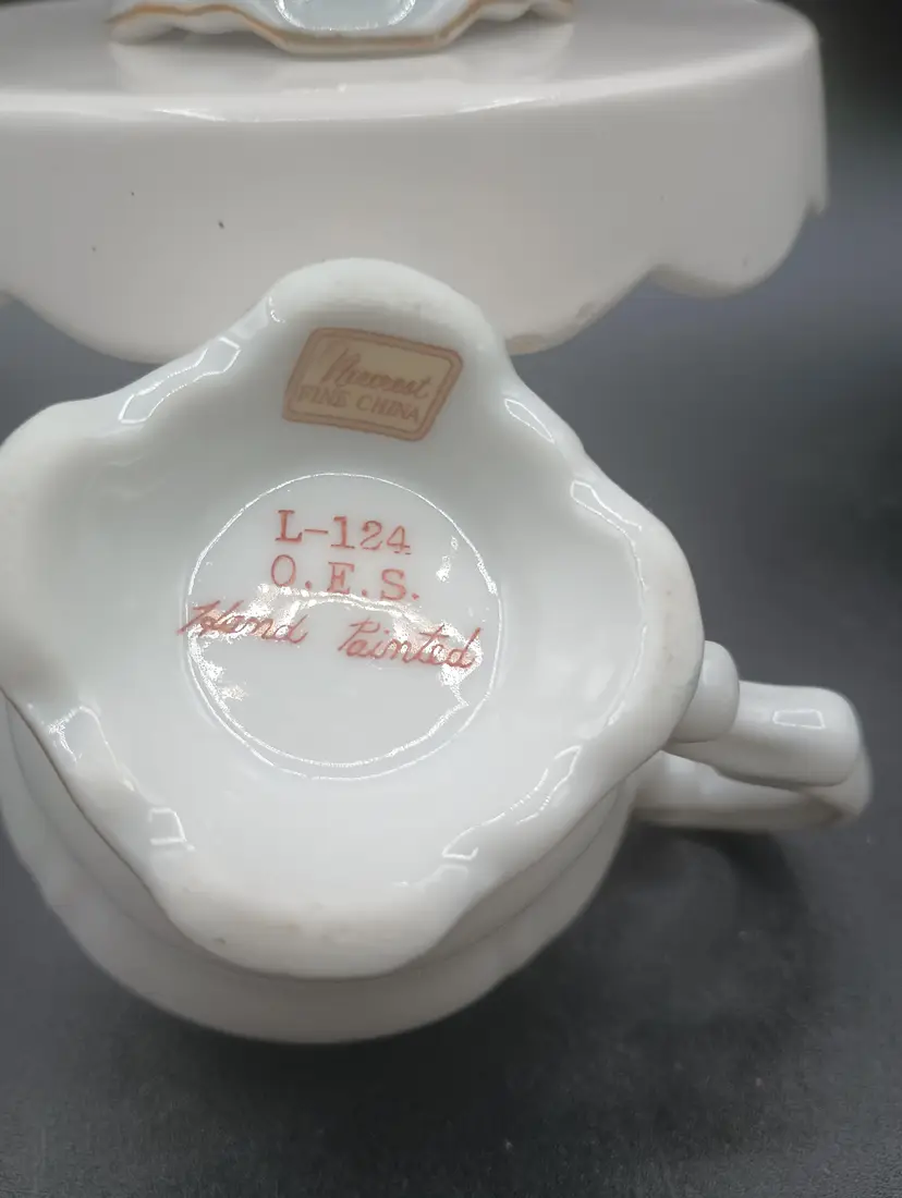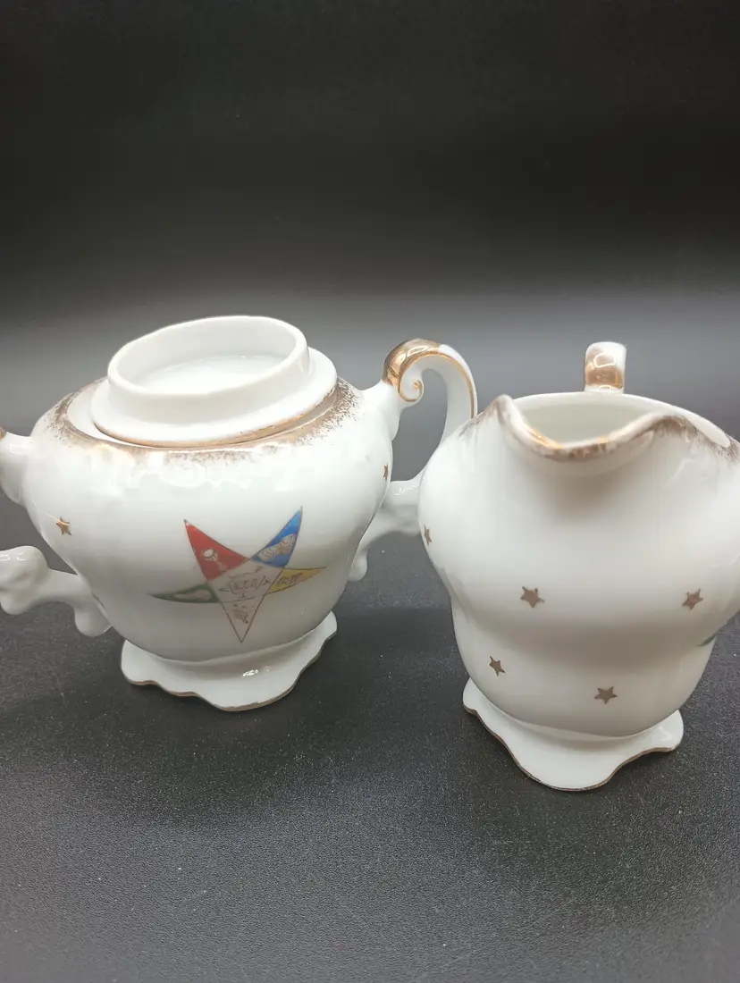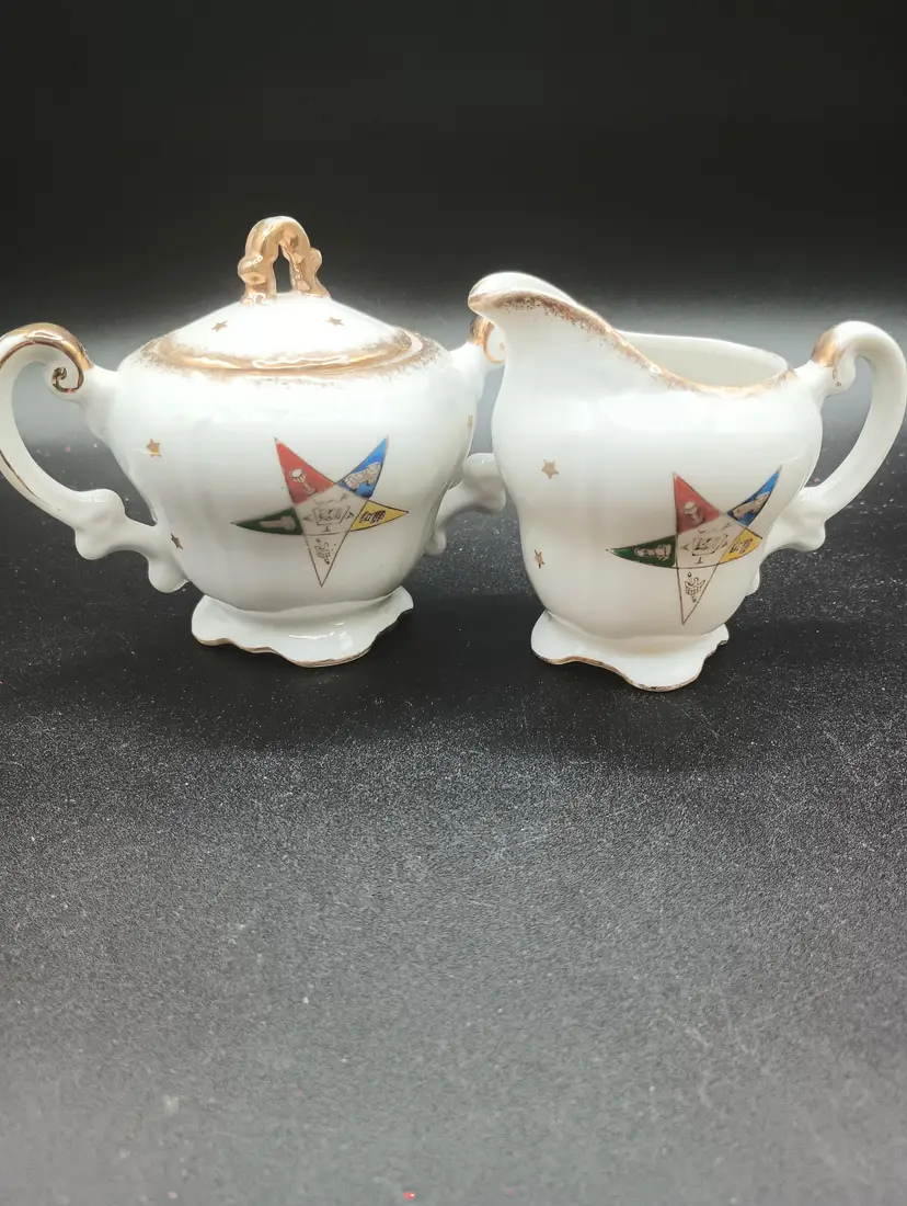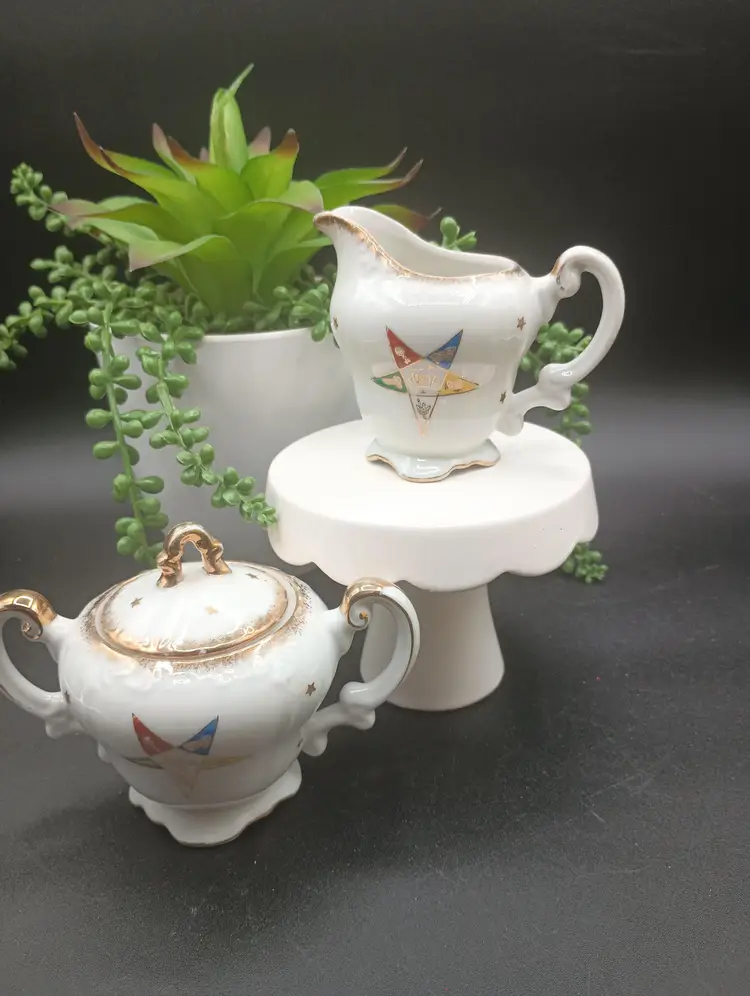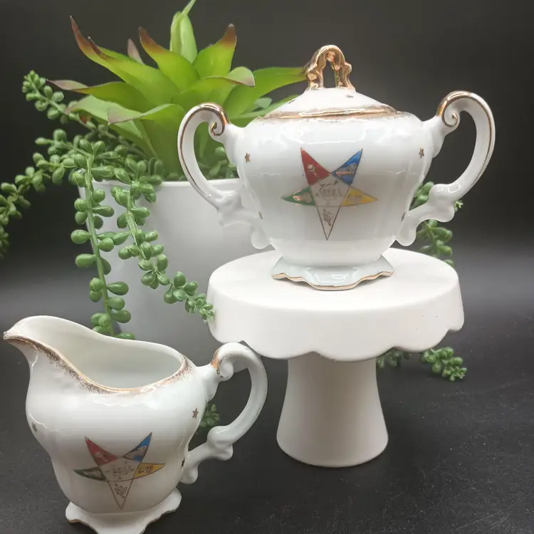 This vintage Norcrest fine china creamer and covered sugar set features a hand-painted design with the Order of Eastern Star pattern, making it a unique and collectible piece. The creamer and sugar set are adorned with vibrant multicolor detailing, adding a touch of elegance to any dining or tea party occasion. These pieces are a beautiful representation of Norcrest's craftsmanship and the Masonic symbolism of the O.E.S. design. Perfect for collectors or those looking to add a special touch to their tableware collection.