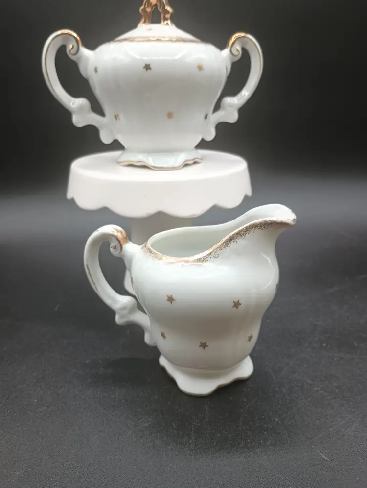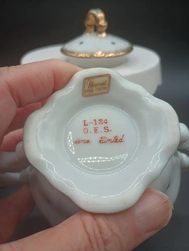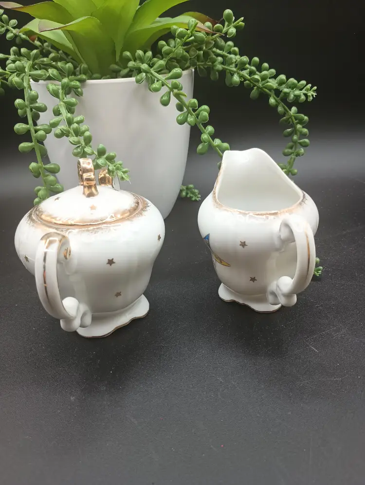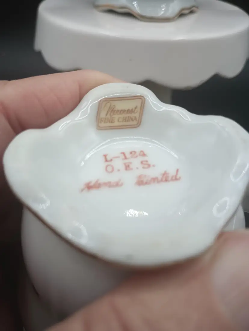 This vintage Norcrest fine china creamer and covered sugar set features a hand-painted design with the Order of Eastern Star pattern, making it a unique and collectible piece. The creamer and sugar set are adorned with vibrant multicolor detailing, adding a touch of elegance to any dining or tea party occasion. These pieces are a beautiful representation of Norcrest's craftsmanship and the Masonic symbolism of the O.E.S. design. Perfect for collectors or those looking to add a special touch to their tableware collection.