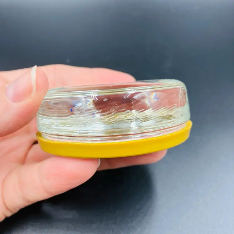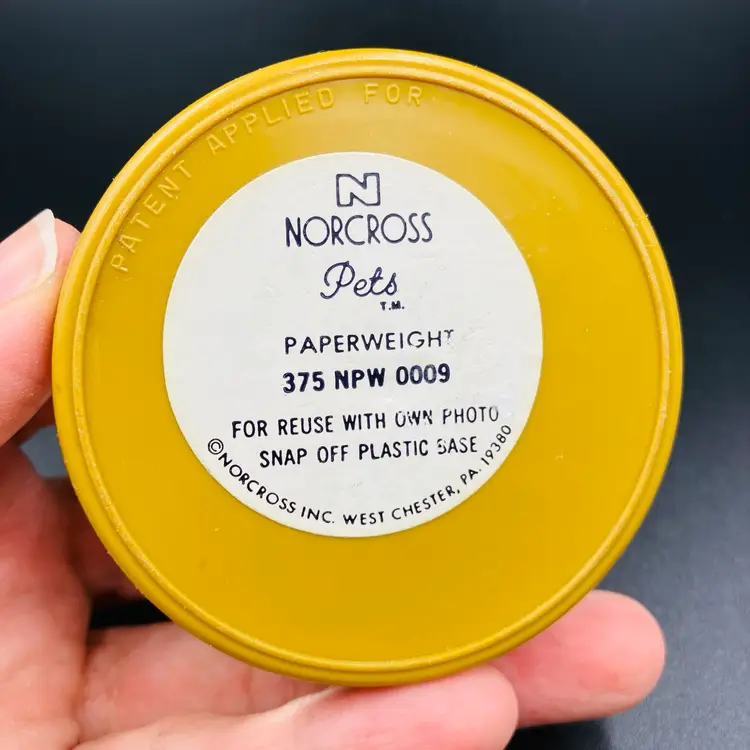 This is a sweet vintage Norcross Pets paperweight. It’s got an adorable hound and frog on it. If you want to you can snap off the plastic base and insert a photo of your own choosing. It measures approximately 2 1/2” in diameter and 7/8” tall. It’s in excellent condition!
