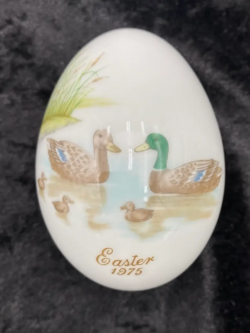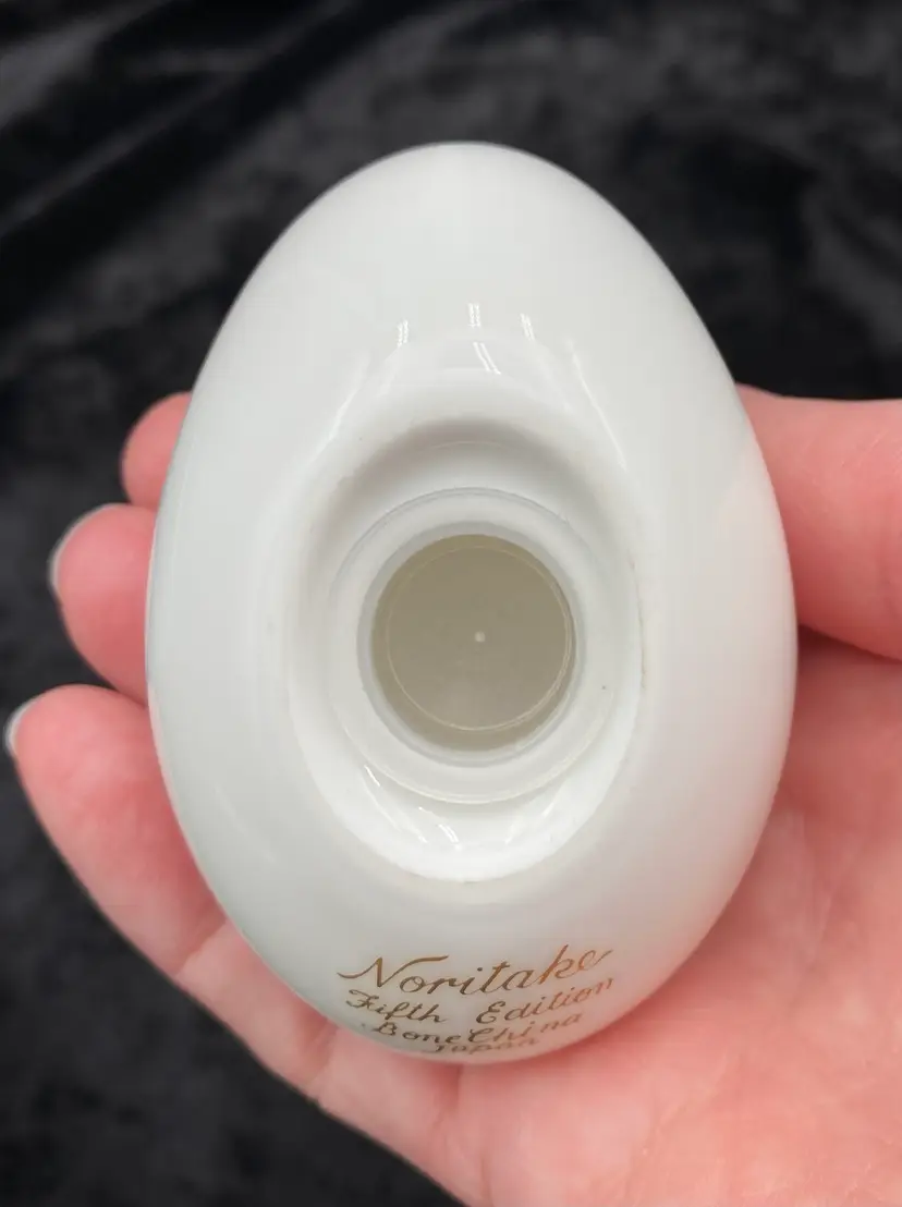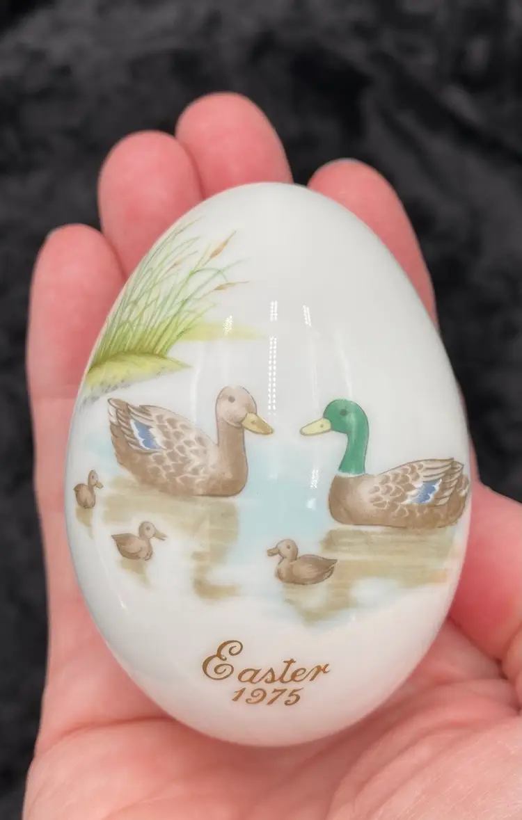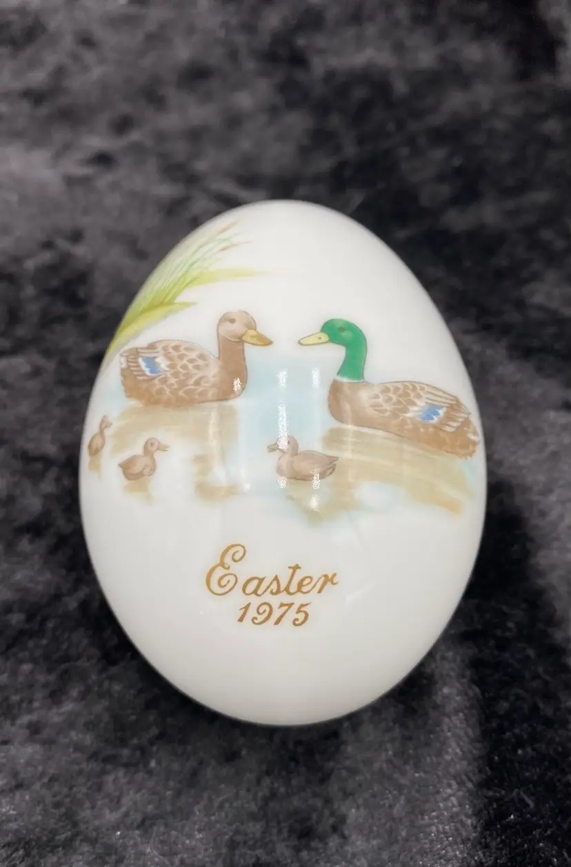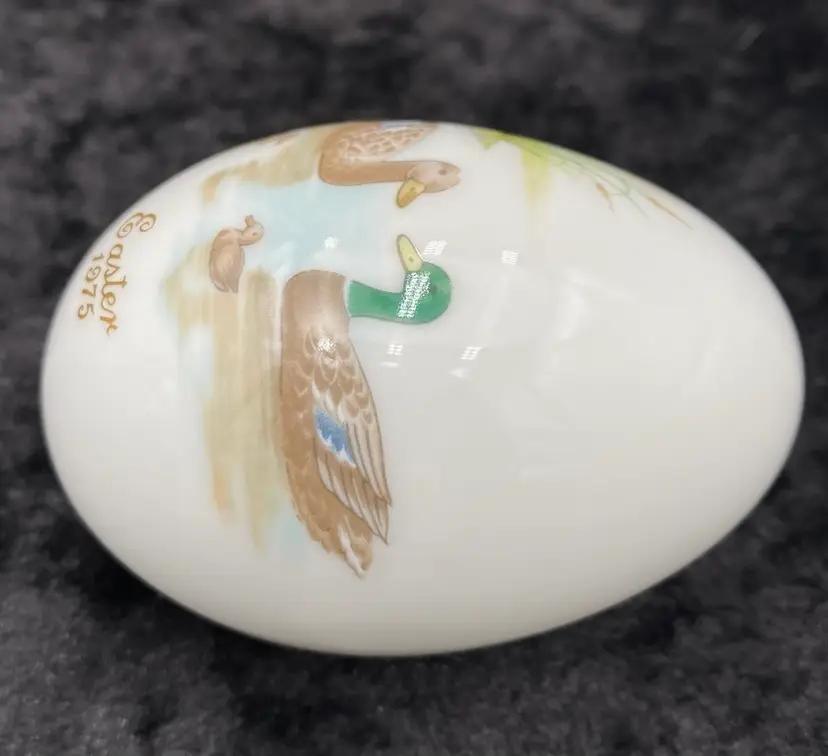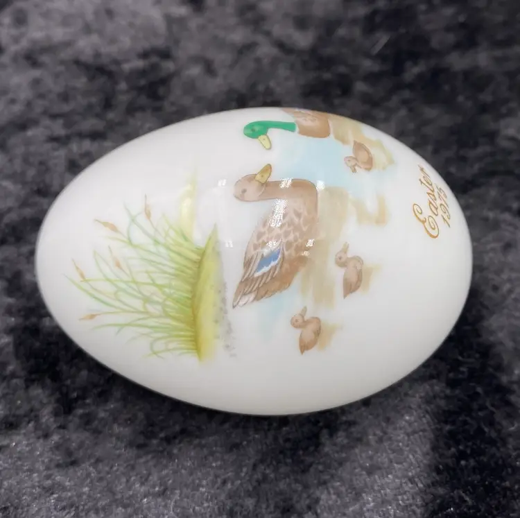 This vintage Noritake collector egg features a charming scene of ducks and ducklings in high gloss bone china. Made in Japan in 1975, this limited edition egg is perfect for Easter. Measuring 3 inches in length, 2 inches in height, and 1.9 inches in width, it is small and easy to display. The egg is hollow and fillable, coming with its original stopper, making it a unique addition to your collection or as a gift. The message came with the Noritake egg: "The giving of decorated eggs has been an important tradition in the Old World for many years. The Egg, symbolizing the Source of Life, is given to express the love and friendship that lies deep in the heart of the giver."