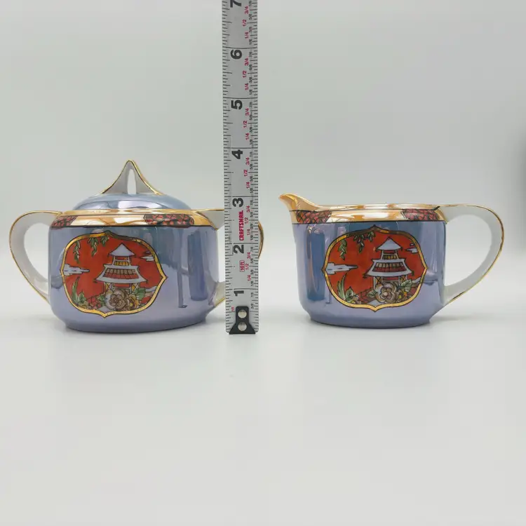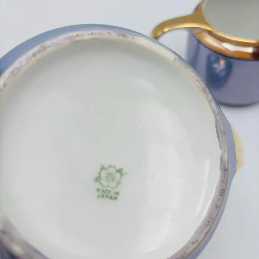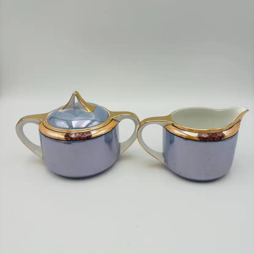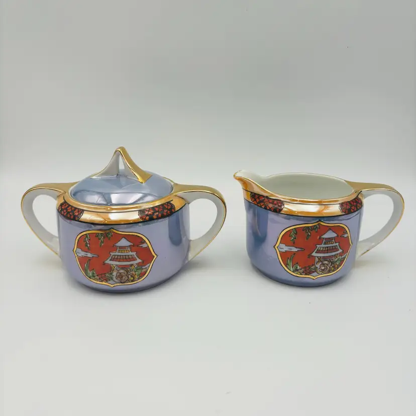 For sale is a Vintage Noritake Blue and Peach Lusterware Sugar and Creamer Sakura Japan Mark