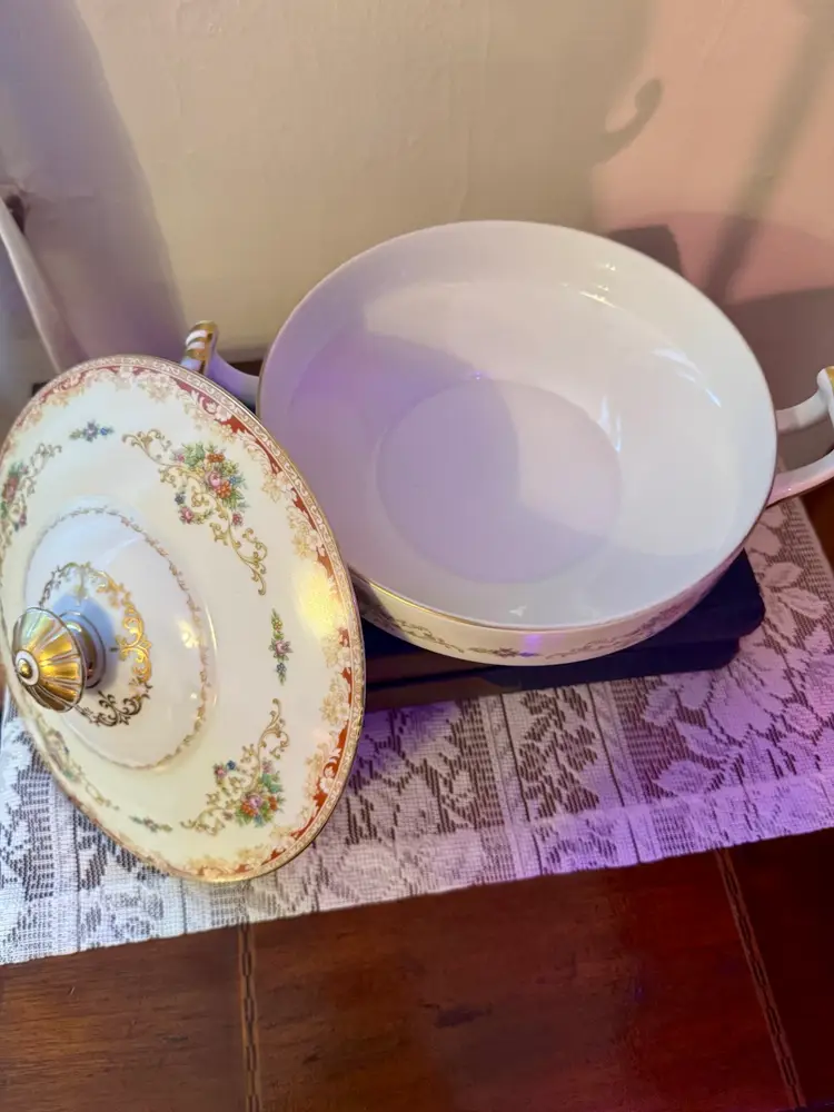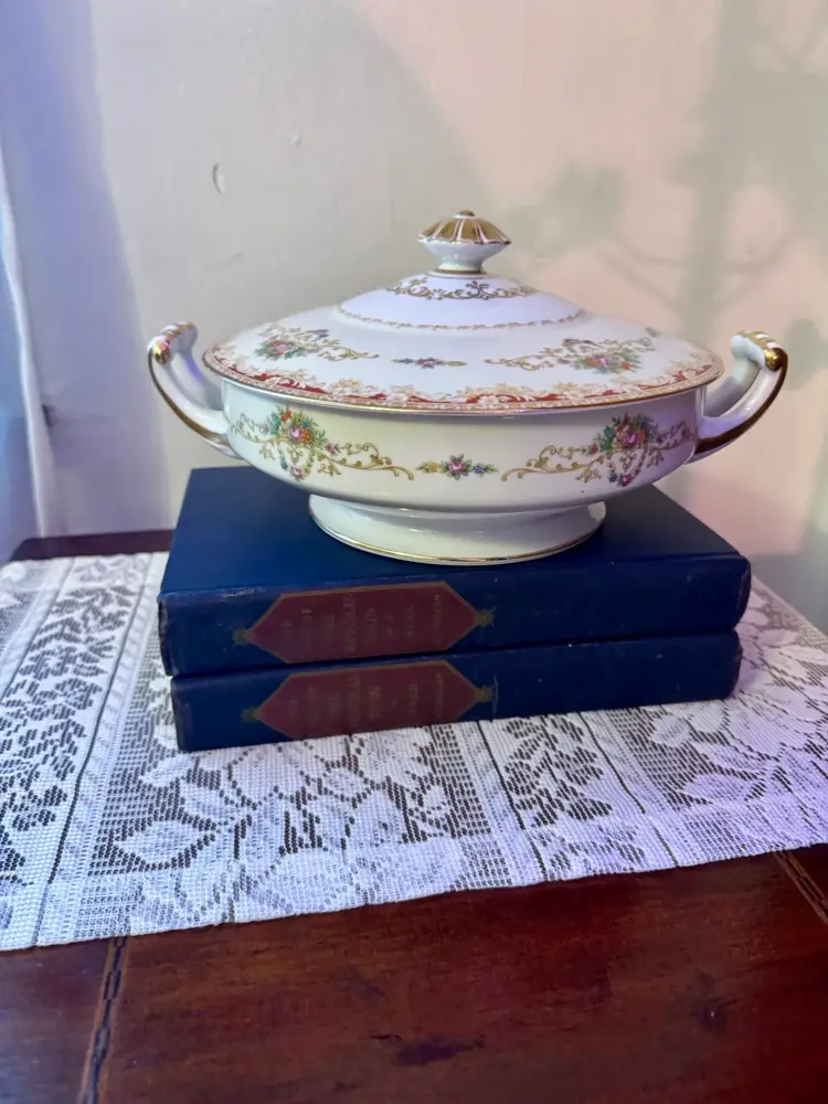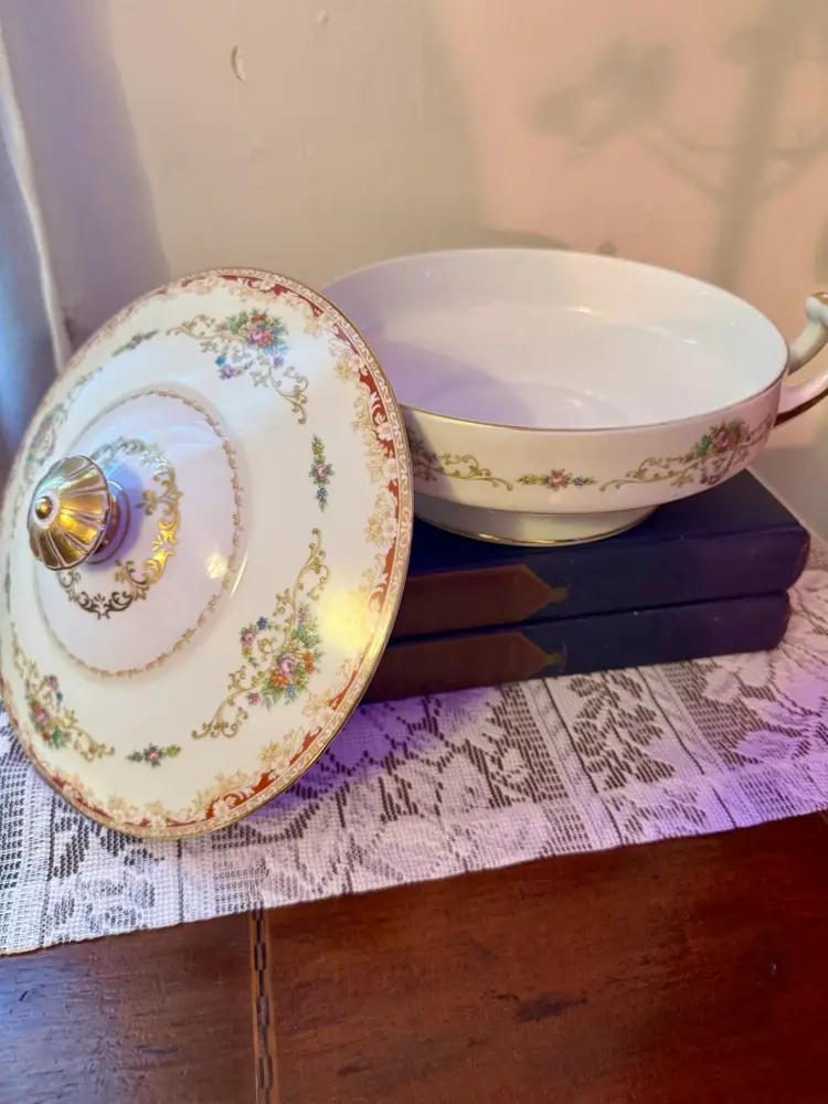 Bring timeless charm to your table or display with this vintage Noritake porcelain tureen. Featuring delicate floral motifs and rich gold accents, this lidded serving dish is both functional and decorative. With ornate handles and a sculpted knob, it’s perfect for collectors, stylists, or anyone who loves romantic vintage decor. Excellent vintage condition; no chips or cracks.