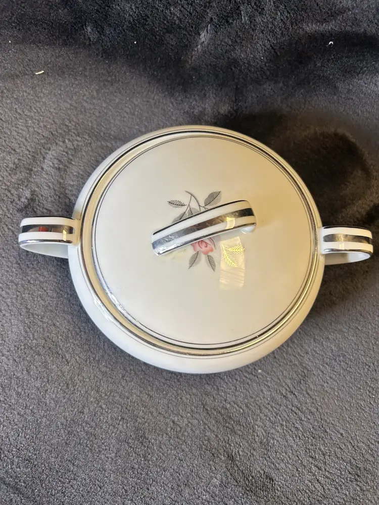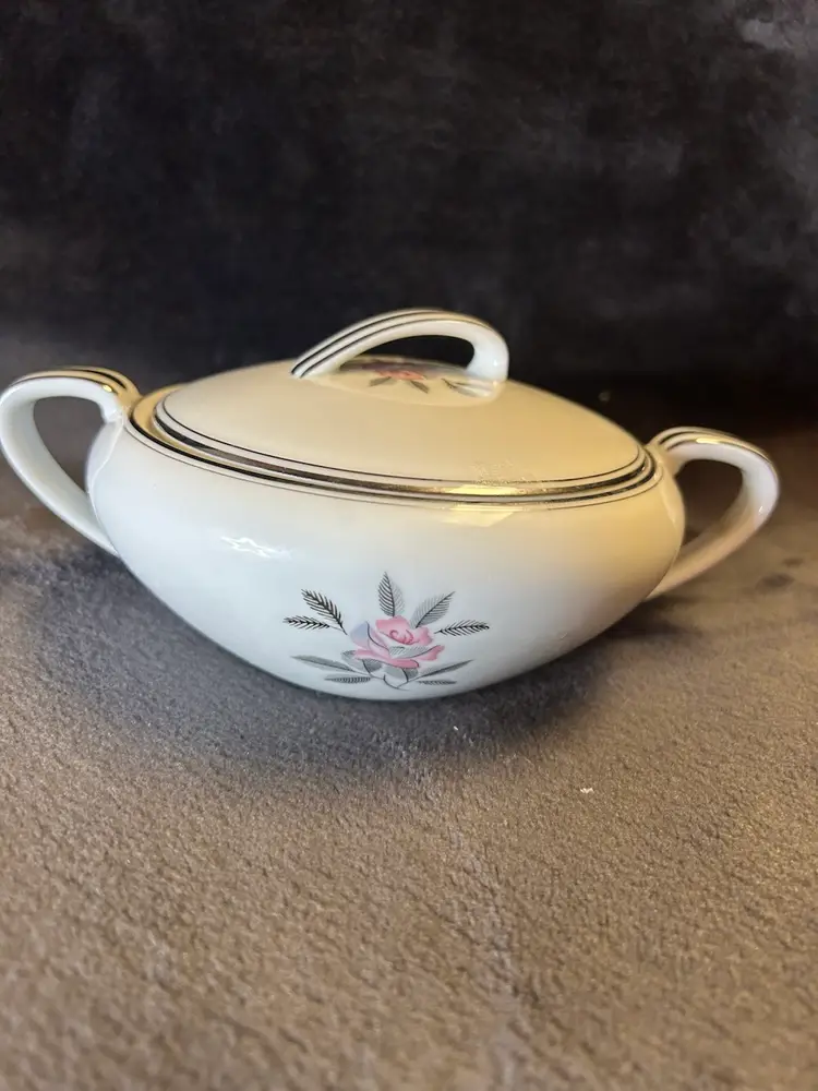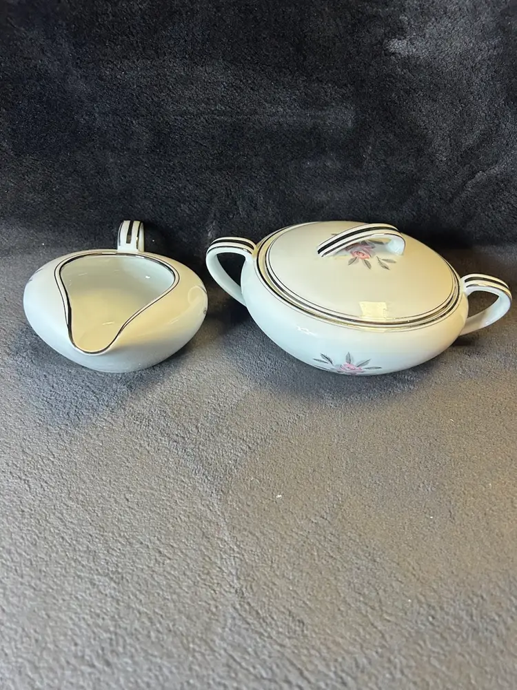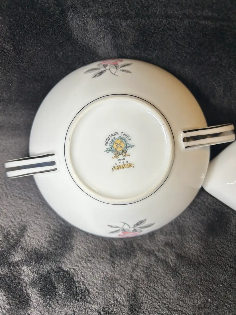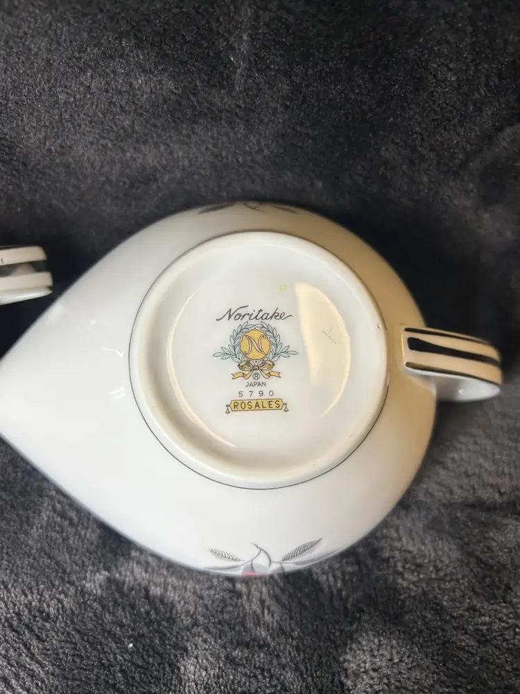 The items are a vintage Noritake Rosales pattern creamer and sugar bowl with lid,likely produced between 1956 and 1971. Additional details include: