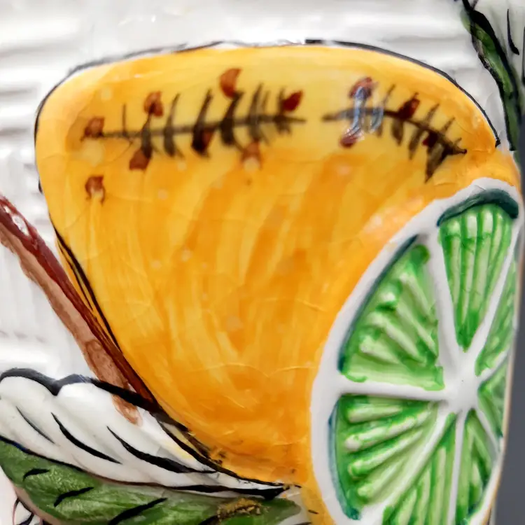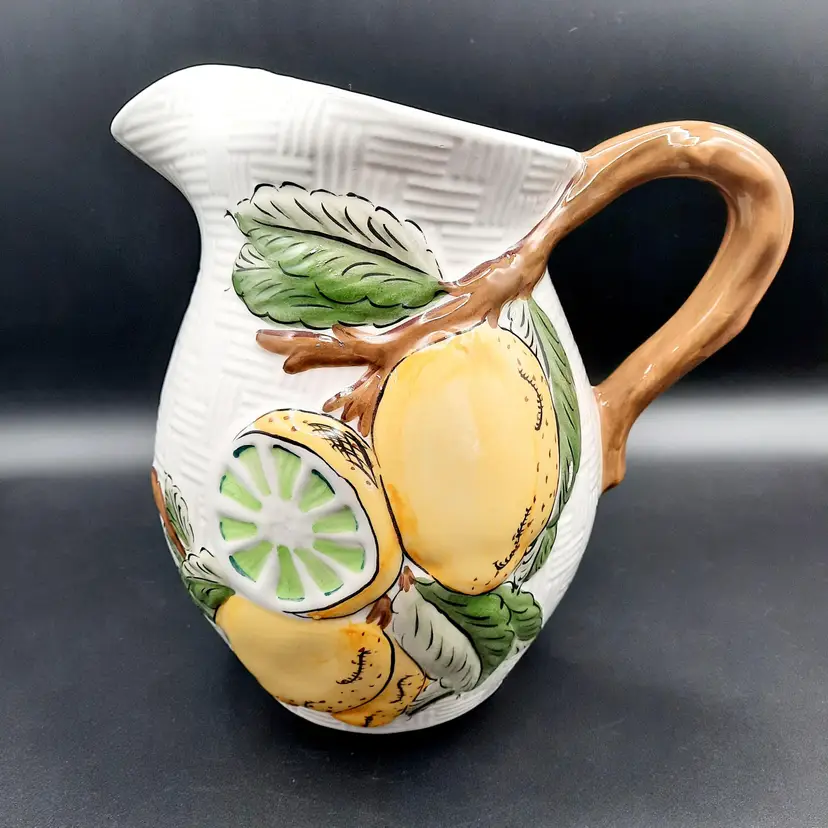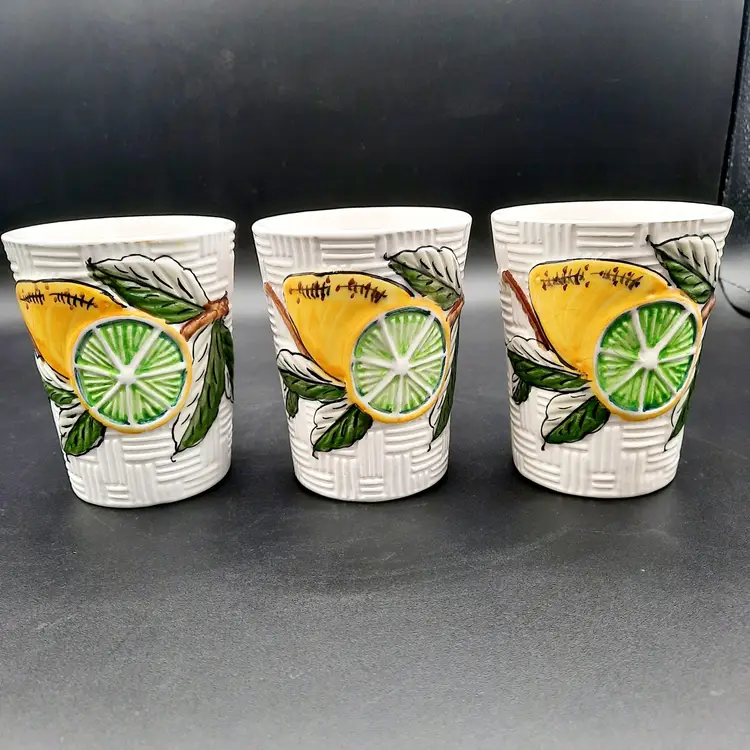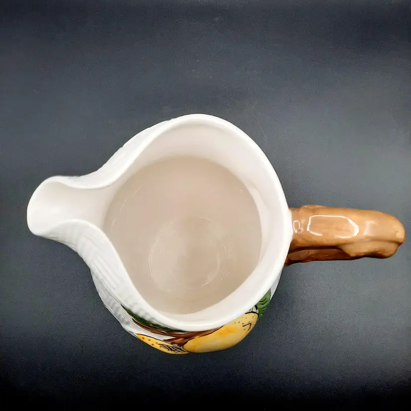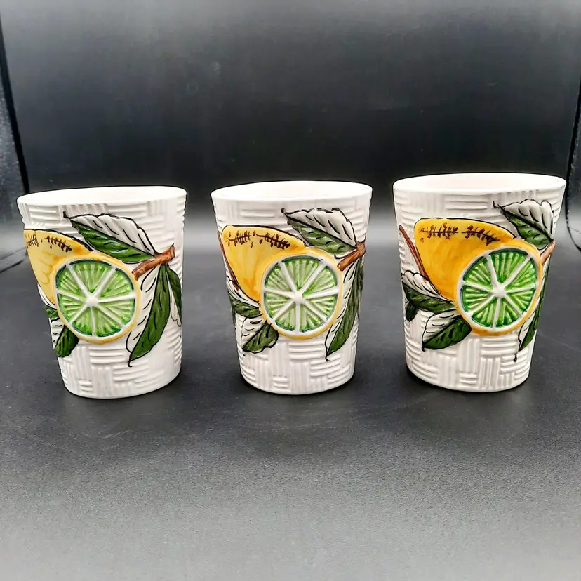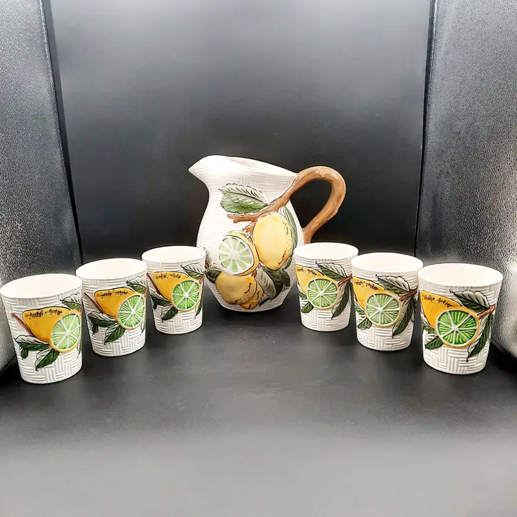 Fabulous unique set of pitcher and 6 cups. Pitcher is 9" H x 9"W spout to handle, cups are 4"H x 3 1/4"W at rim. Do have crazing (some pieces more than others) and a few pieces have tiny paint chips, overall very good condition.
