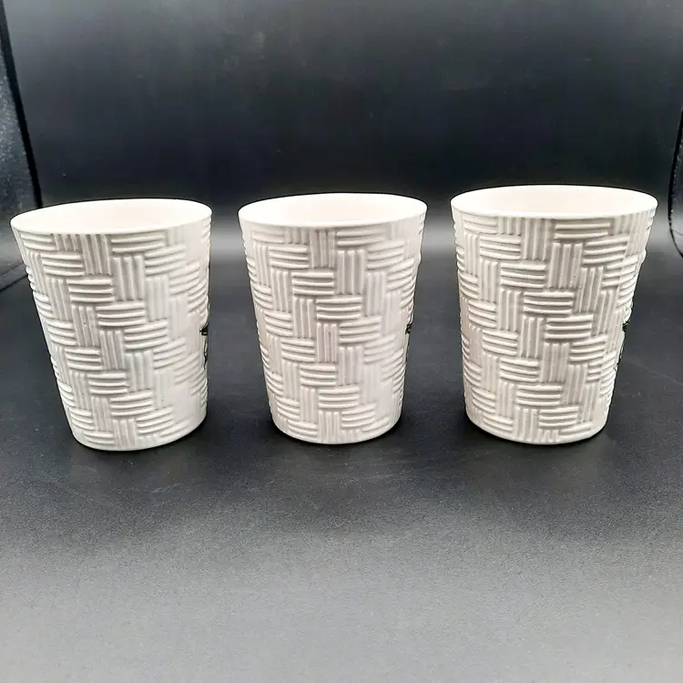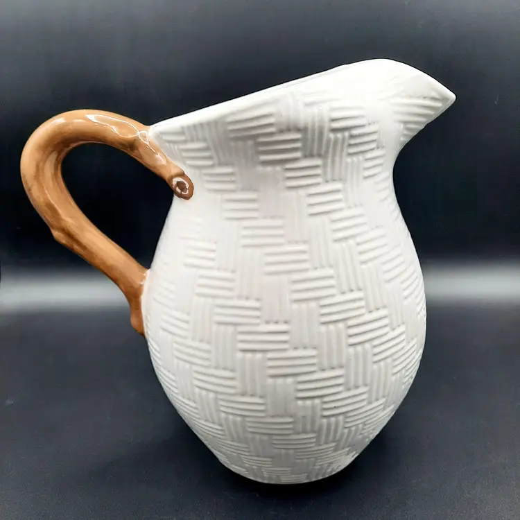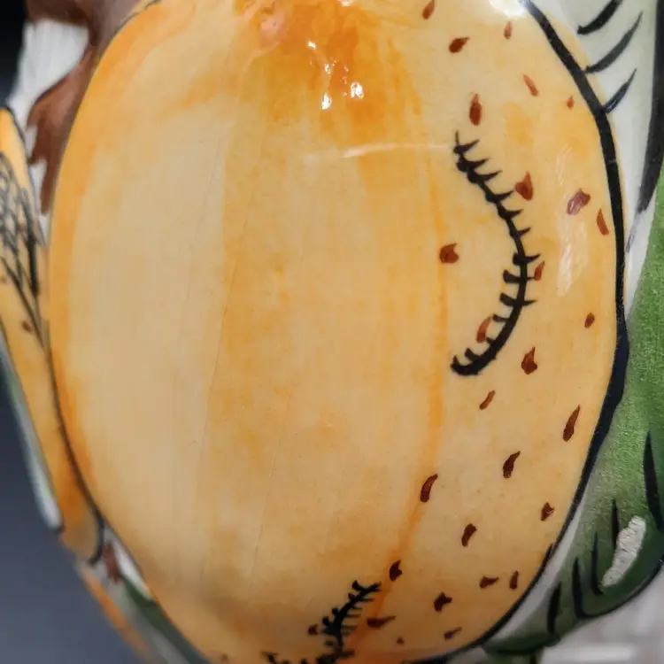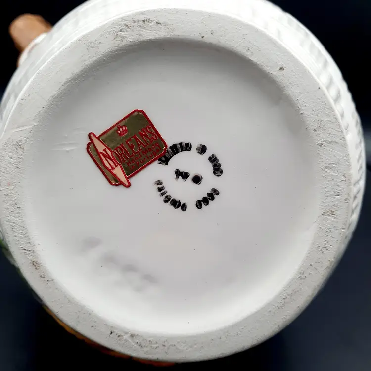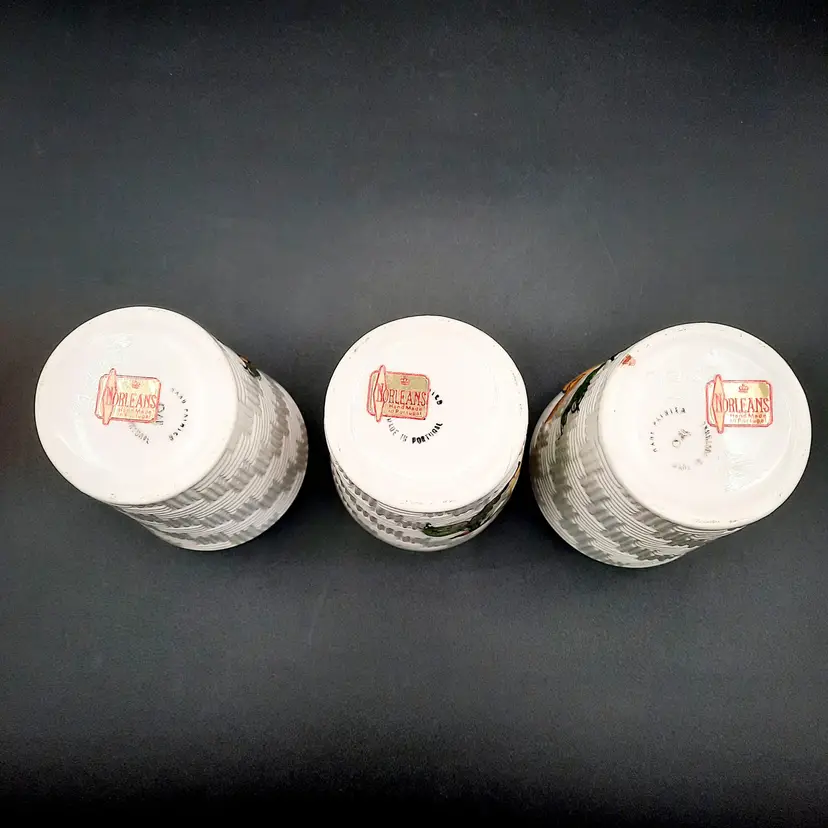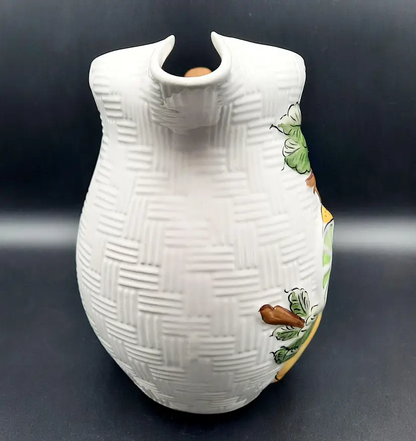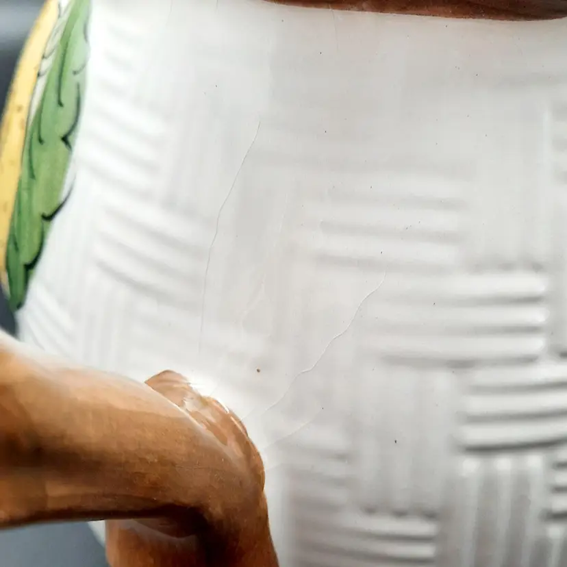 Fabulous unique set of pitcher and 6 cups. Pitcher is 9" H x 9"W spout to handle, cups are 4"H x 3 1/4"W at rim. Do have crazing (some pieces more than others) and a few pieces have tiny paint chips, overall very good condition.
