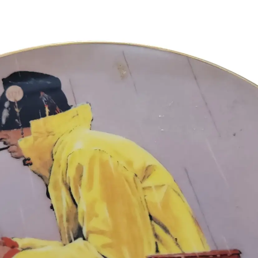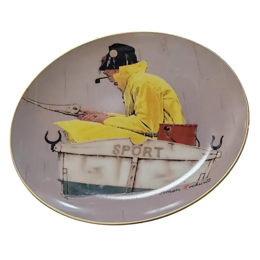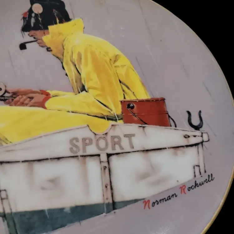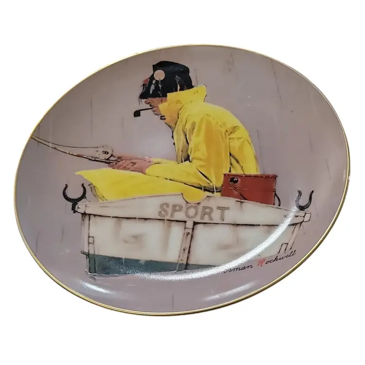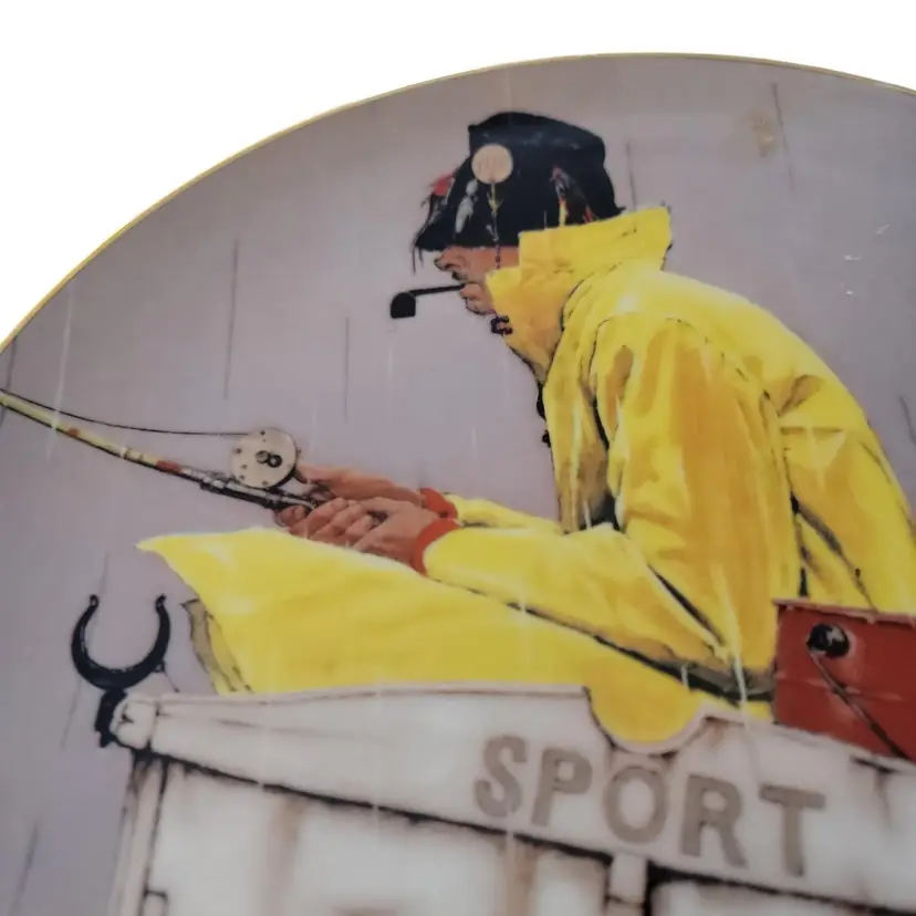 This vintage collector plate features a colorful depiction of a fisherman in ocean rain pattern. The round plate measures 8 1/4" in diameter and is made of ceramic material. It was produced by Hoyle Products in the late 20th century and features a fish-themed design.