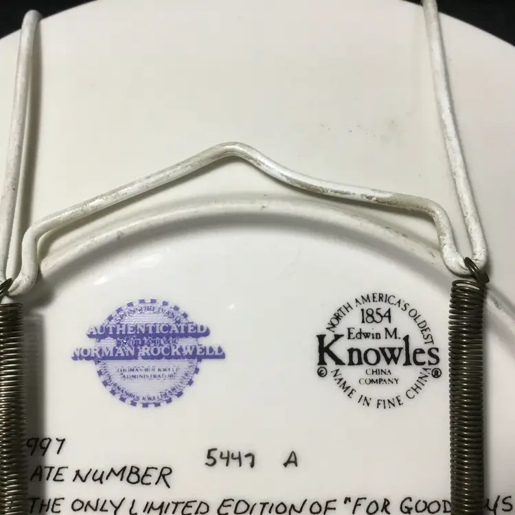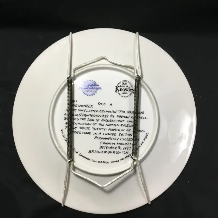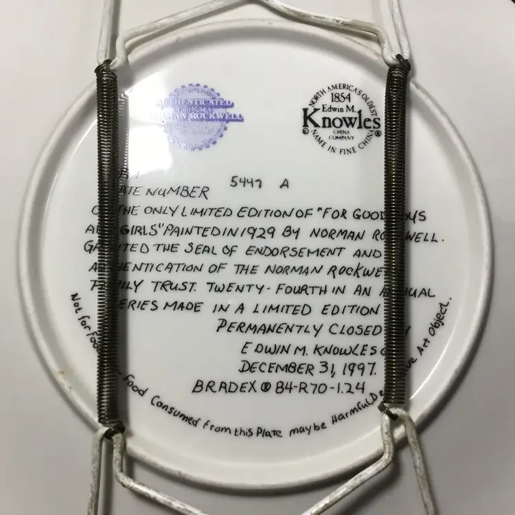 Approx. 8 inches in diameter, porcelain fine china collector plate. Features Santa in red vest & white shirt sleeves, with black glasses and visor, writing in a very large book with a fountain pen. One side of book has a bookmark that says "Good girls." Other side says, "Good boys." Santa holds a pipe in his teeth and is smiling. White painted plate hanger included.