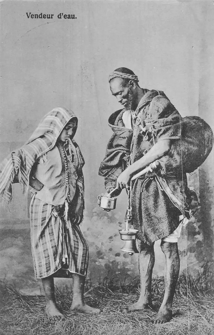 Capture a glimpse of traditional life with this authentic early 20th-century postcard featuring a North African water seller in action. A true piece of history for collectors and enthusiasts alike.