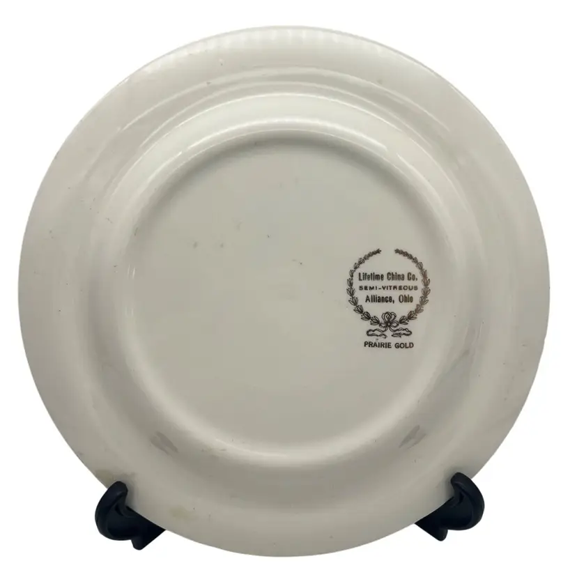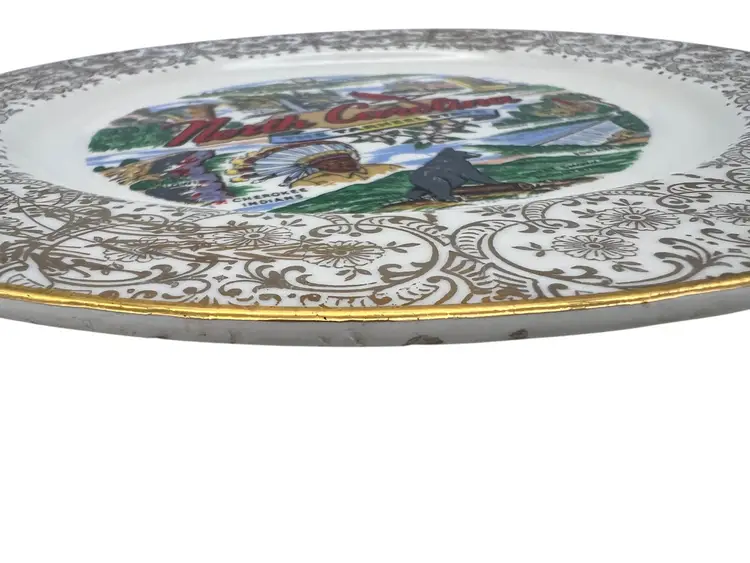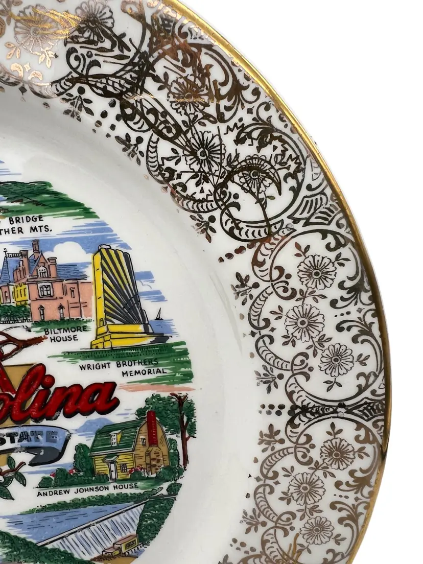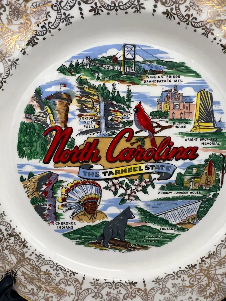 Vintage North Carolina “The Tar Heel State” souvenir collector plate made by Lifetime China Co. of Alliance, Ohio in the Prairie Gold pattern. Semi-vitreous china plate measures about 10 inches across with a multicolor center design featuring Chimney Rock, Bridal Veil Falls, Grandfather Mountain swinging bridge, Biltmore House, Wright Brothers Memorial, Andrew Johnson House, Fontana Dam, Great Smoky Mountains, Cherokee Indians, cardinal, and dogwood blossoms around a bold “North Carolina” banner. Wide gold floral filigree border with gold rim. Perfect for a state plate collection, travel wall display, or North Carolina decor.