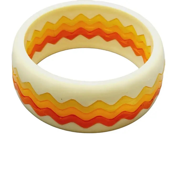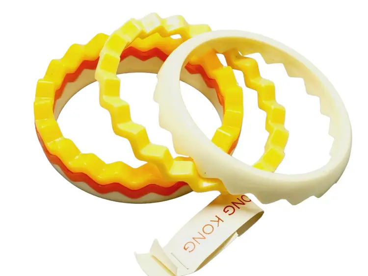 Interlocking Hong Kong plastic bangle set Size: inner circumference 2.5'' Condition: New old stock - Very good vintage Era: circa 1980s Unsigned: It is unsigned, but it does have the original tag, which has come off.