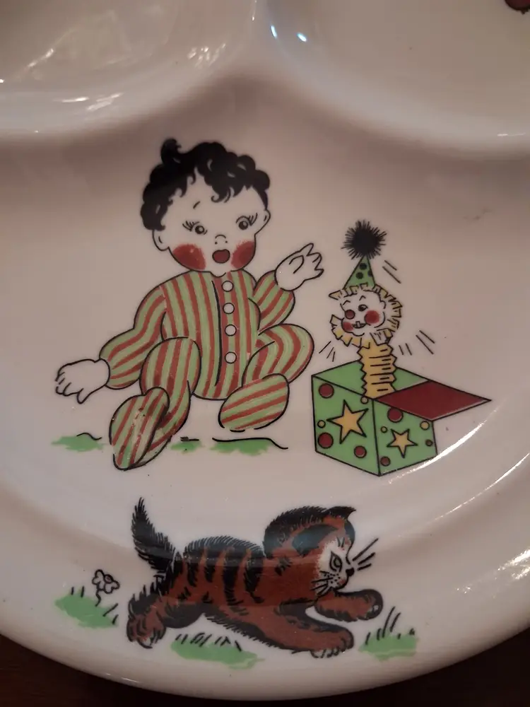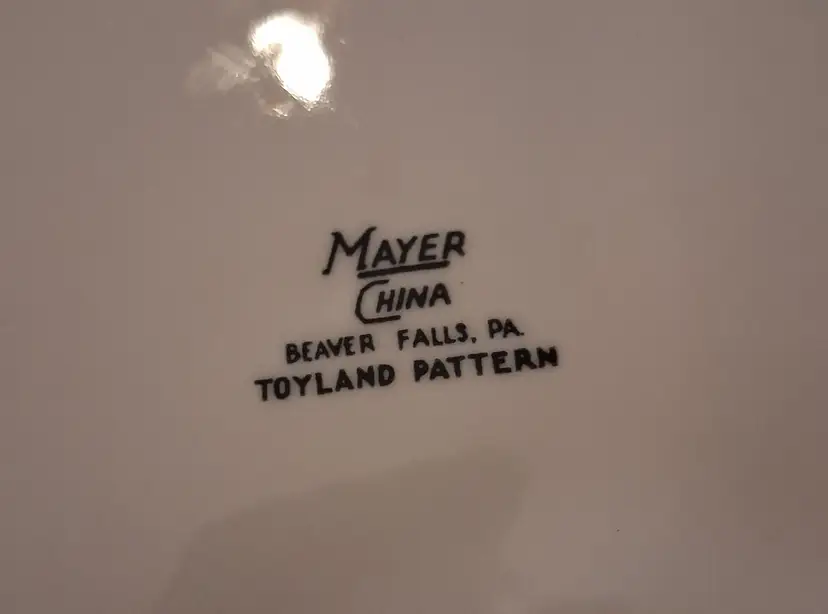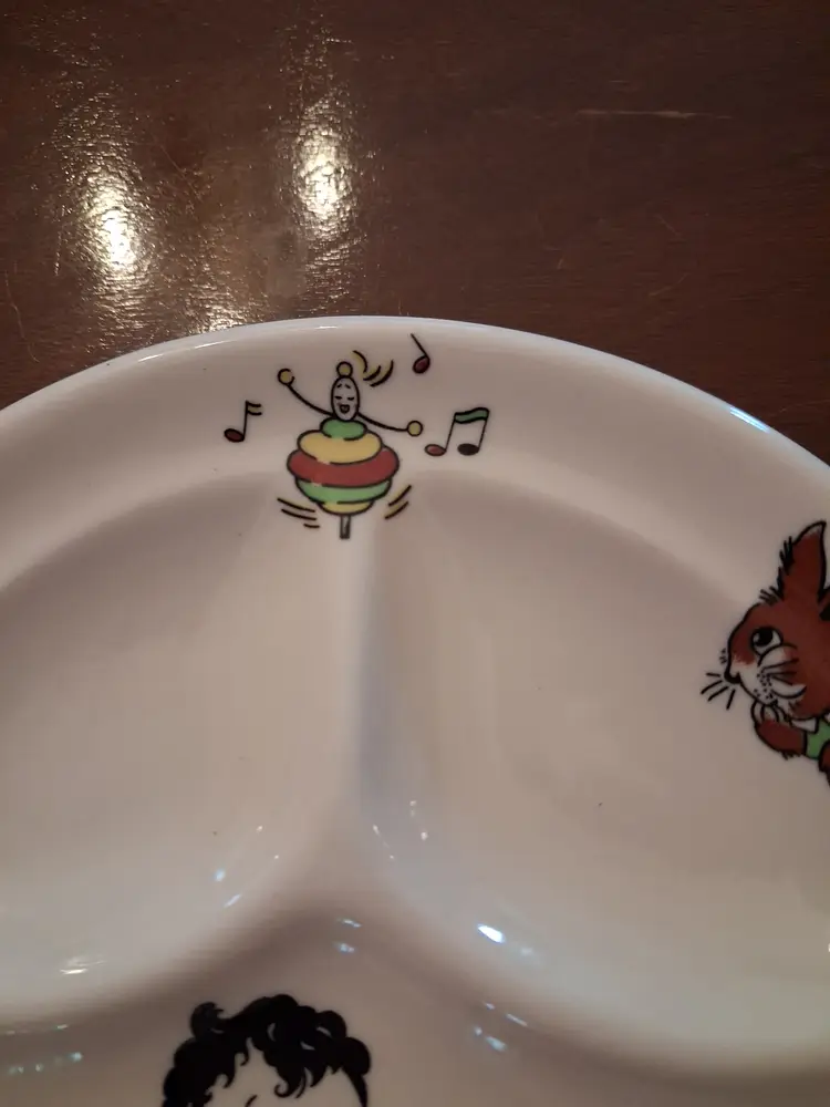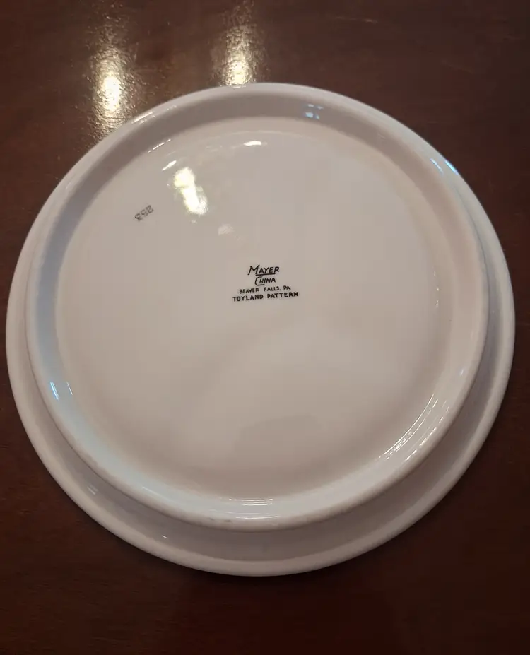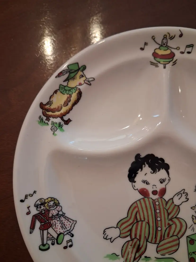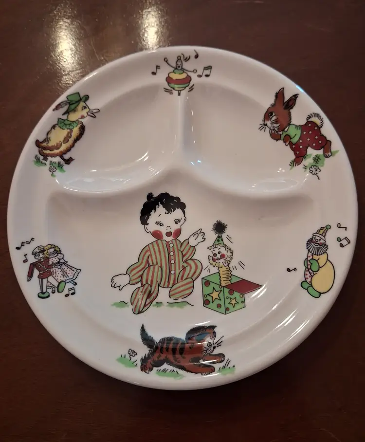 This vintage Mayer China "Toyland" pattern child's plate features colorful illustrations of whimsical toys and characters. Brand: Mayer China, a manufacturer known for restaurant ware based in Beaver Falls, Pennsylvania. Pattern: Toyland. Type: Divided snack or baby plate. Era: Typically manufactured in the 1940s or 1950s. Size: Measures approximately 8 to 8.25 inches in diameter.