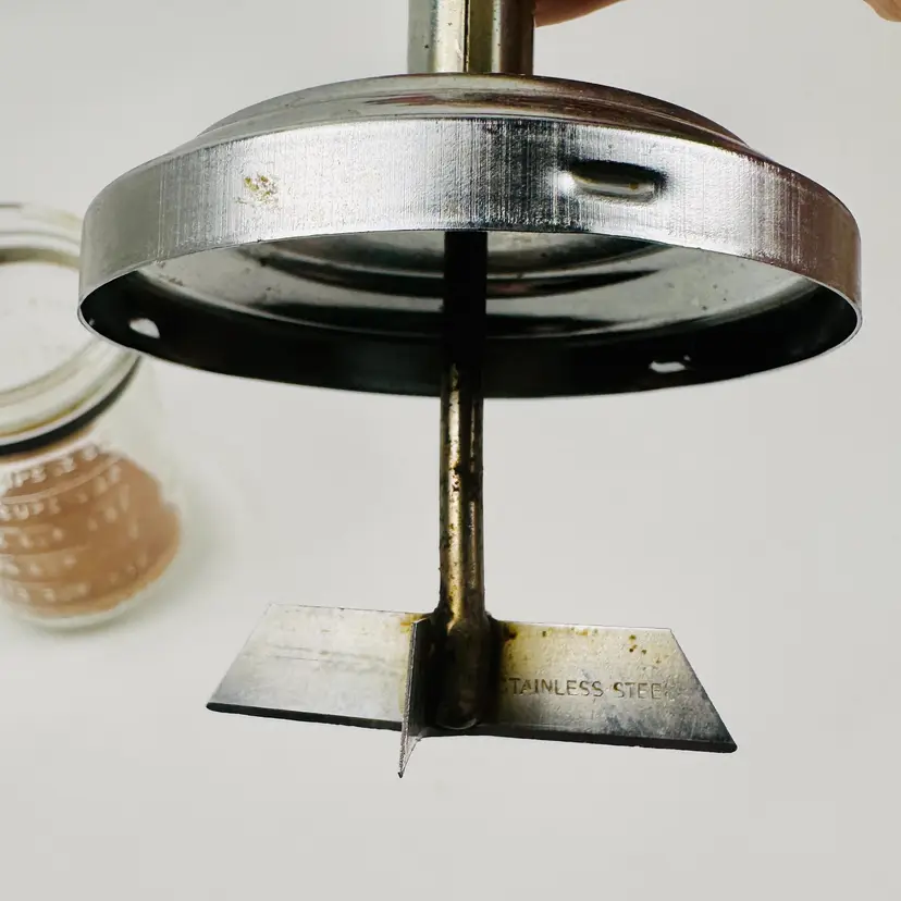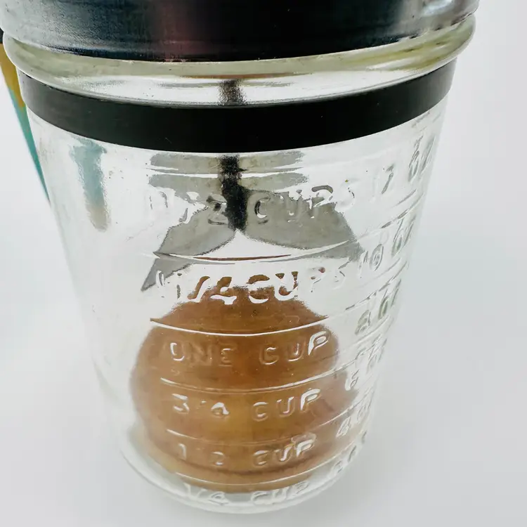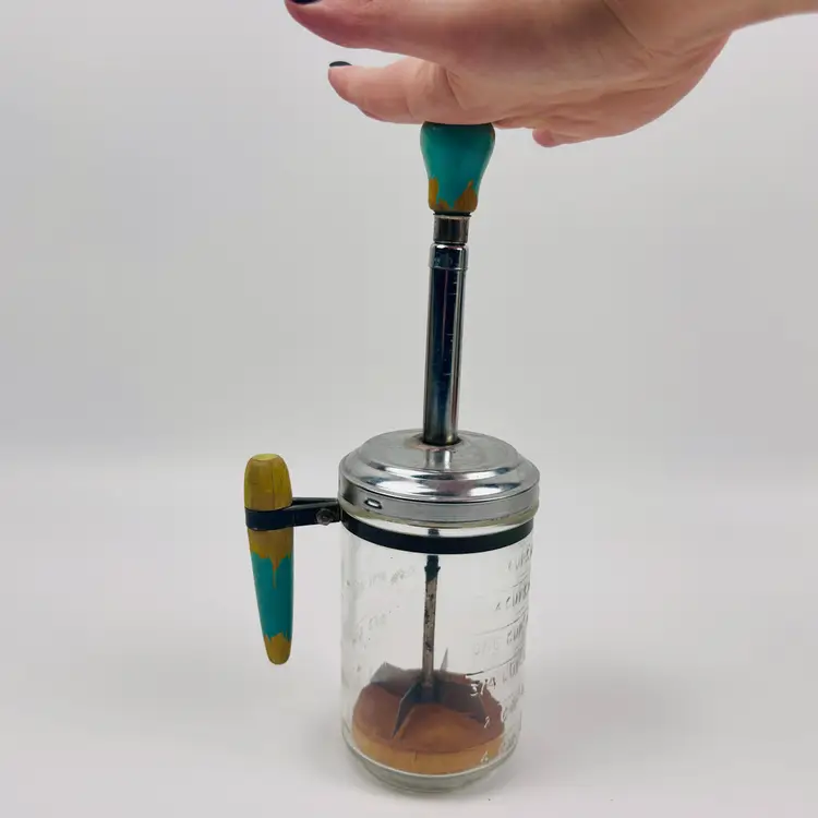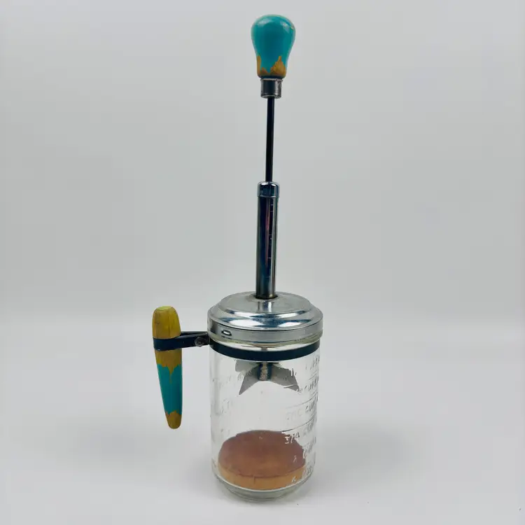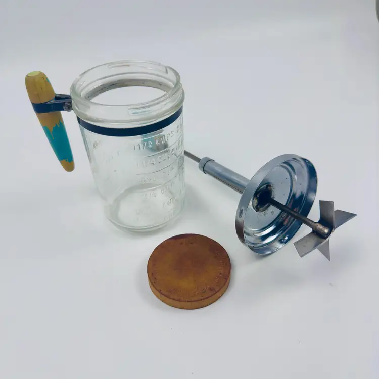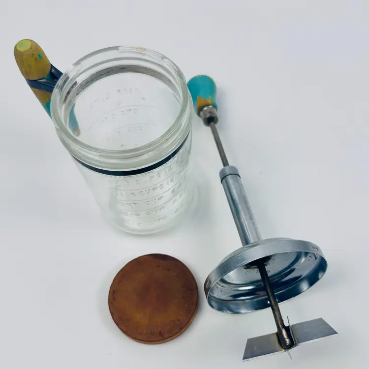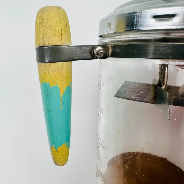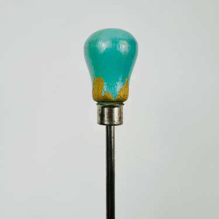 This item is in good vintage condition. No chip or cracks to glass. Moves well. The paint on the wood has worn significantly. Wooden base is darker due to nut oil. See all images for details. Use the zoom feature for a closer look. Measures 12" ball by 4.5" wide with handle. Weighs 15oz