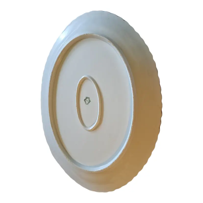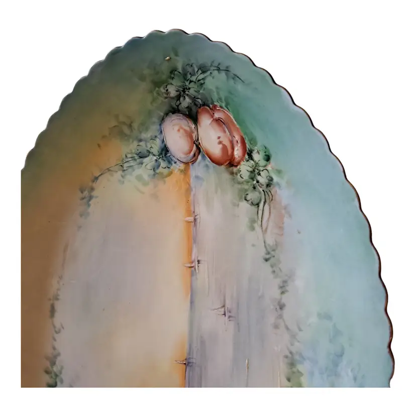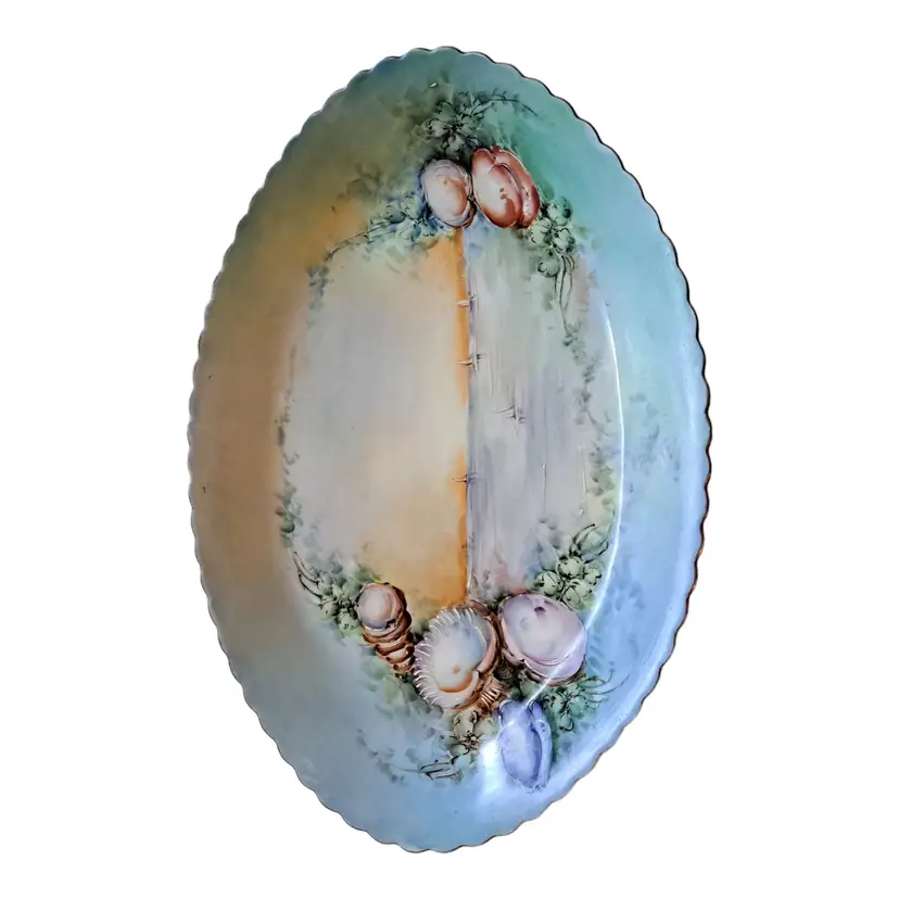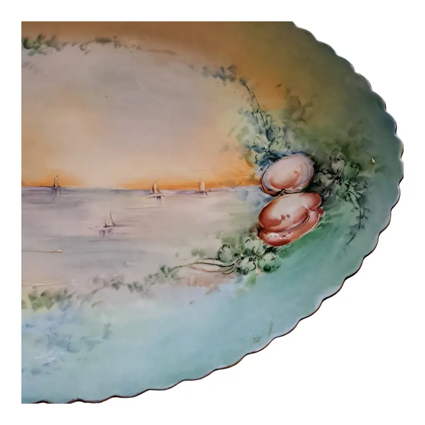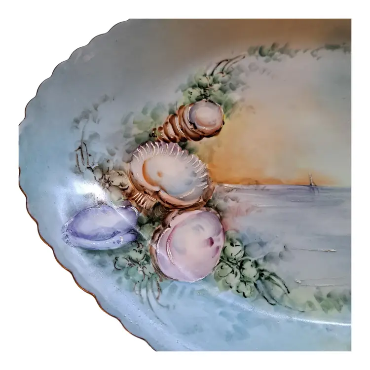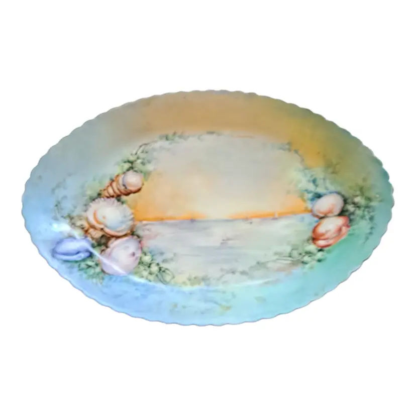 vintage antique porcelain hand painted platter with beach shore and shell scene. no chips or cracks beautiful sunset on the beach 16" wide mermaid pearl coastal sailor sailing seashore