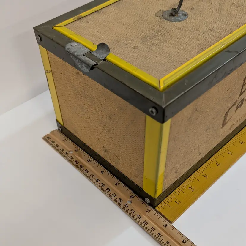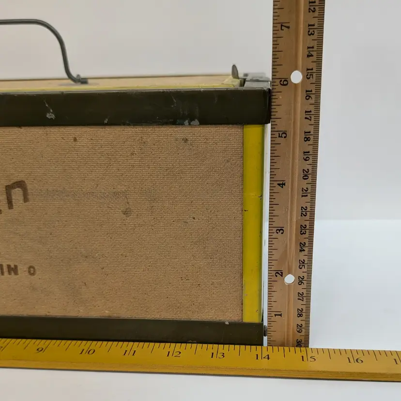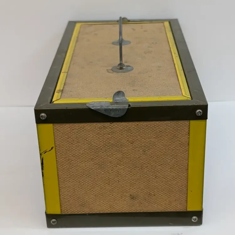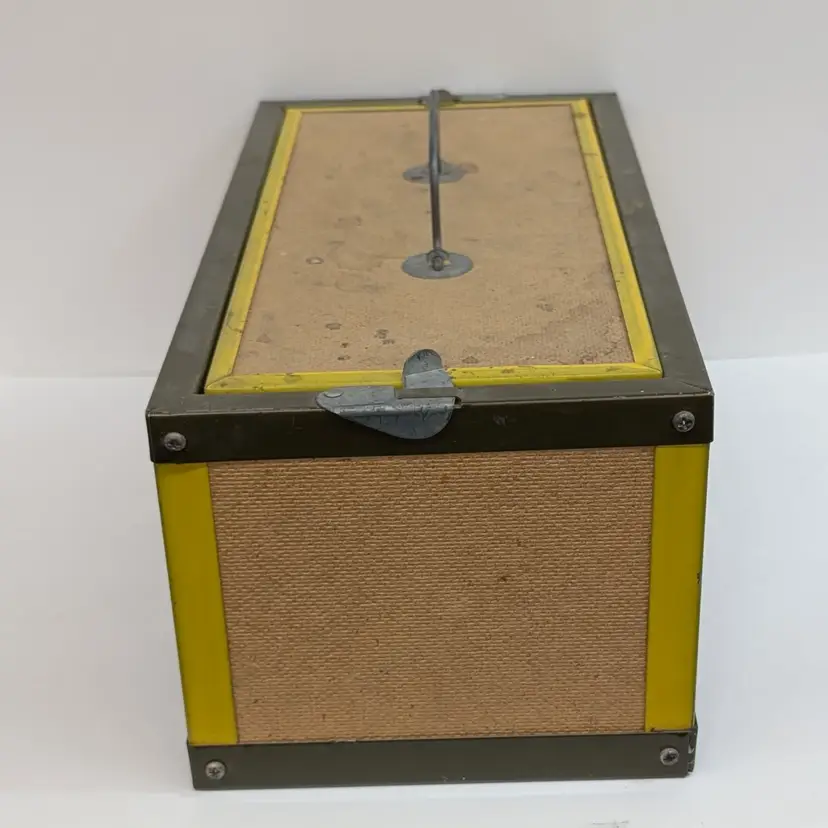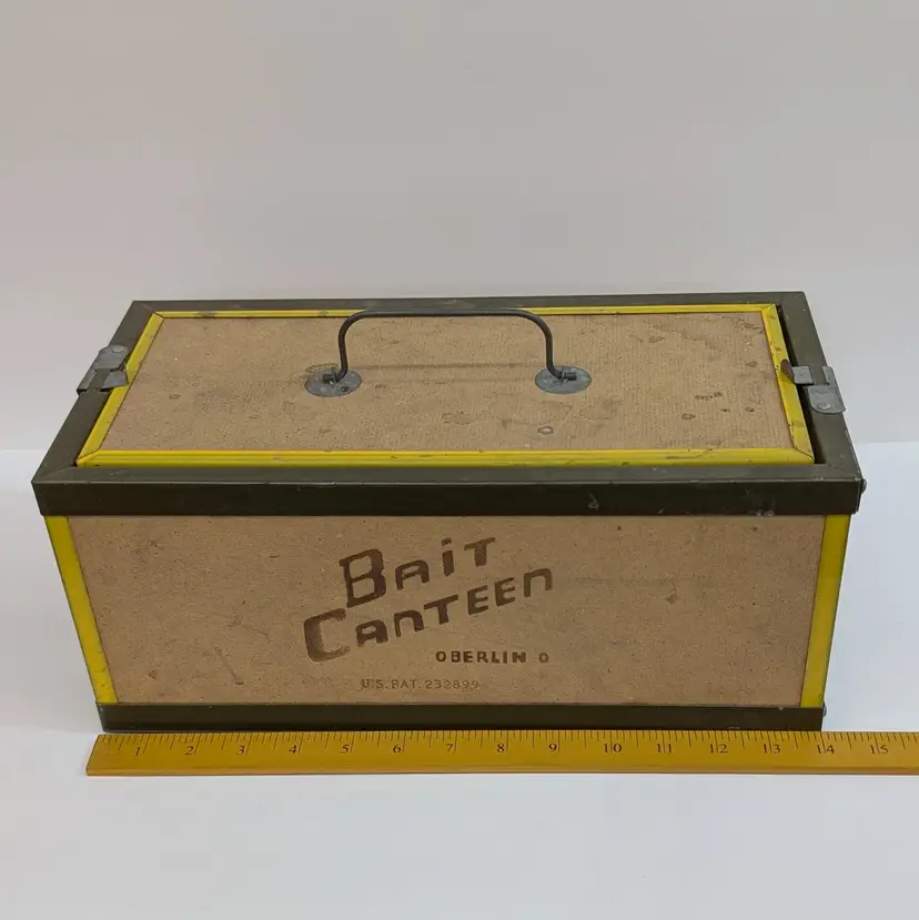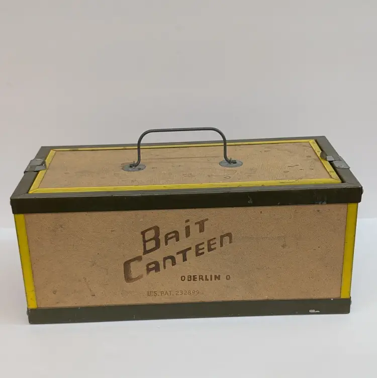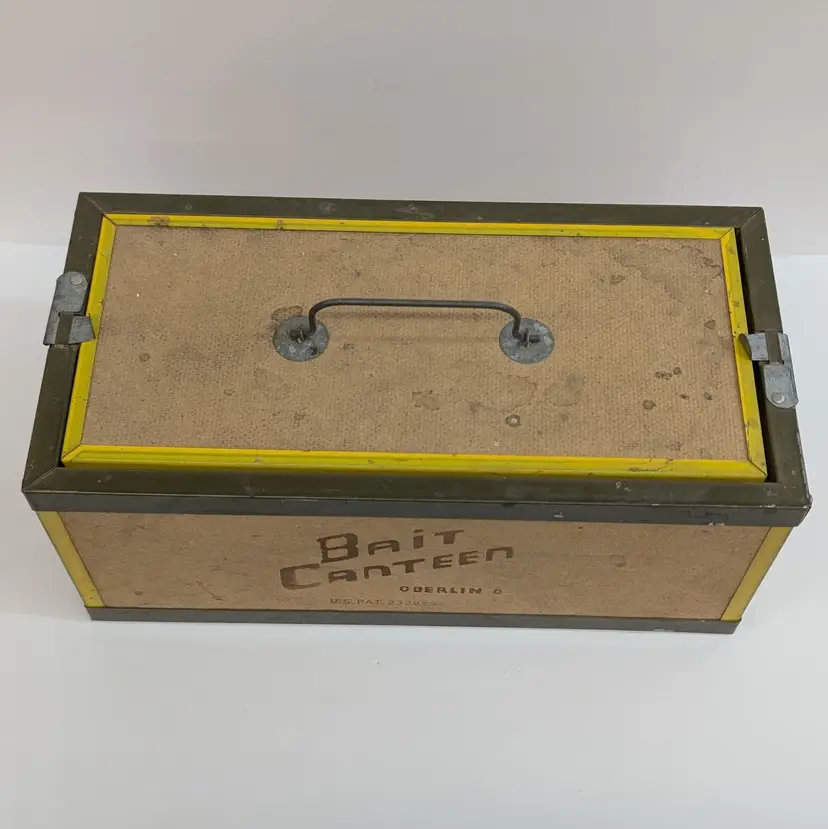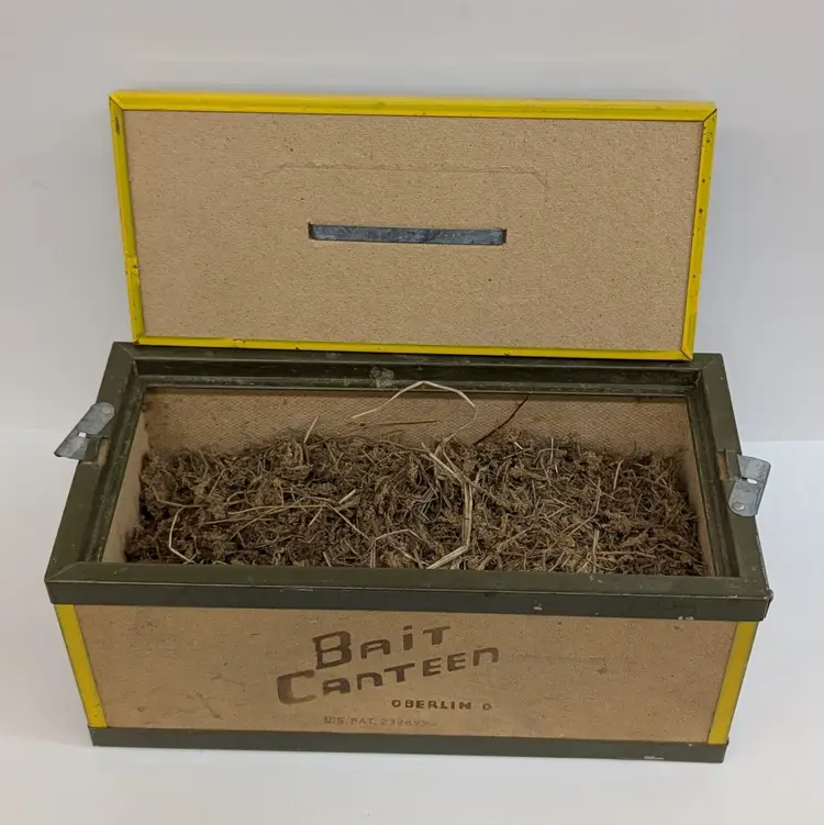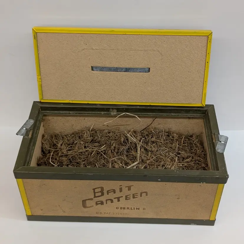 Large bait box from Oberlin. In used vintage condition with some scuffs, water spot and includes moss which may or may not be usable. Measurements ~ 14 x 7 x 6"