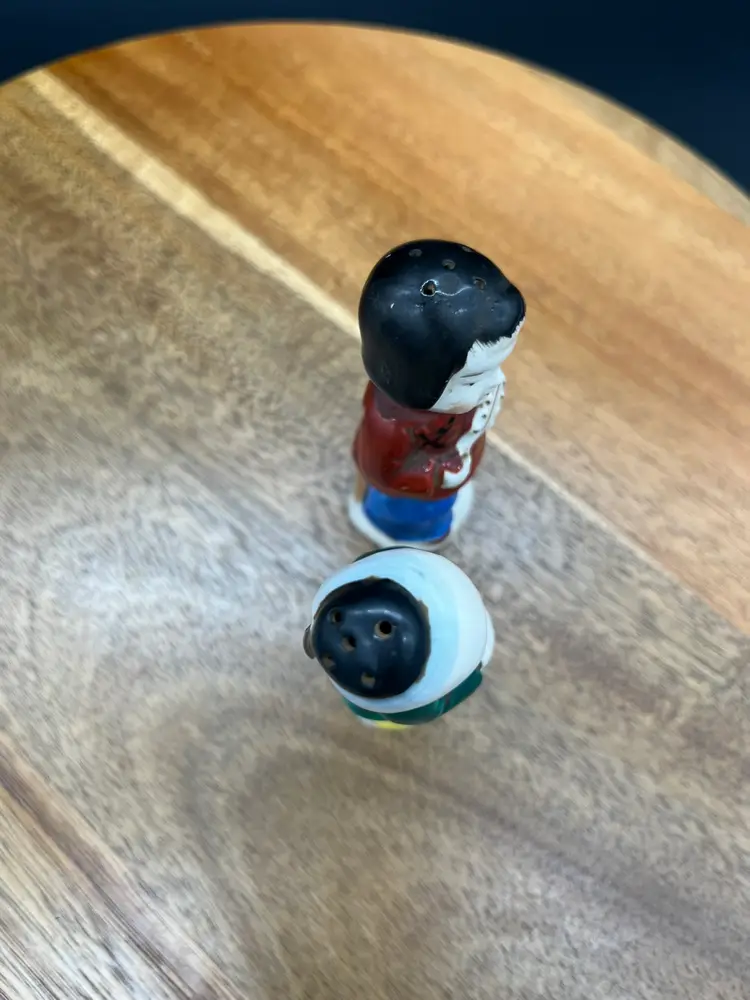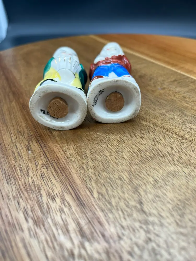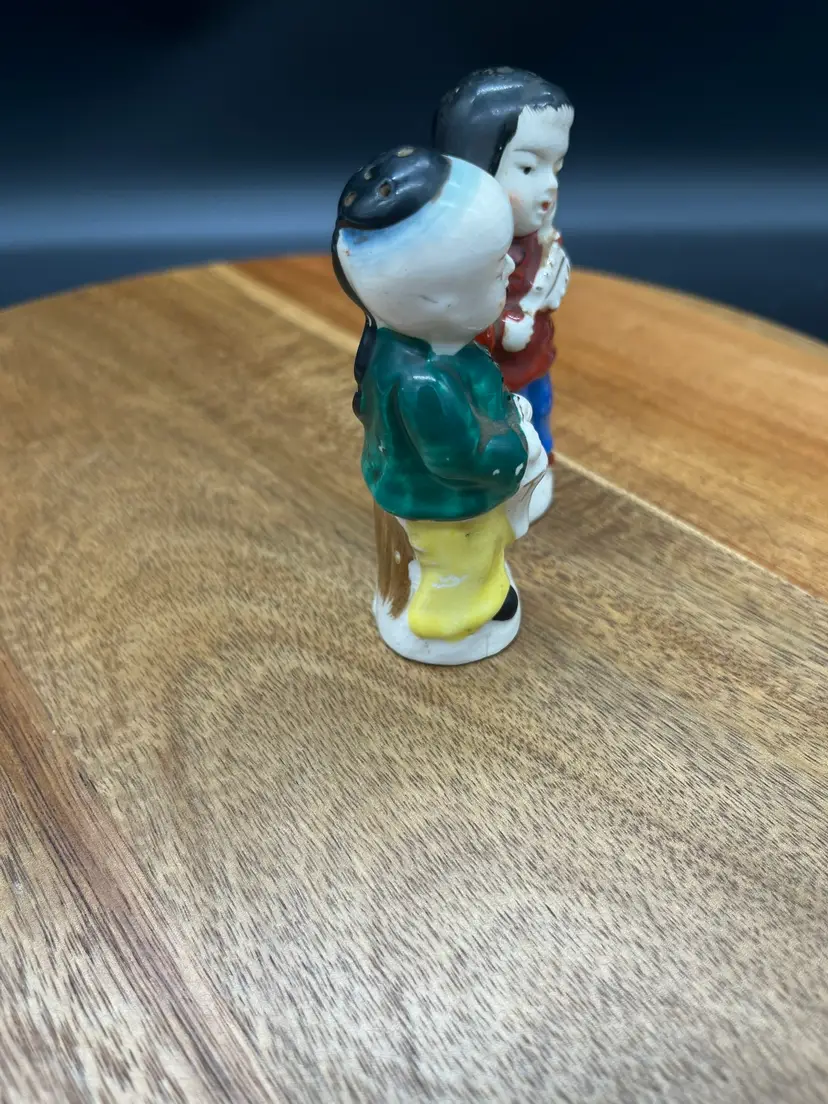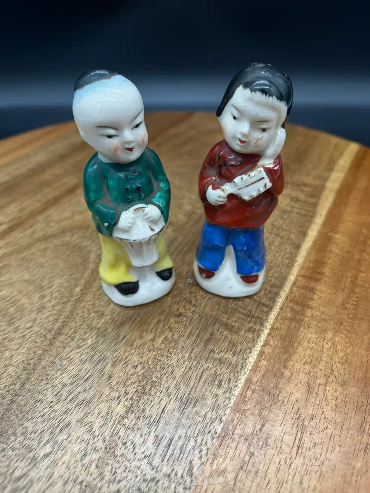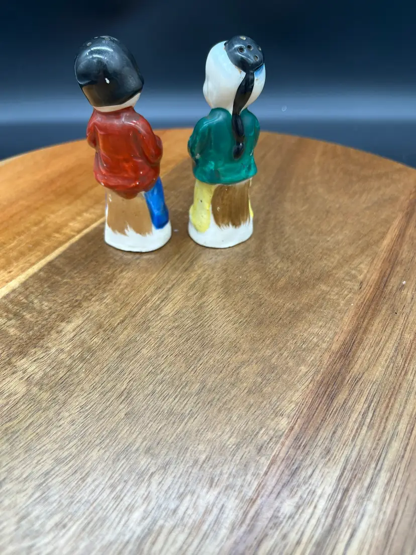 Vintage Occupied Japan Ceramic Asian Figures - Salt & Pepper Shakers Collectible as marked Occupied Japan - circa 1945-1952 Original stoppers intact Japan marked on male, Made in Occupied Japan mark on female. Good vintage condition - no chips or cracks noted, paint fading in spots as expected due to age