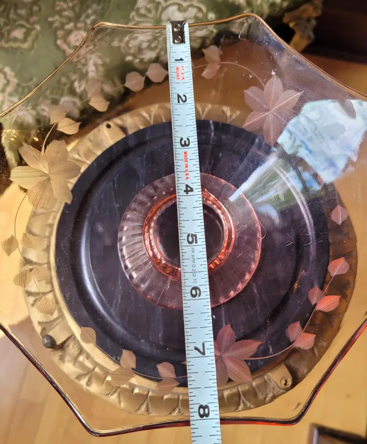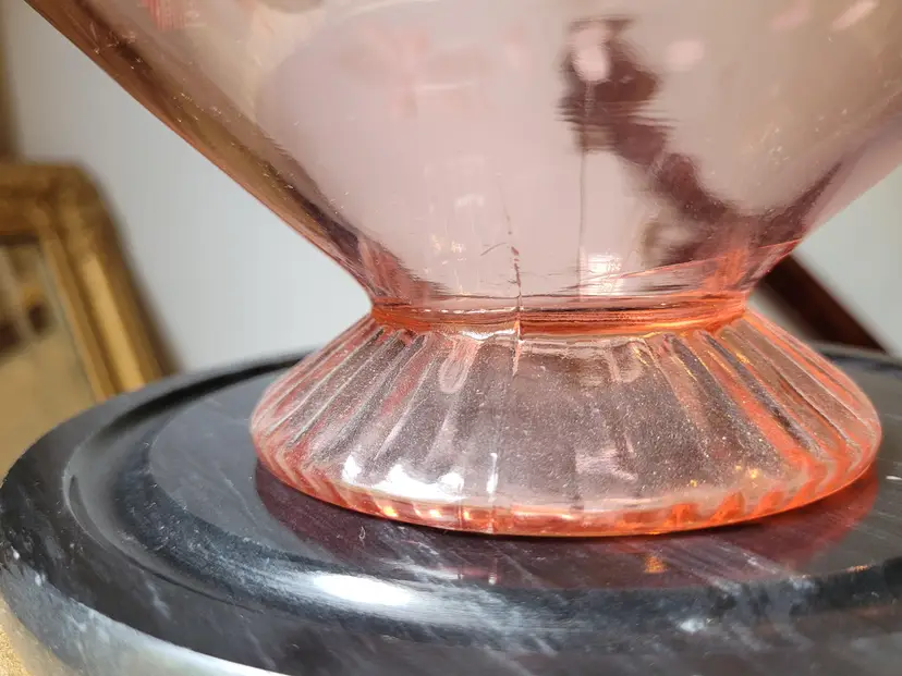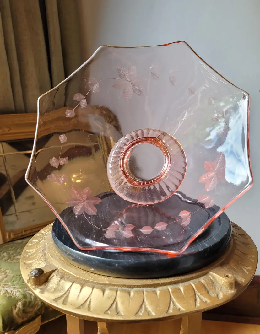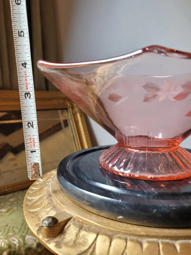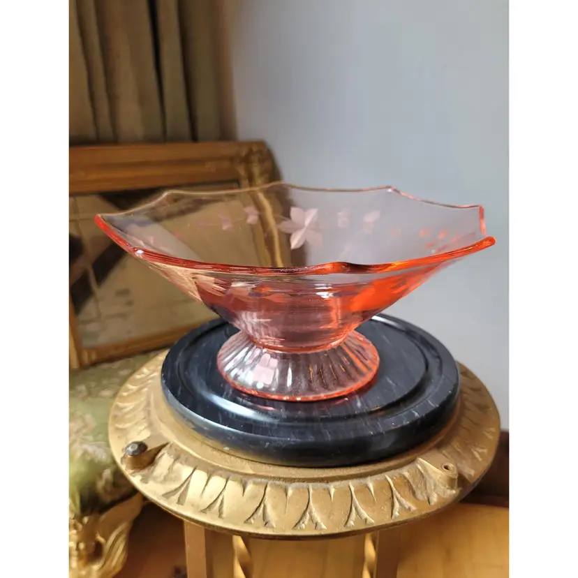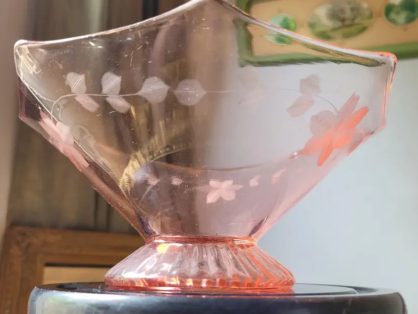 Beautiful etched pink depression glass bowl in a classic art deco octagon shape with delicate floral etchings. This is circa 1920s/30s and in good condition with minor signs of wear. Please see pictures for details and measurements.