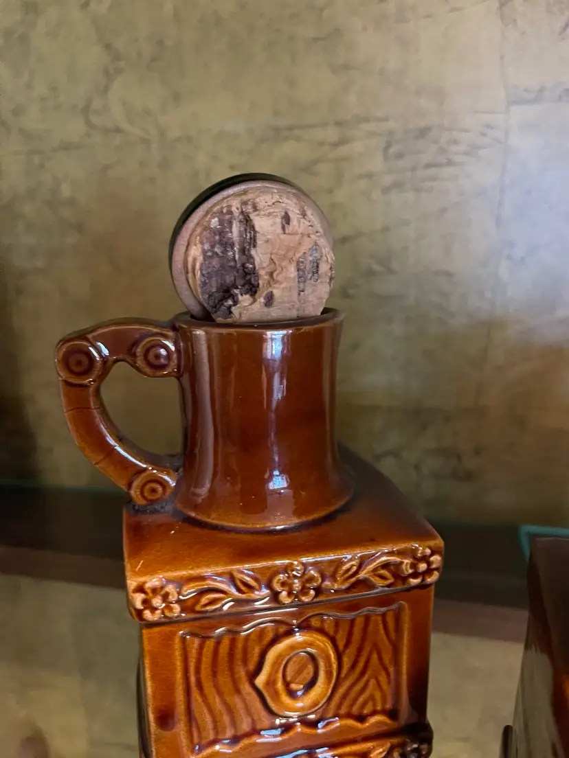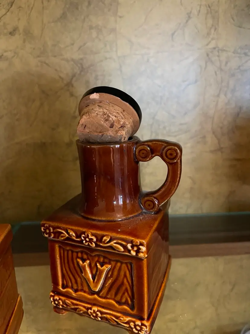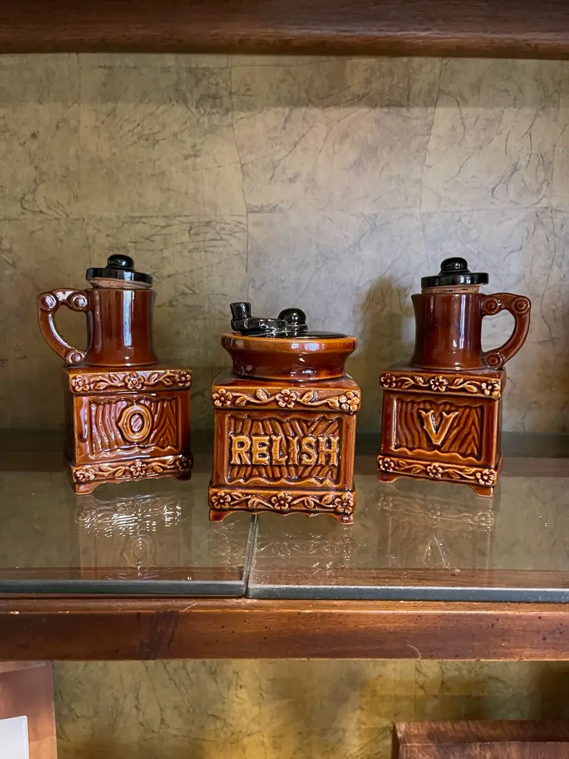 Vintage Ceramic Oil, vinegar, and relish set GVC only due to cork is broken on oil and vinegar bottles, no cracks or flea bites in ceramic O/V 5.5 tall x2.5 wide
