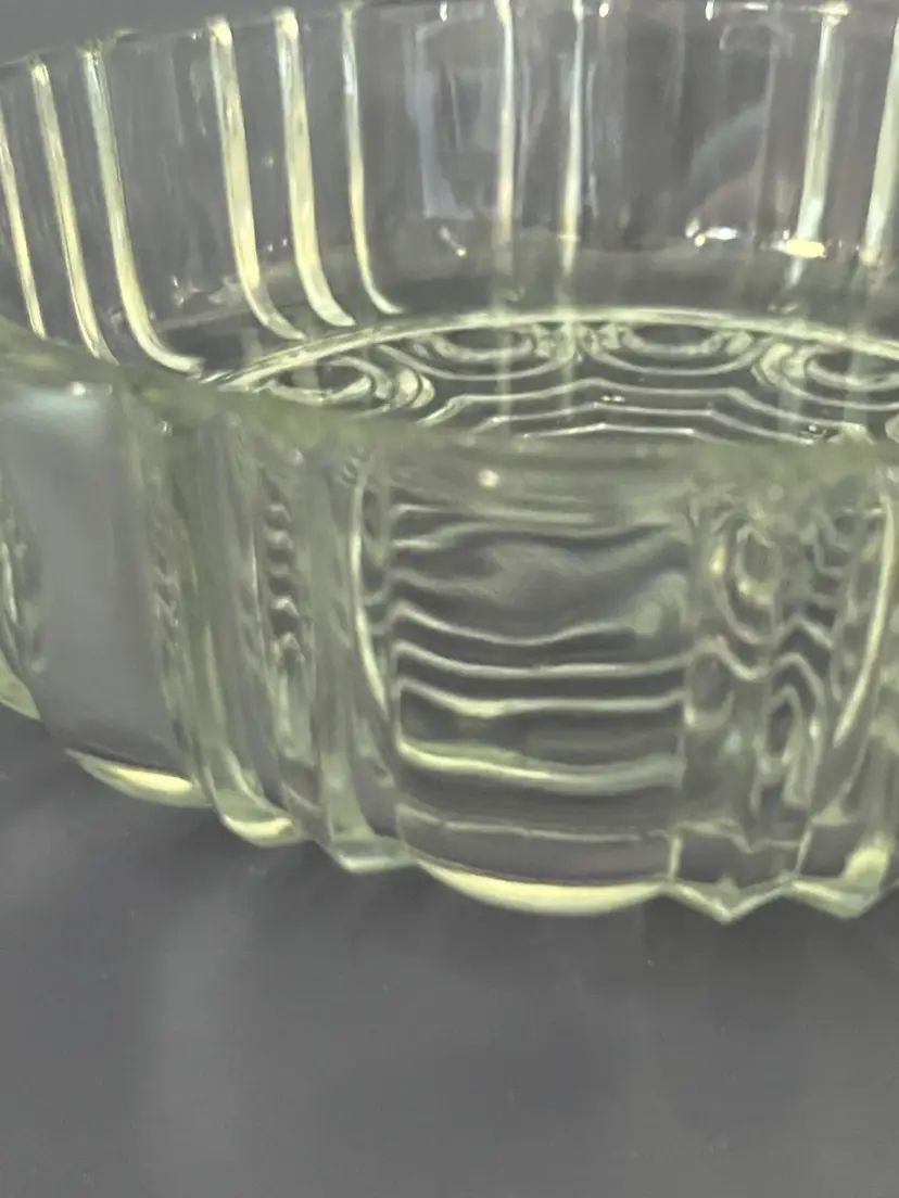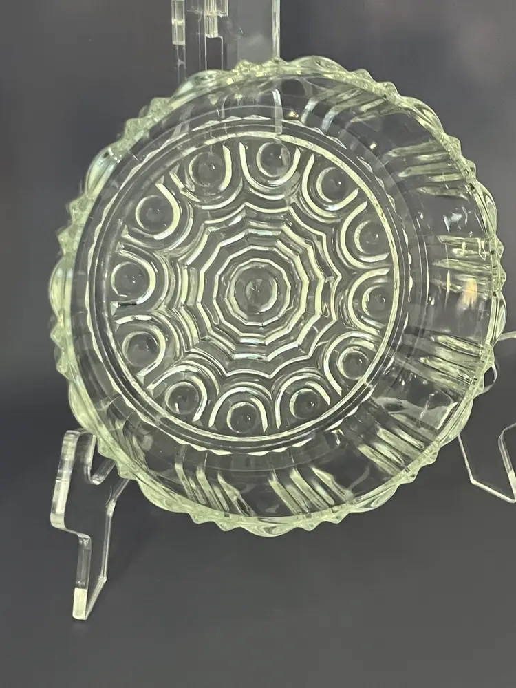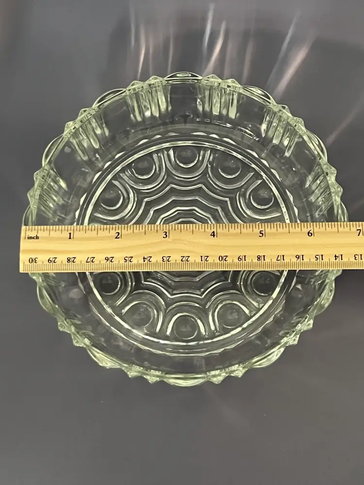 This is a vintage Anchor Hocking Old Cafe pattern clear glass candy dish. This Depression Optic Pat Glass bowl is beautifully made. Hocking produced Old Cafe in clear glass from1936-1940. This candy dish is 7" wide and 5 1/4" tall. It is in excellent condition with no chips or cracks.