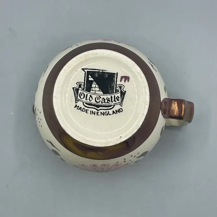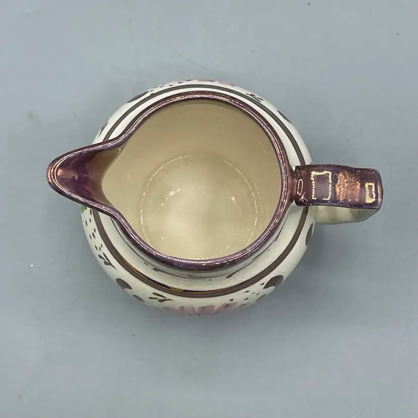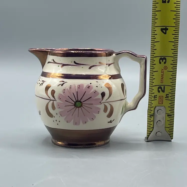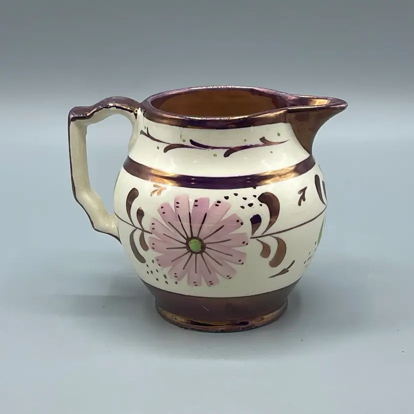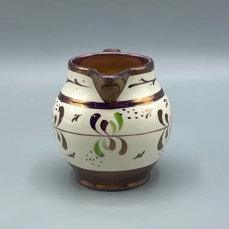 This lovely little creamer is a great example of English copper luster. There are no chips or cracks but there is some wear to the paint. It stands about 3-1/4 inches tall.