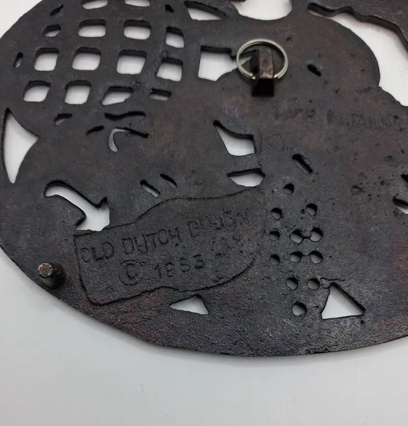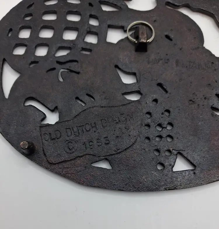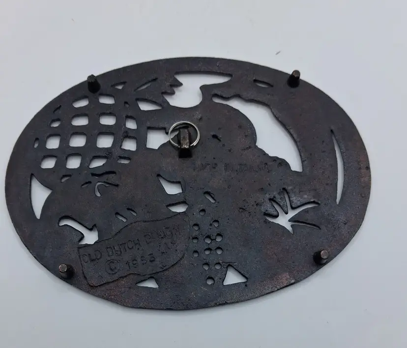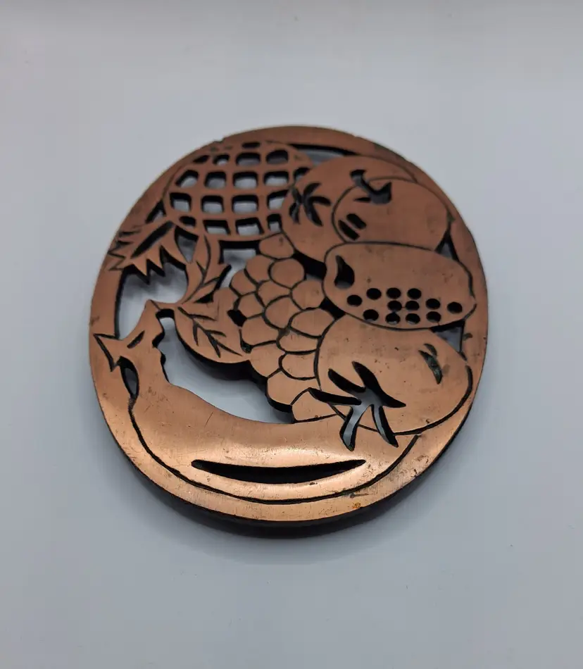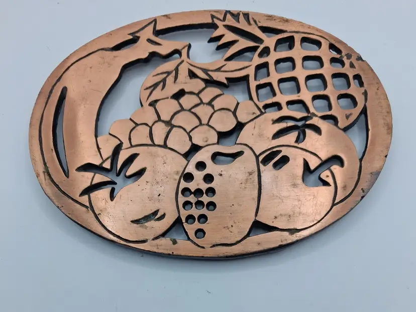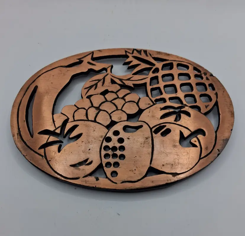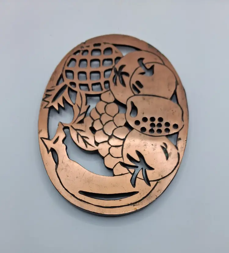 This item is an Old Dutch Design cast iron trivet with a copper-plated finish, featuring a fruit basket motif.