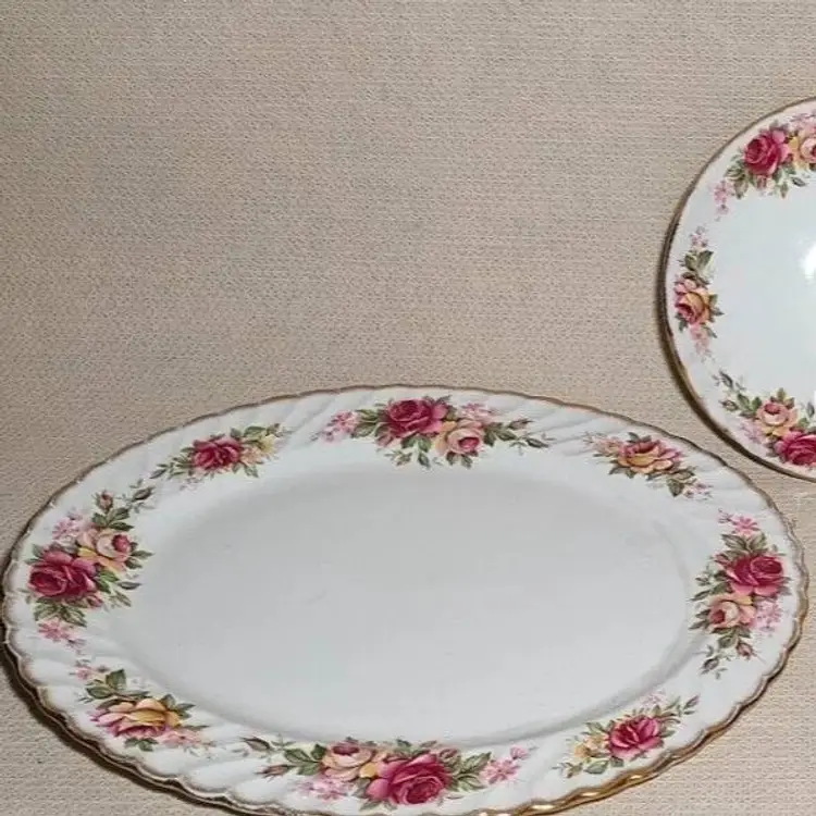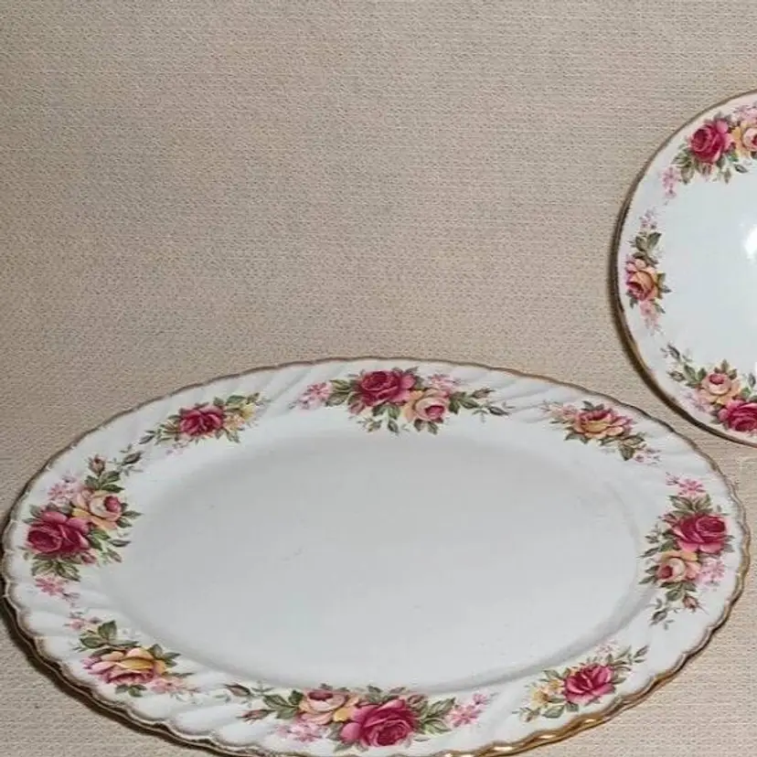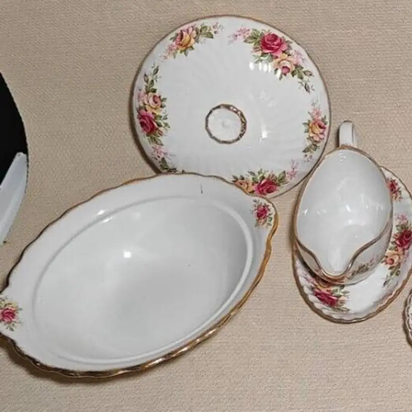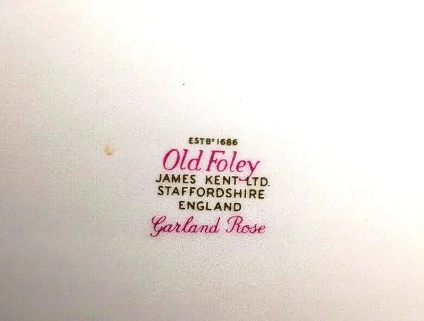📄 Description: This listing features a Vintage 33-piece porcelain dish set from Old Foley by James Kent, made in Staffordshire, England. The elegant Garland Rose pattern showcases pink and red roses with green leaves and gold trim, perfect for collectors or formal dining.