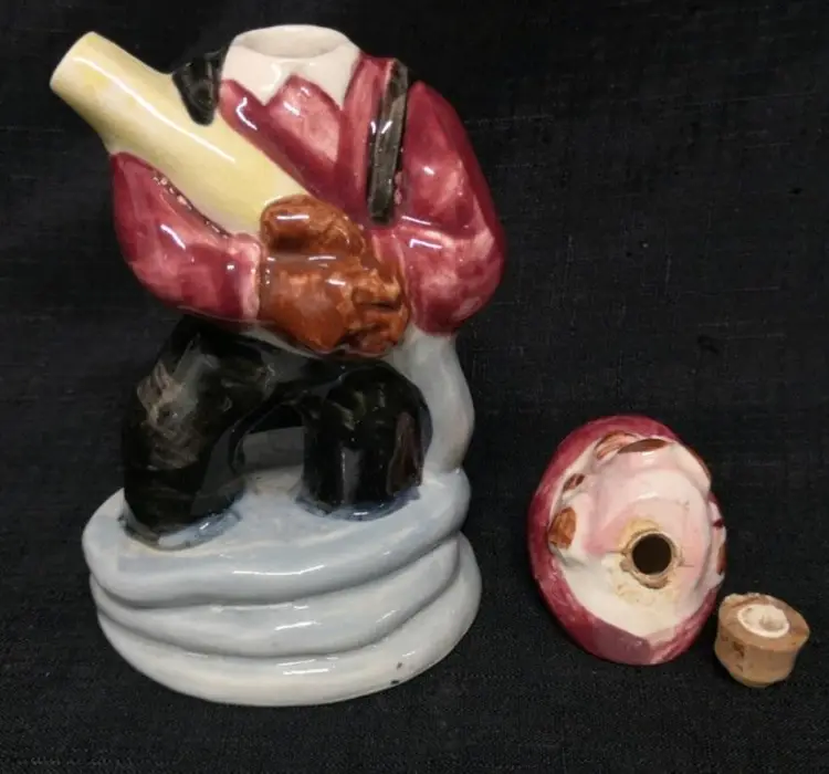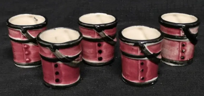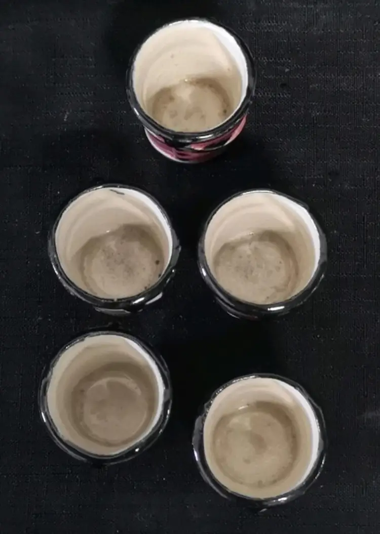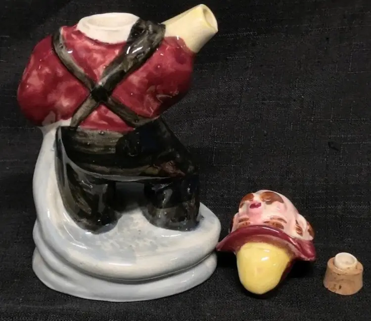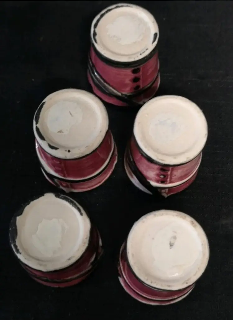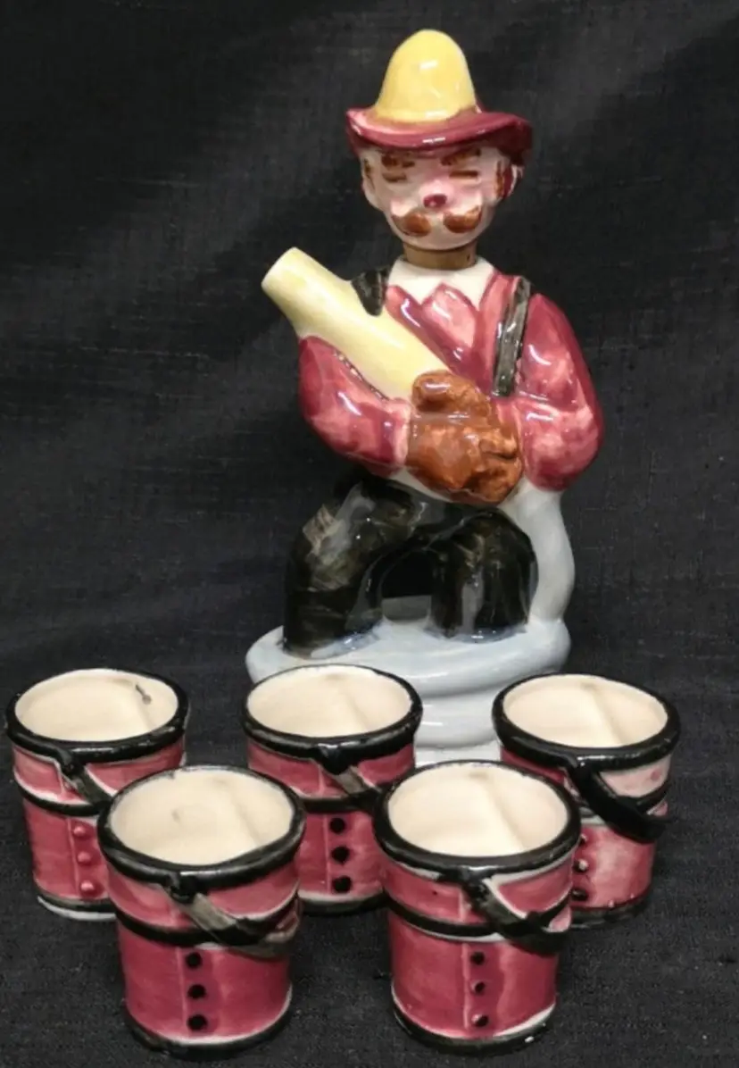 8 inches tall Glasses 2 inches tall Some paint chips on the cups and the decanter head is broken off cork stopper, see photos