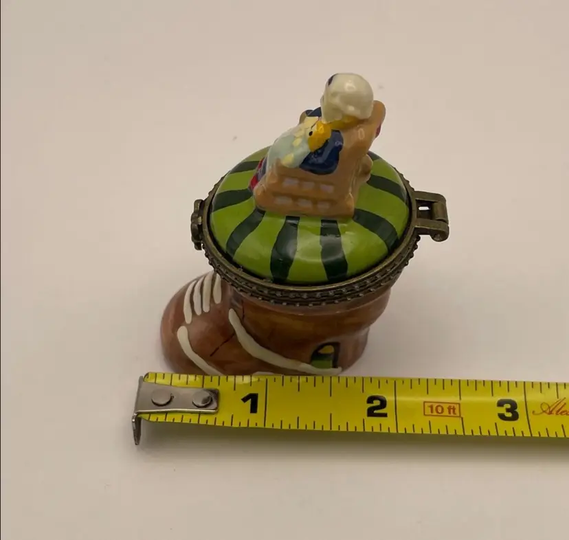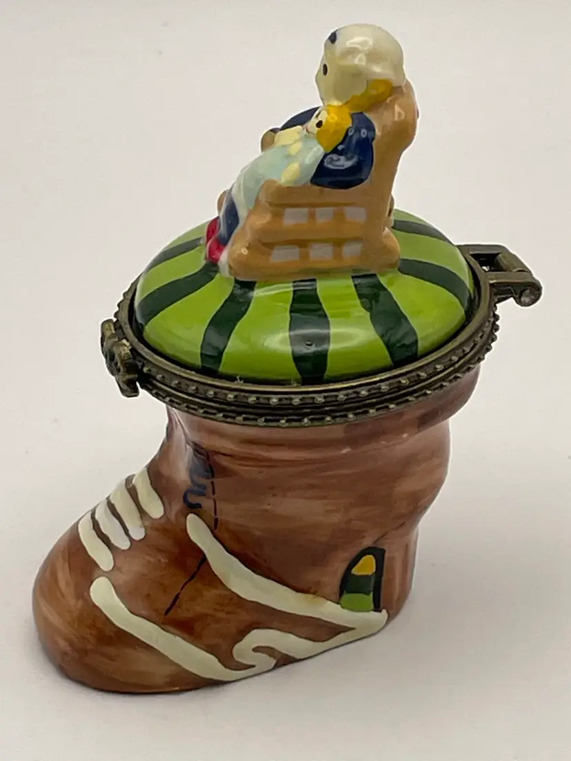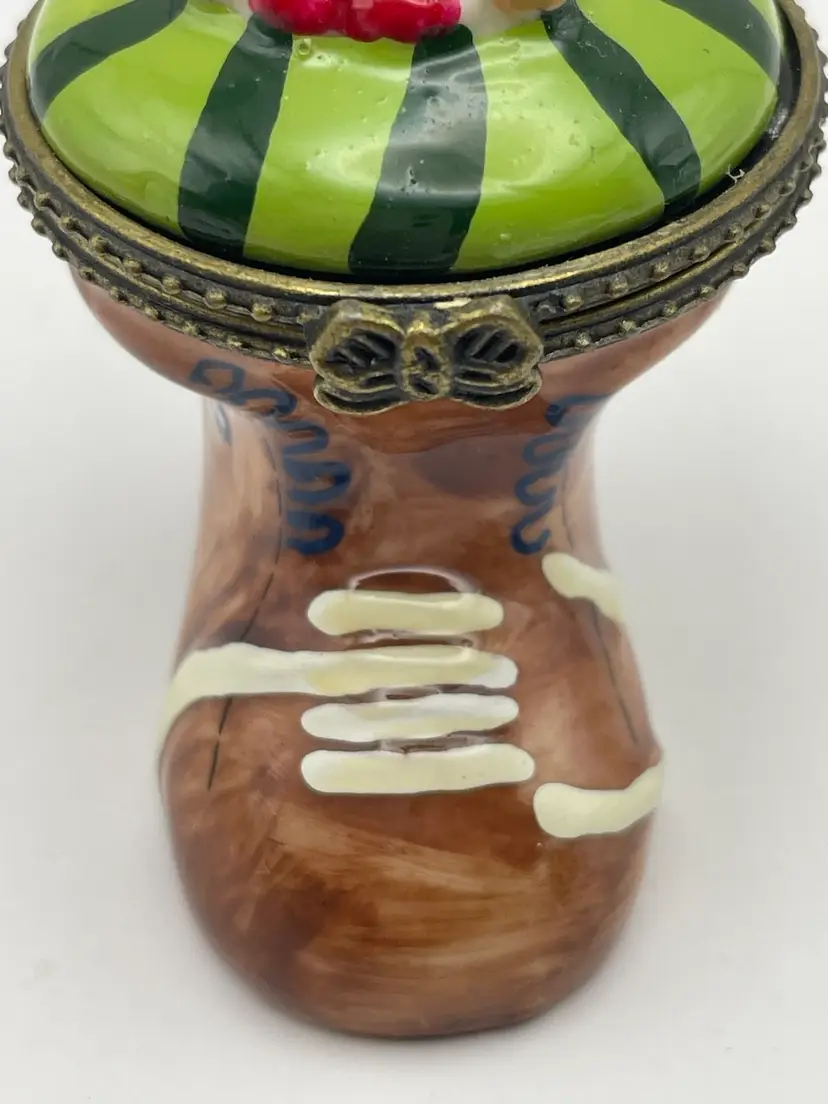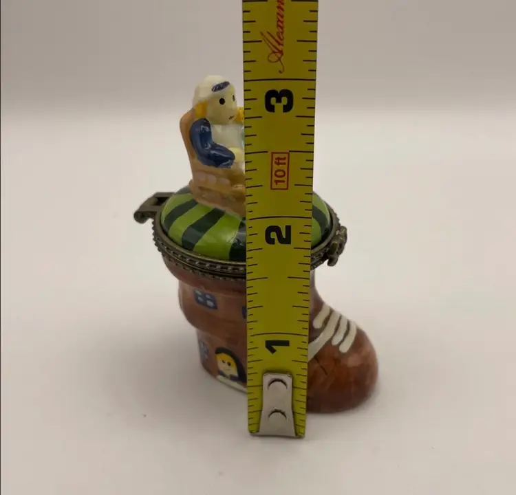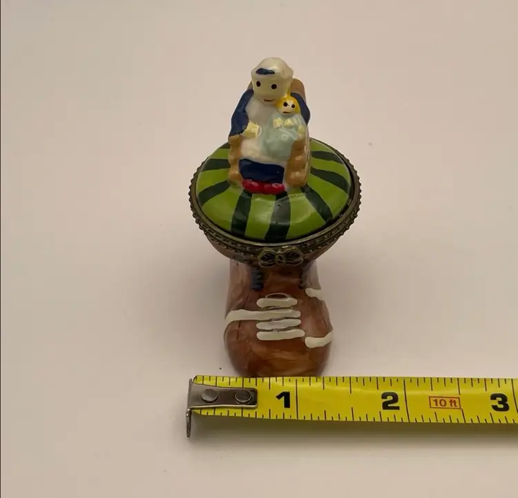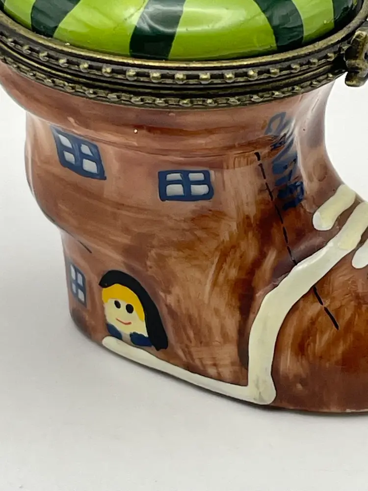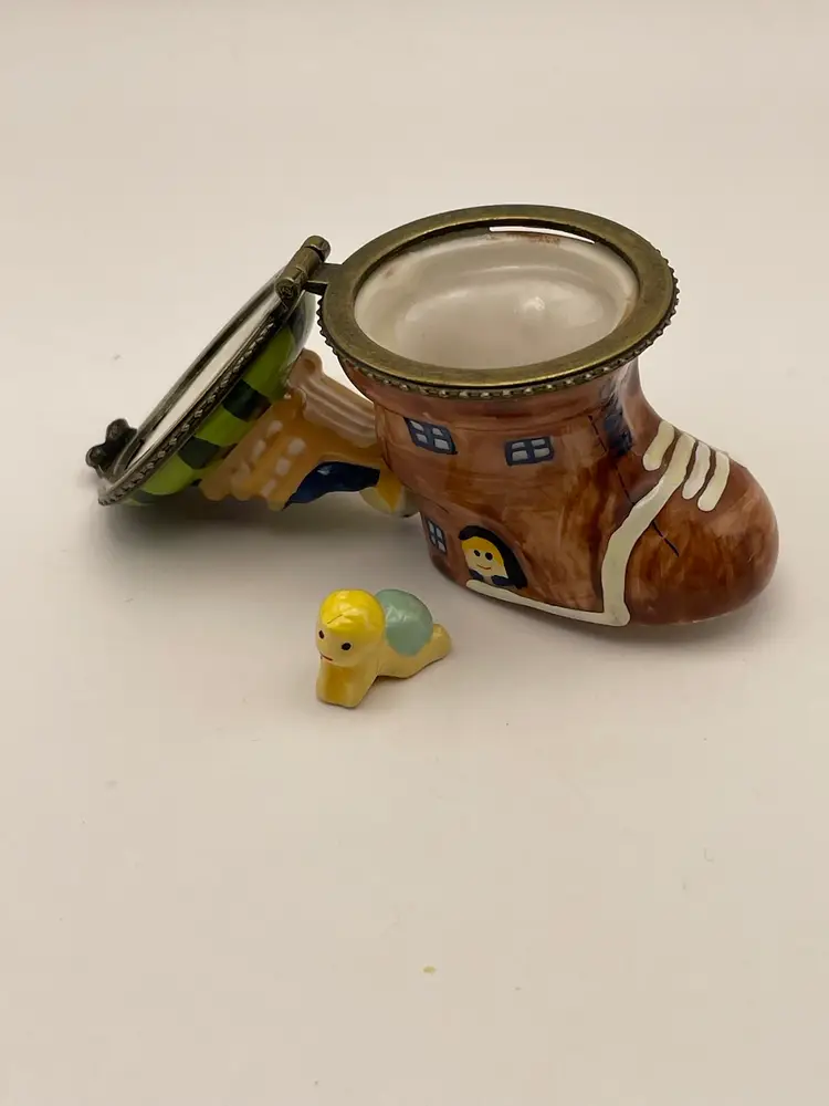 Vintage, “Old Woman Who Lived In A Shoe”, Ceramic, Hinged Trinket Box with Miniature Baby (Slight gap under ring, as shown)
