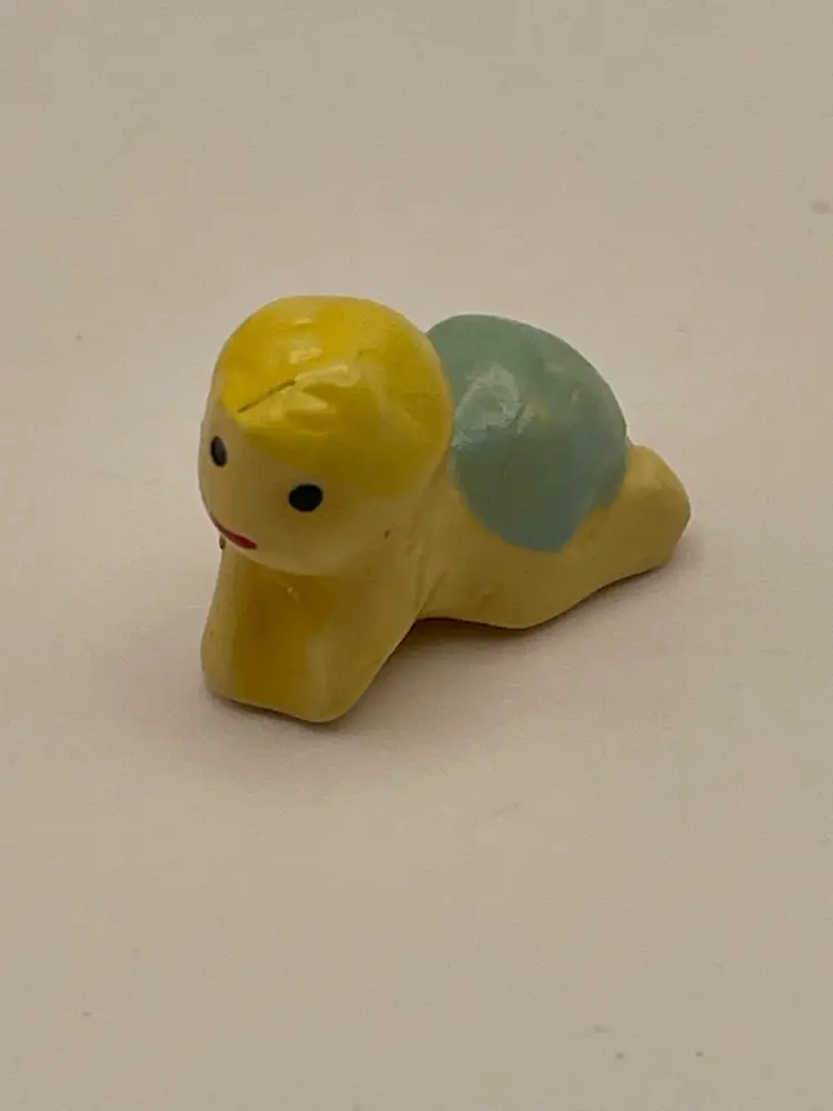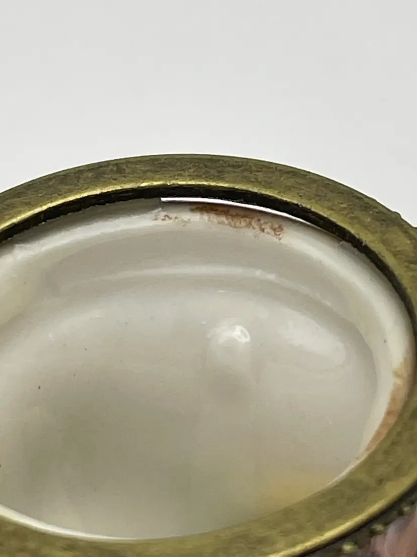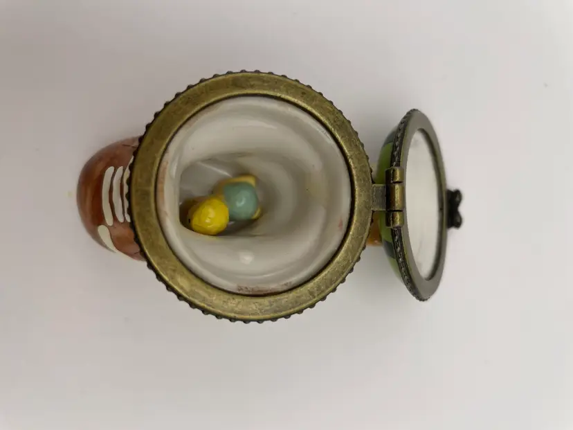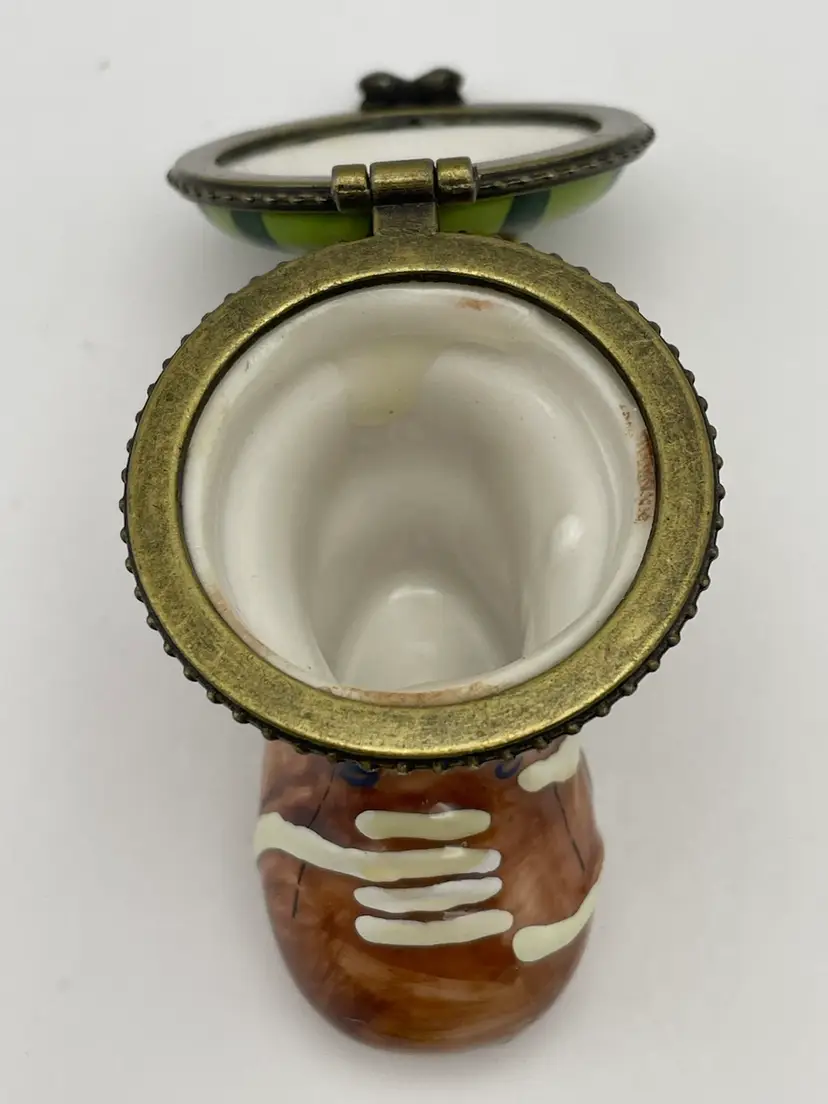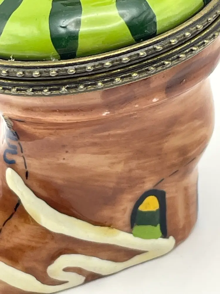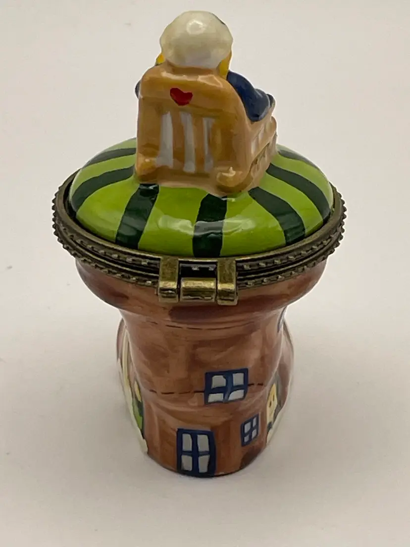 Vintage, “Old Woman Who Lived In A Shoe”, Ceramic, Hinged Trinket Box with Miniature Baby (Slight gap under ring, as shown)