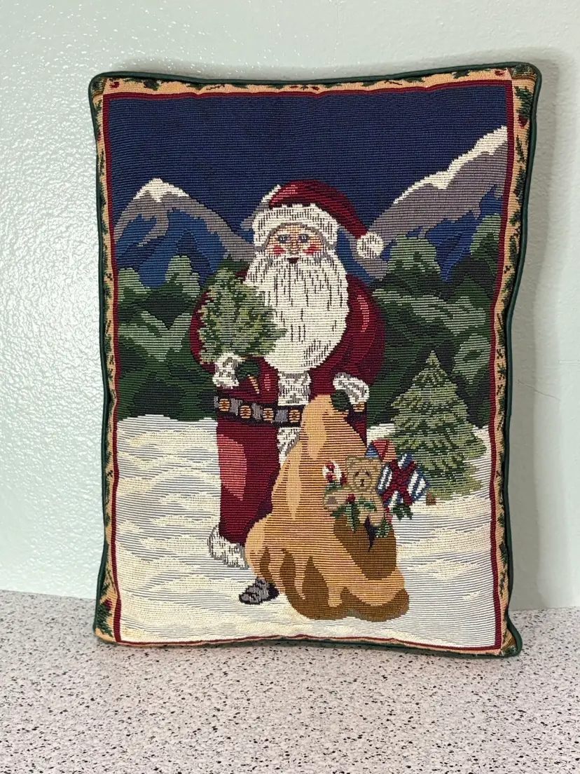 charming woven throw pillow. Featuring a classic, rich tapestry design, this pillow depicts a cheerful St. Nicholas fresh from a snowy expedition, carrying a large evergreen tree and a sack filled with children's toys. The front is an excellent condition, the back right corner that shows a little bit of a water ring.