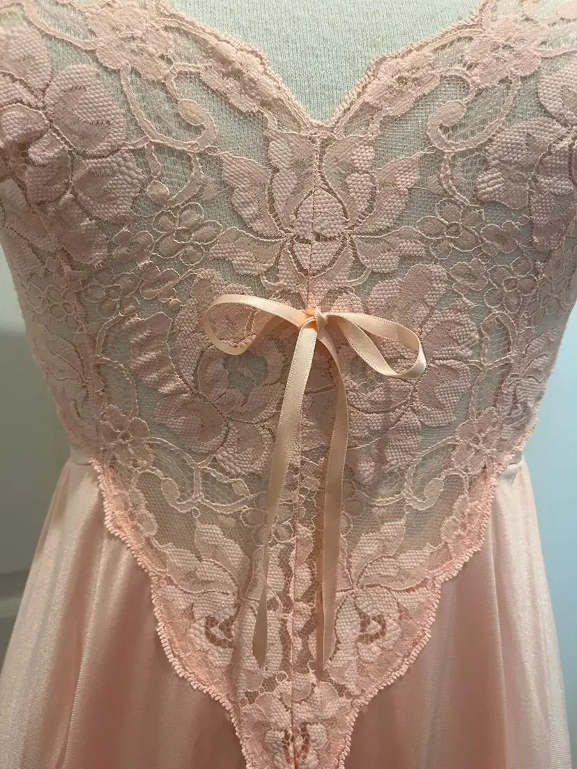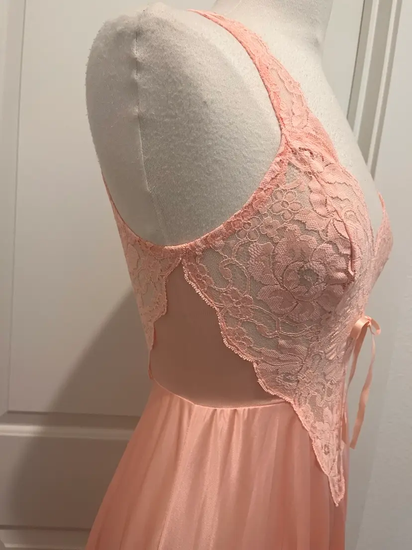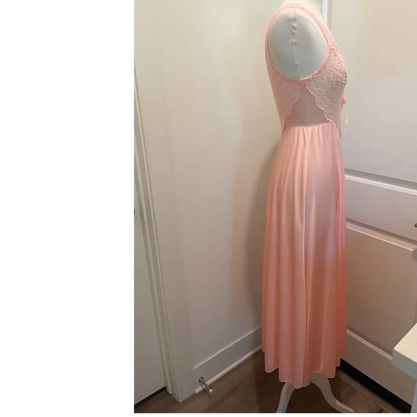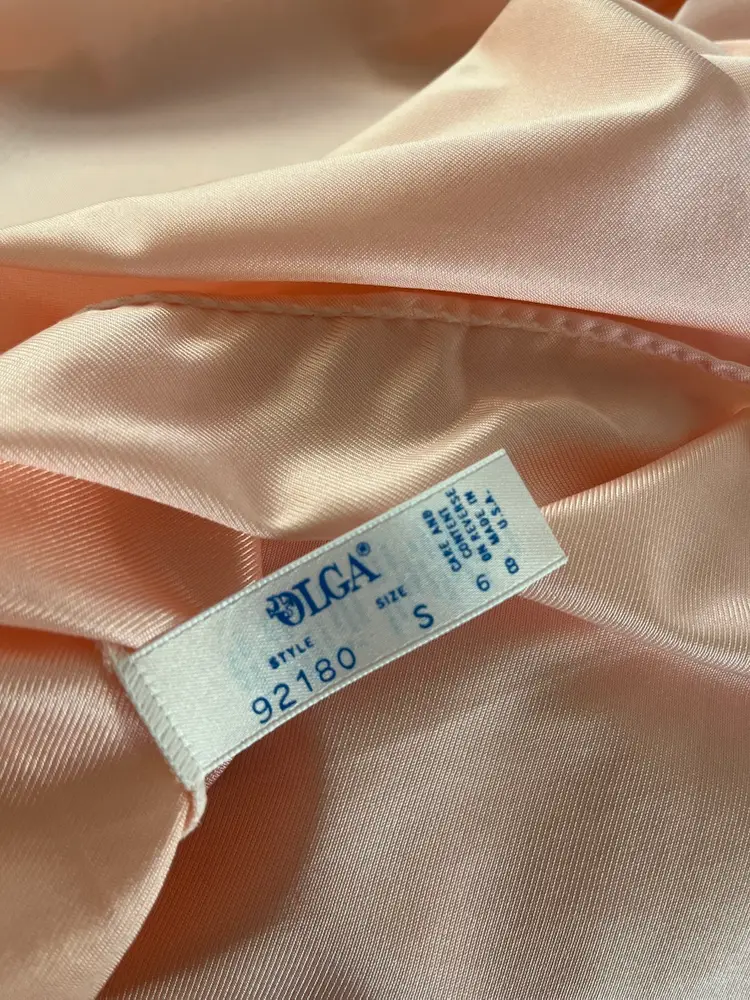 New without tags, full sweep peach color nightgown, pull over, scalloped lace, machine was gentle, made in USA. Vintage Olga Peach Full Sweep Nightgown Lace Detail Style 92180 Size S NEW USA. chest: 28"waist: 22"length: 51-1/2"