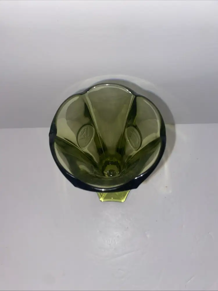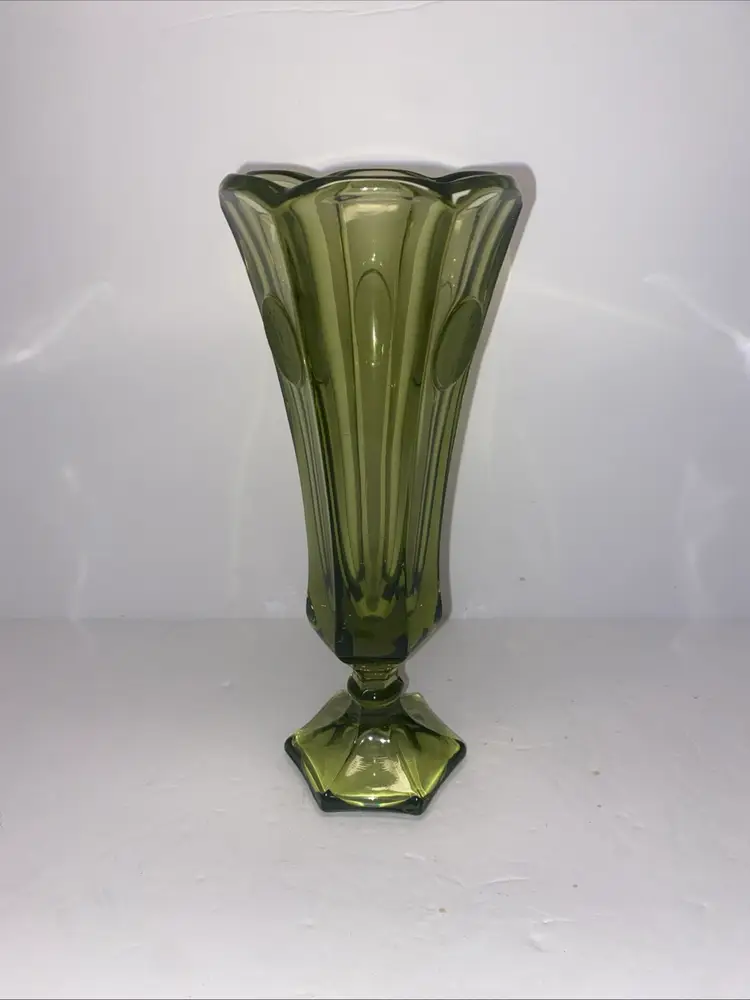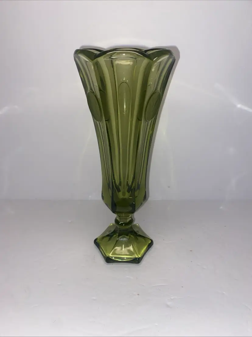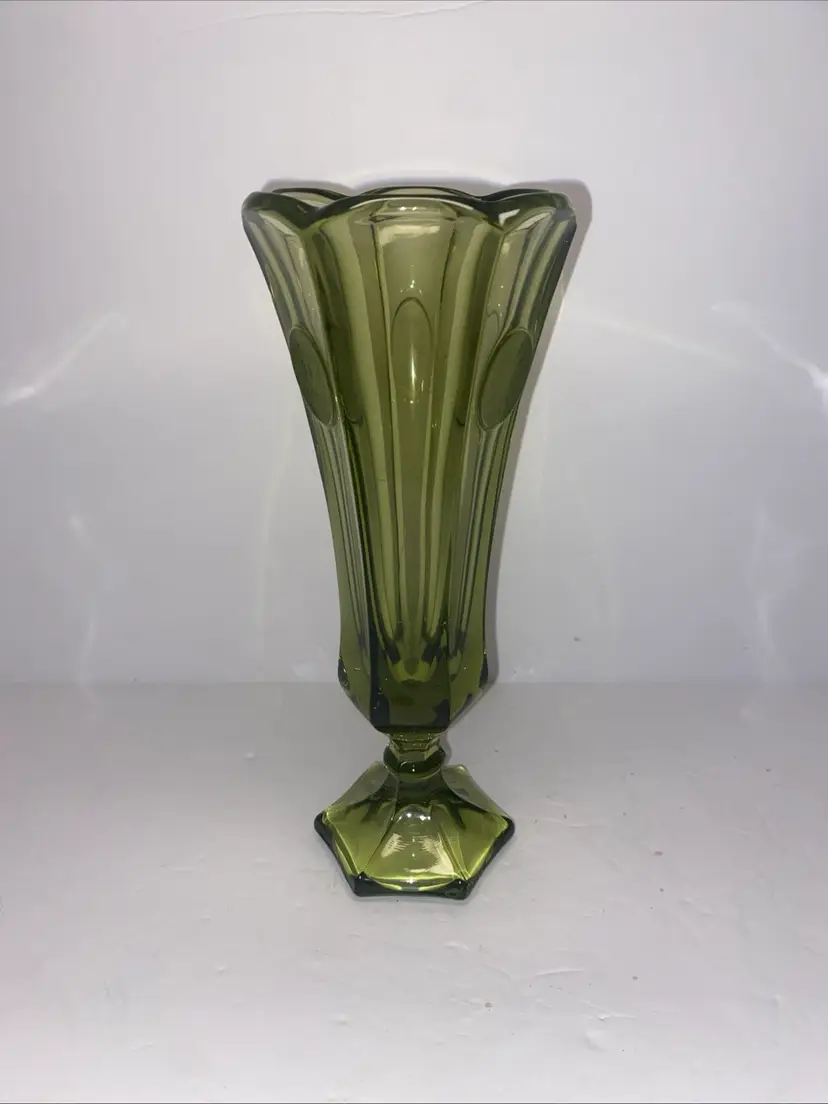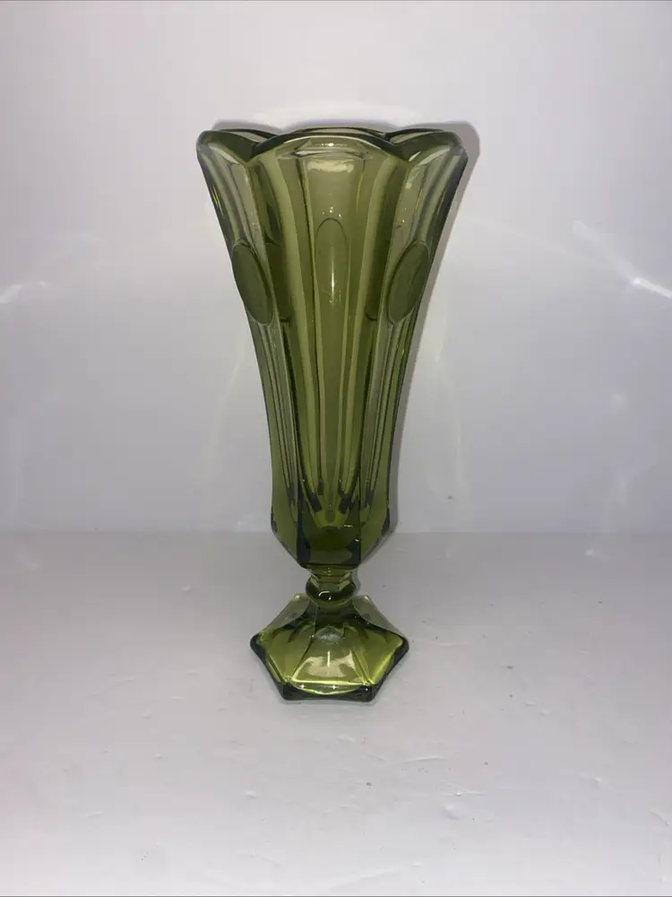 This vintage Olive Green Fostoria glass vase features the Coin Pattern, making it a unique and charming decorative piece for any space. No chips no cracks.