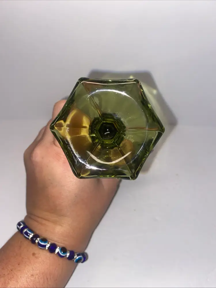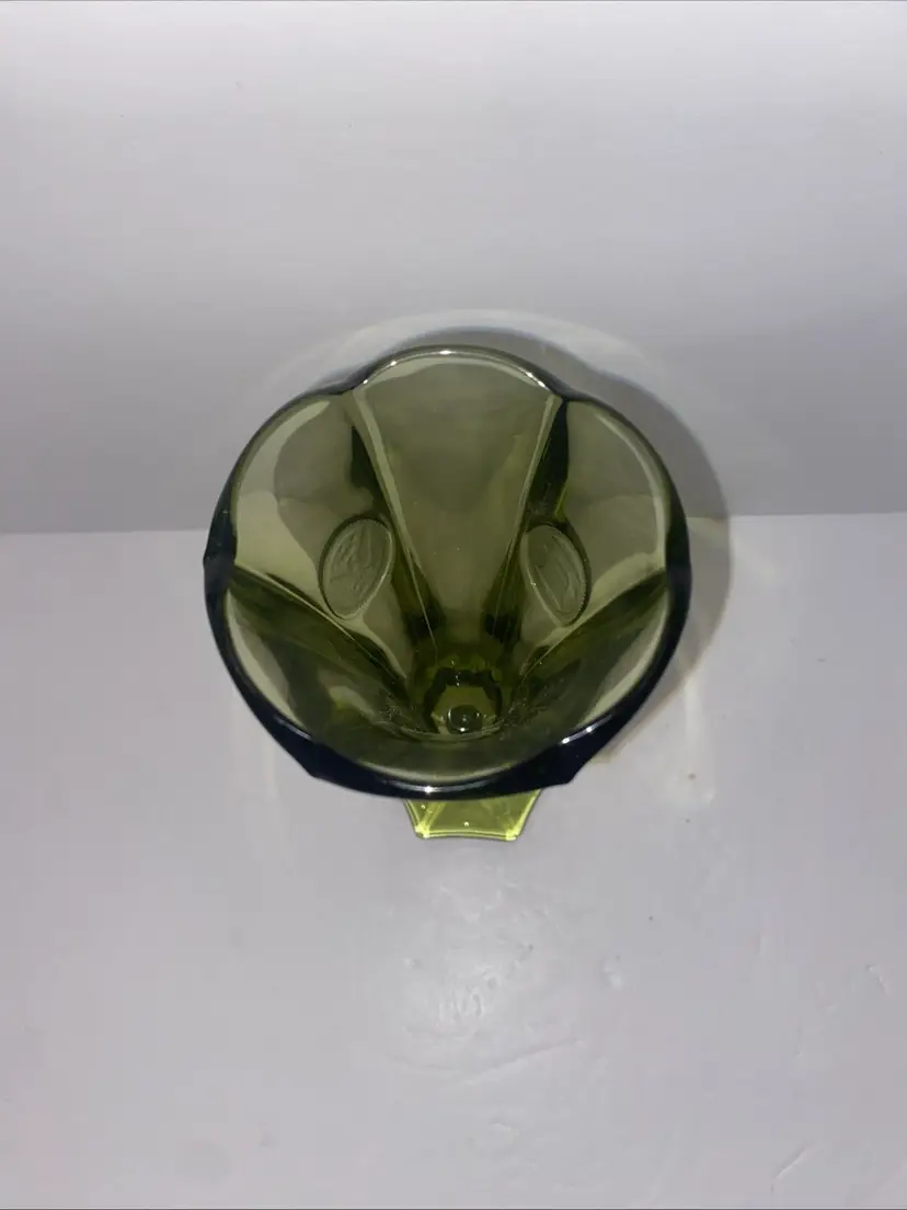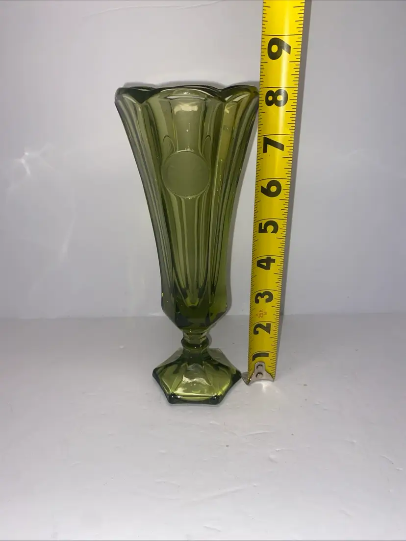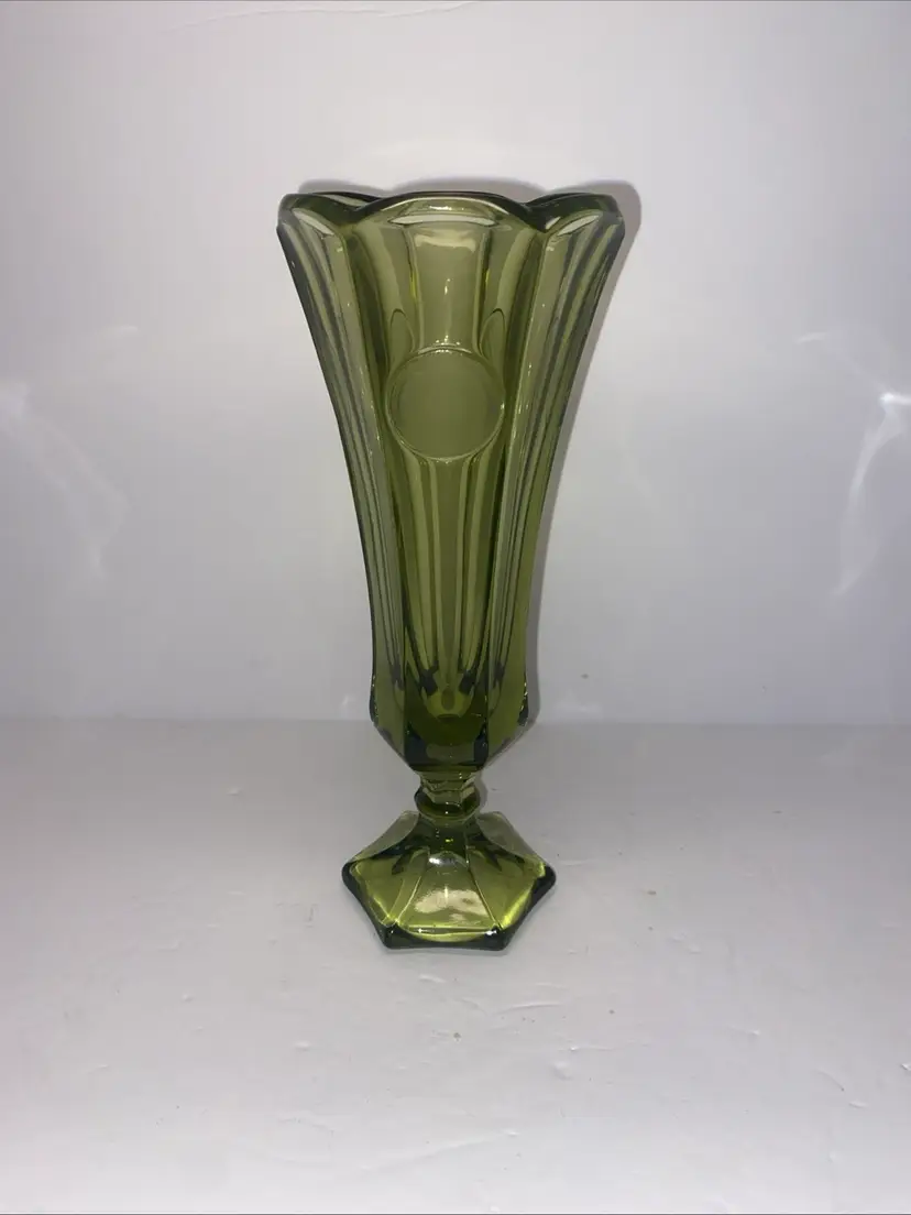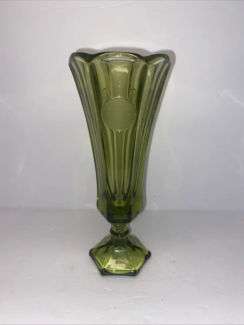 This vintage Olive Green Fostoria glass vase features the Coin Pattern, making it a unique and charming decorative piece for any space. No chips no cracks.